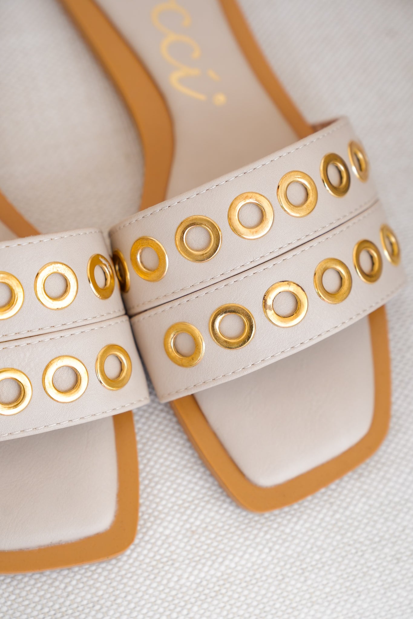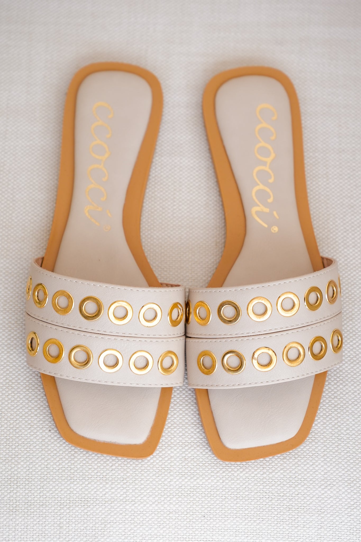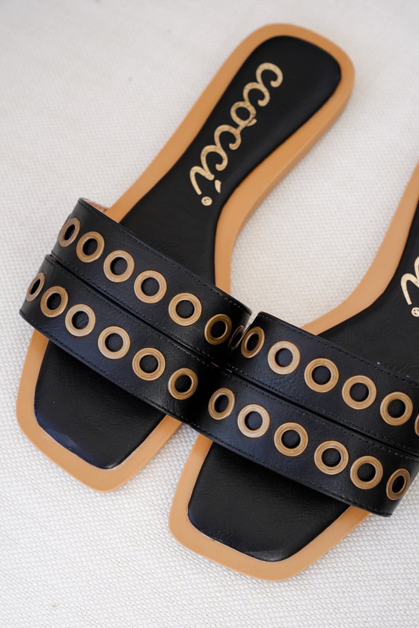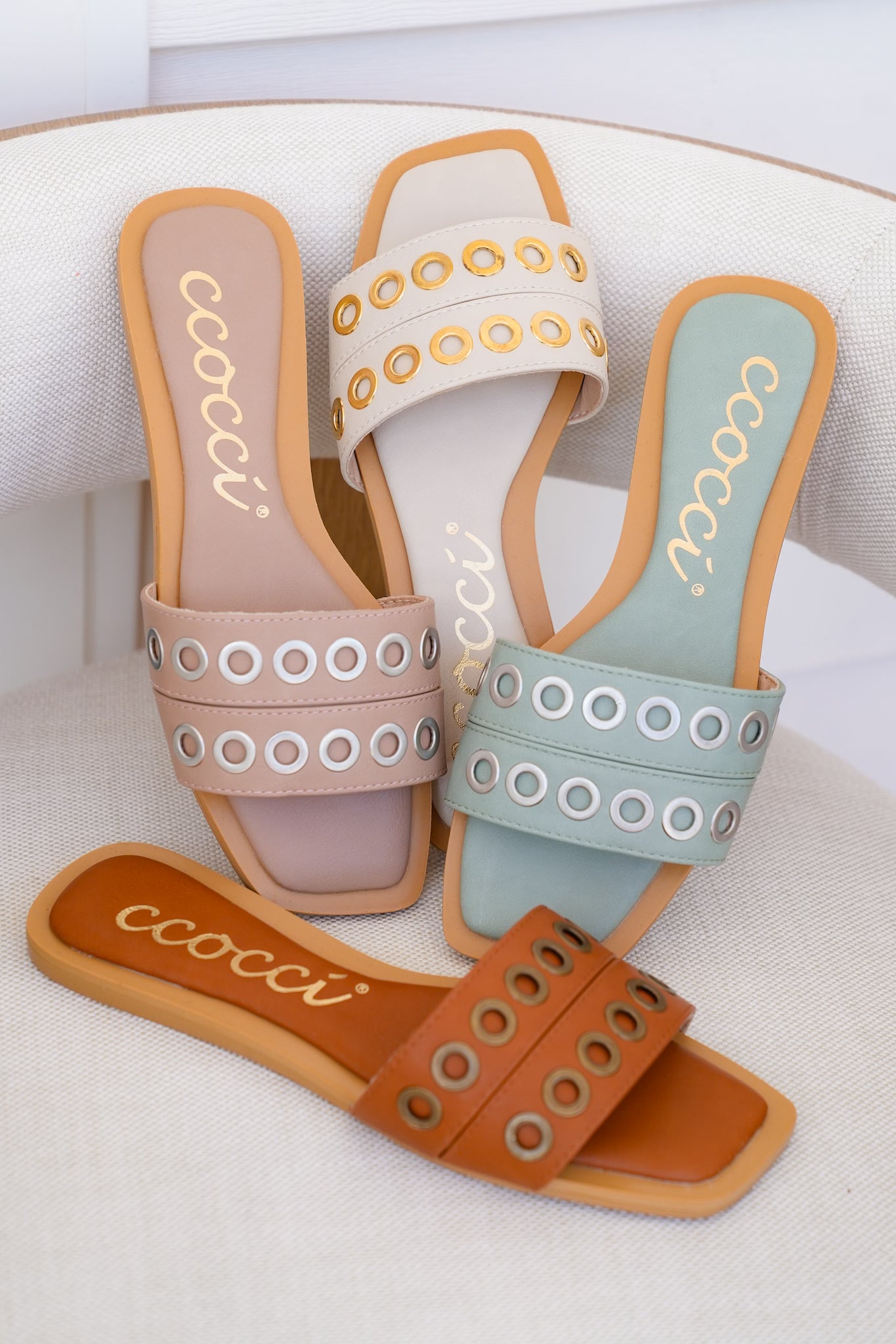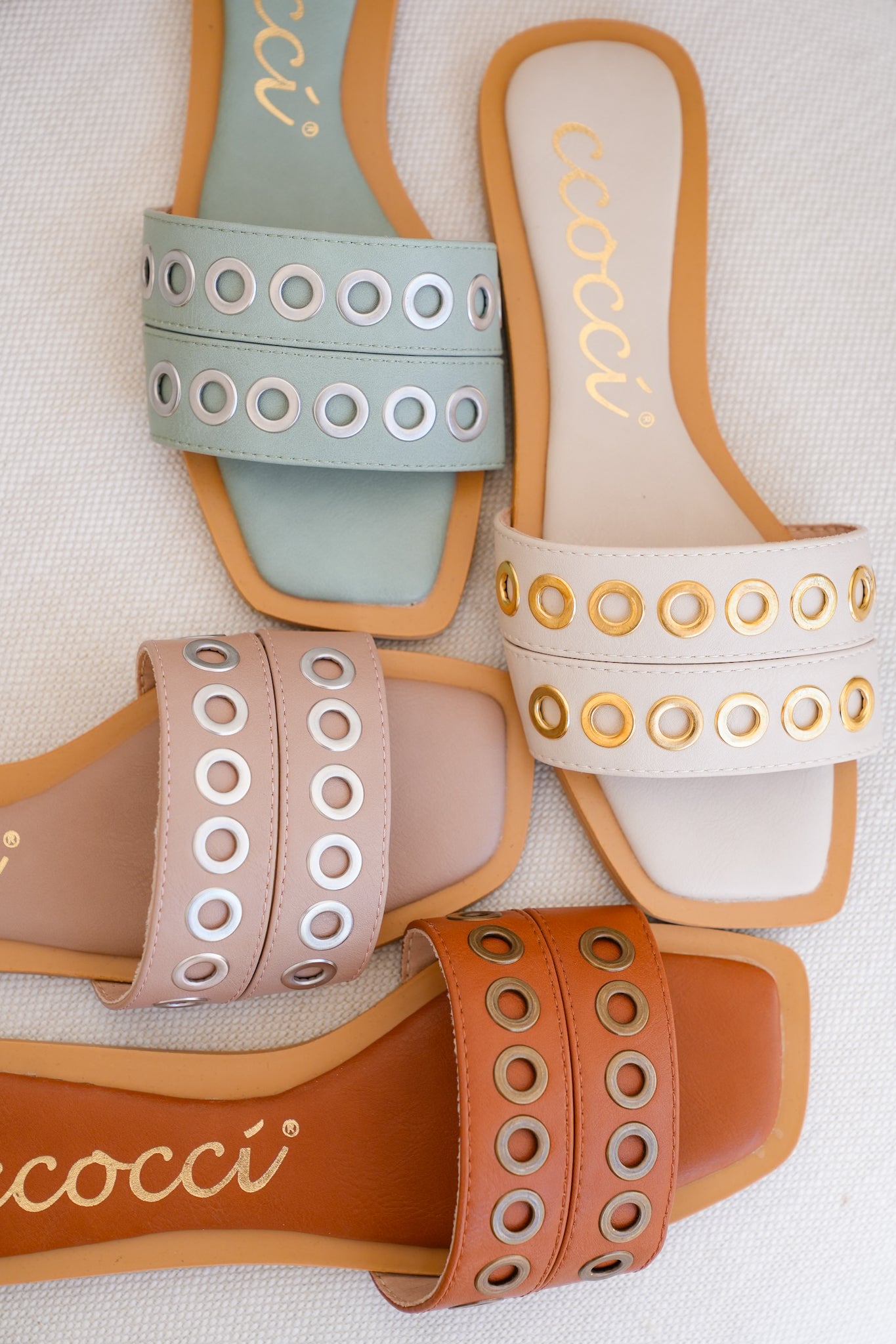 Edgy meets casual in these grommet-detailed slide sandals! With a cushy footbed and lightweight design, they’re made for everyday wear. Style with cutoffs, dresses, or your favorite jeans—instant cool factor.