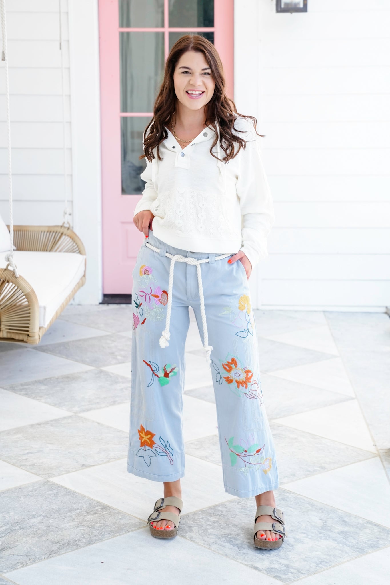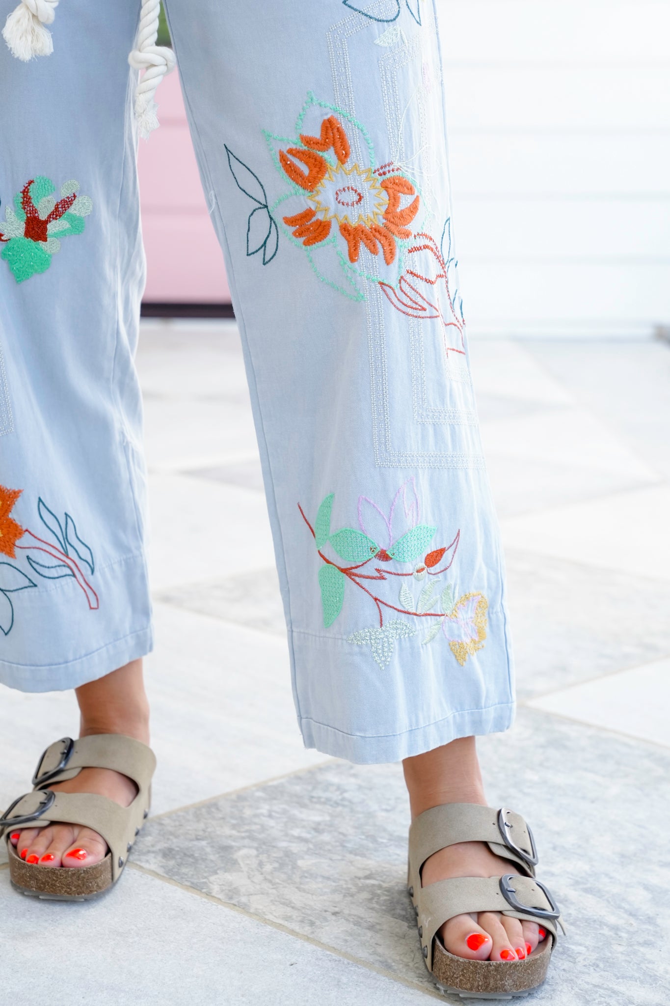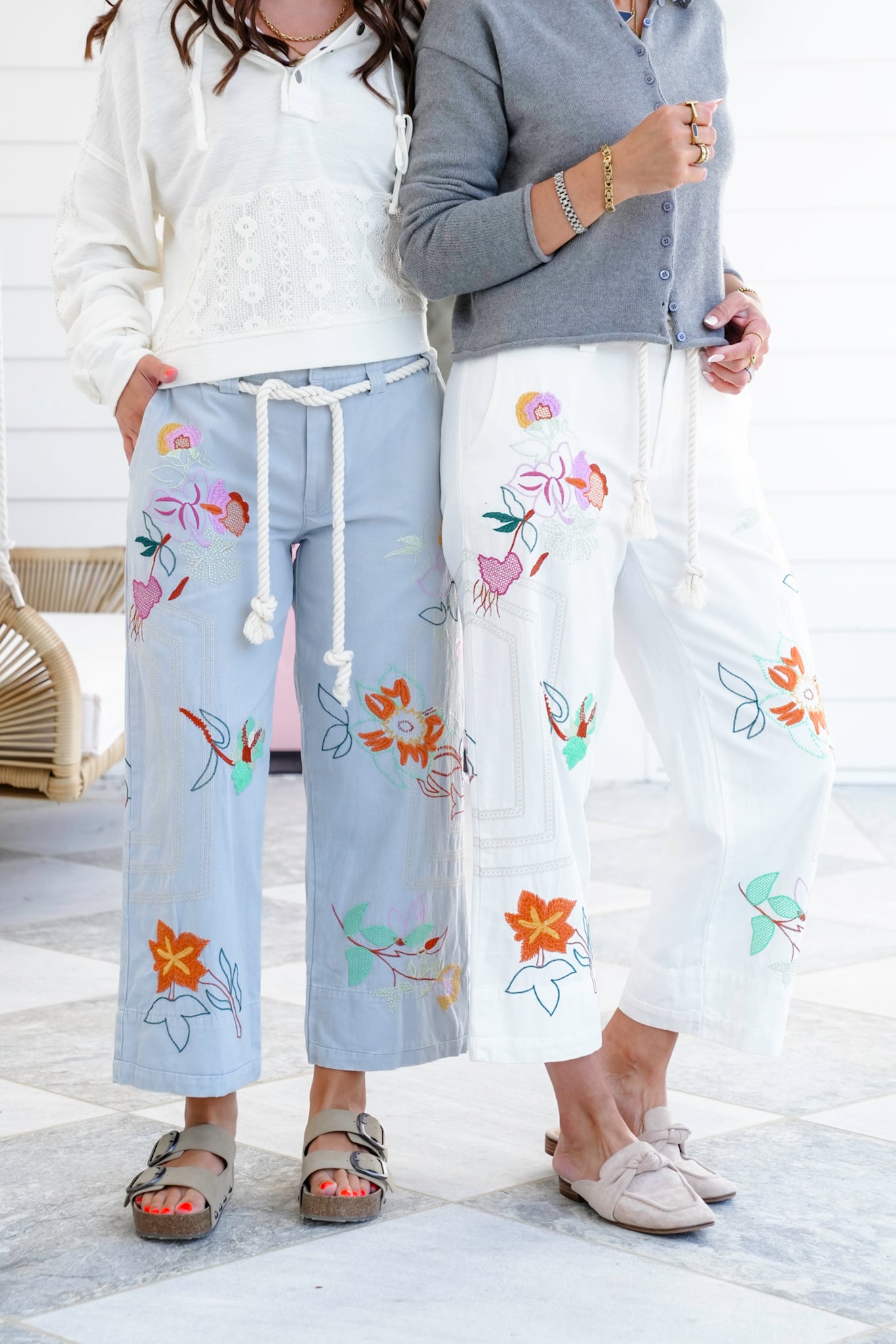 Restock! Floral Embroidered Elastic Back Pants with Rope Belt