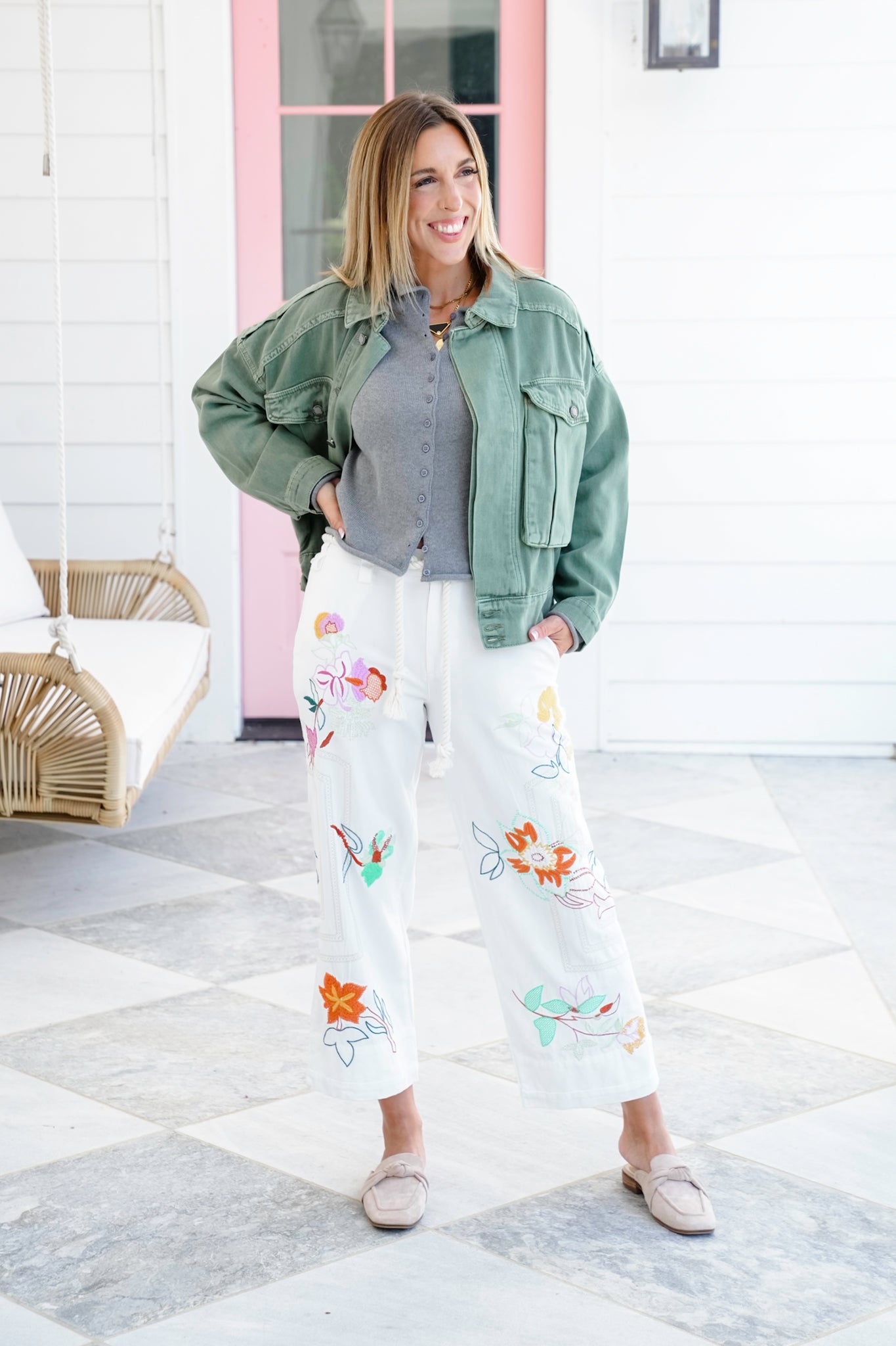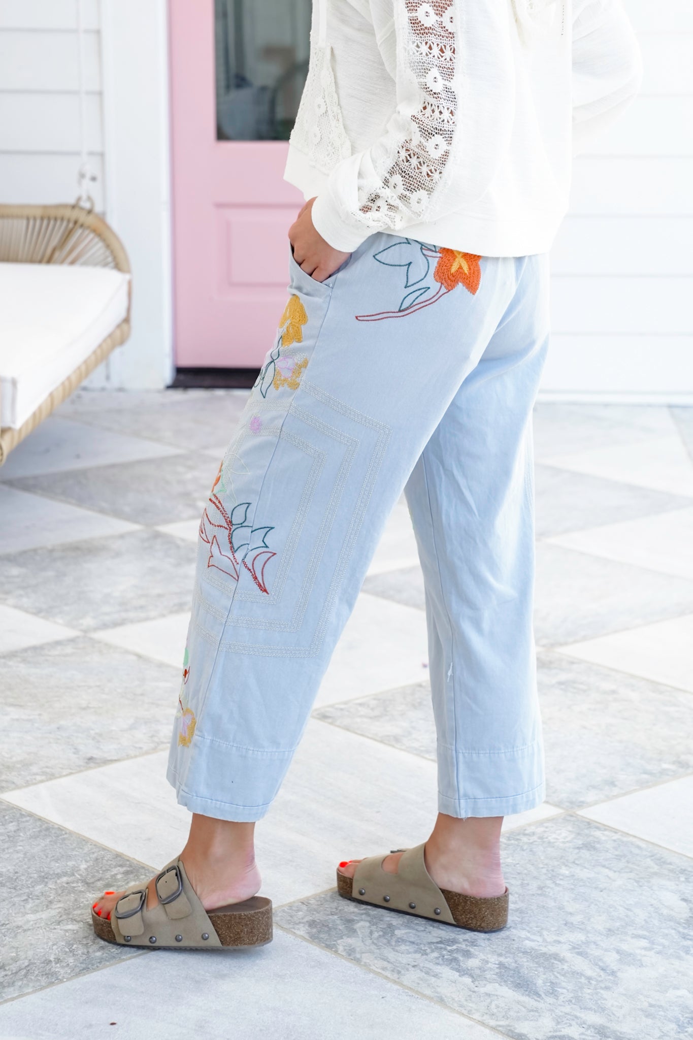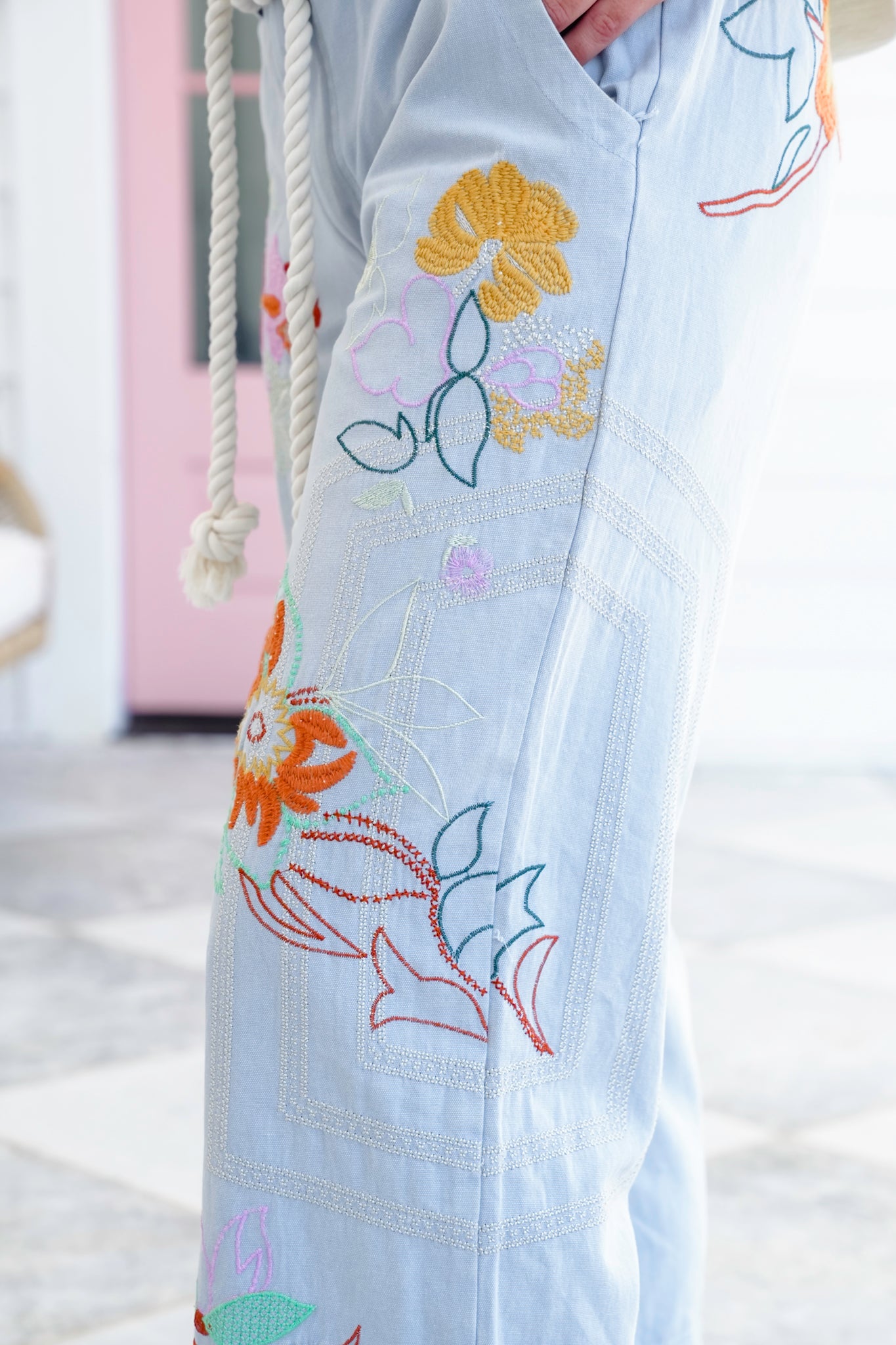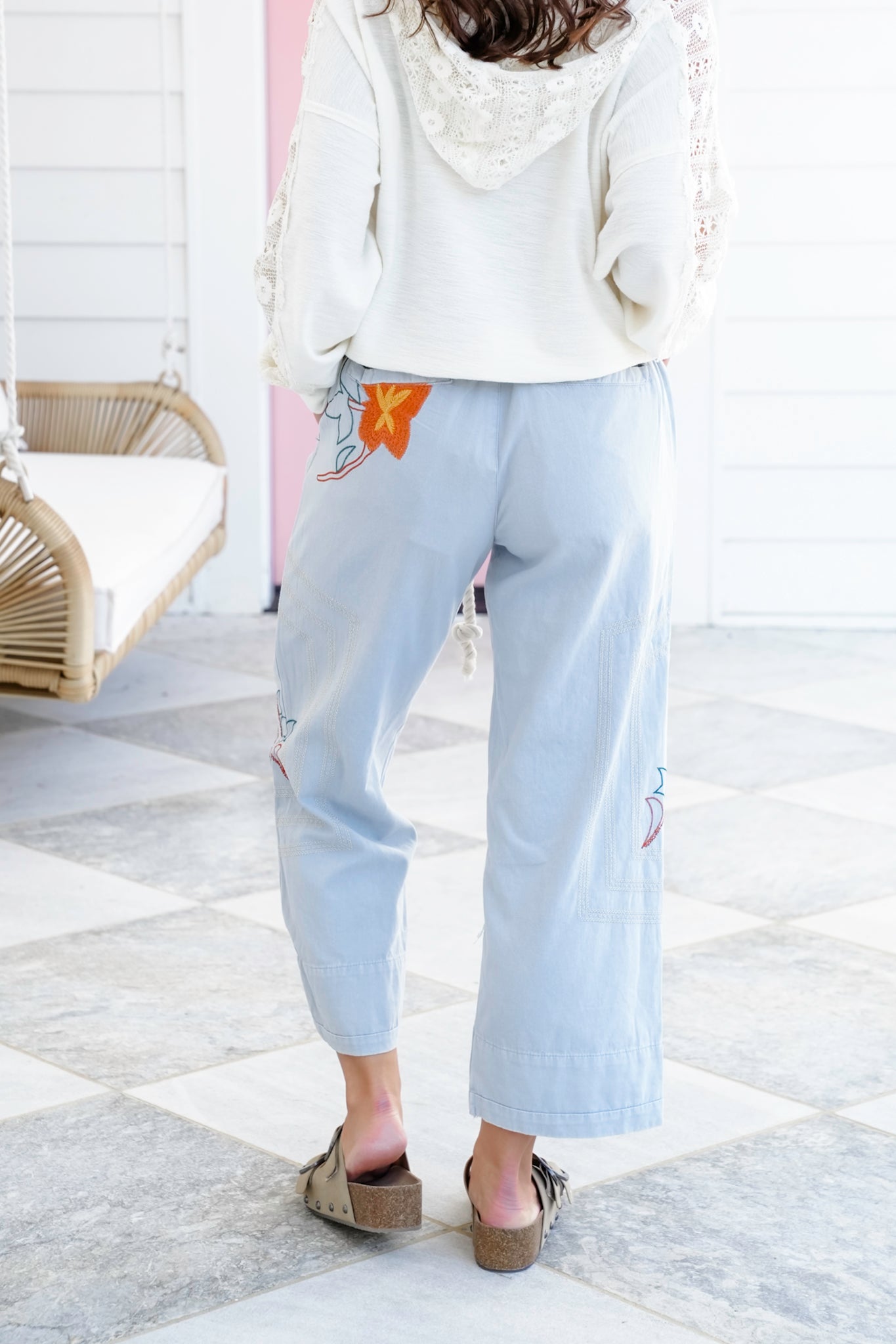 Restock! Floral Embroidered Elastic Back Pants with Rope Belt