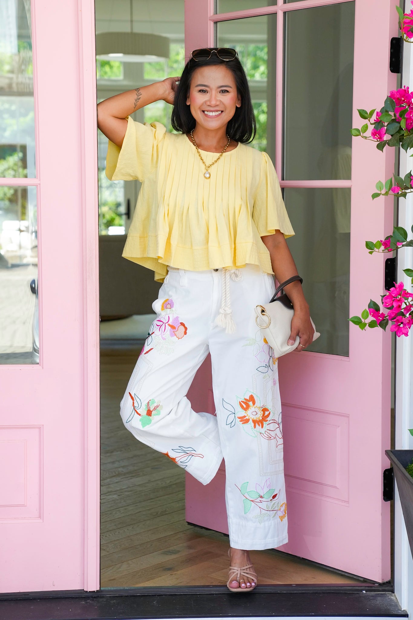 These embroidered pants are next-level stunning! From the bold pops of color to the textural floral stitching, they are a total statement piece you’ll love showing off. The breezy fabric keeps you cool while the elastic waistband brings easy comfort. The rope belt ties it all together—literally—and gives them a laid-back, coastal flair. Pair them with a cropped tee, fitted tank, or even a graphic sweatshirt for a fun twist.