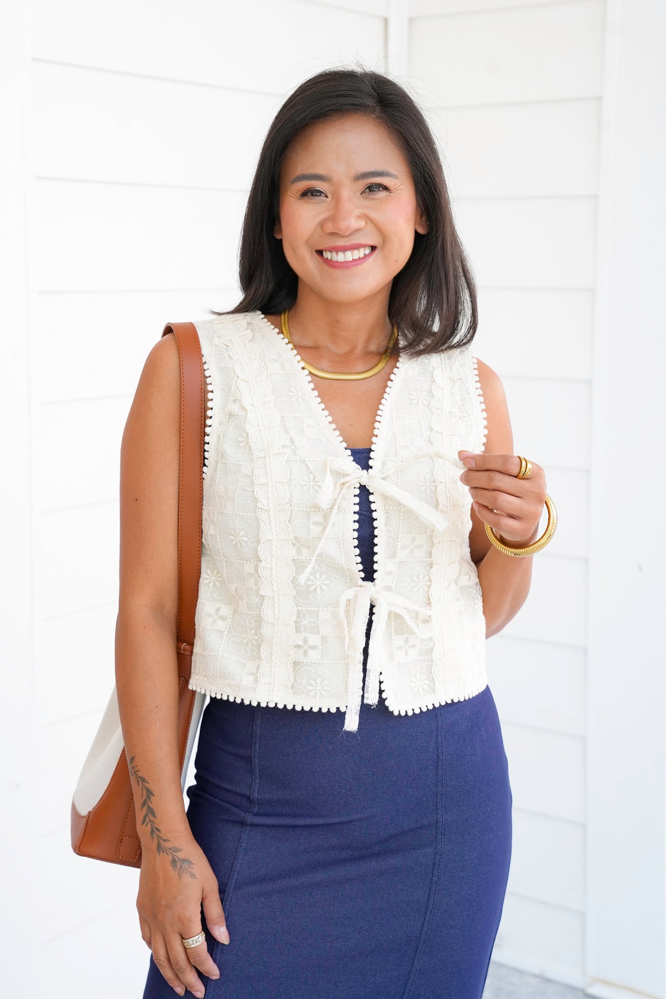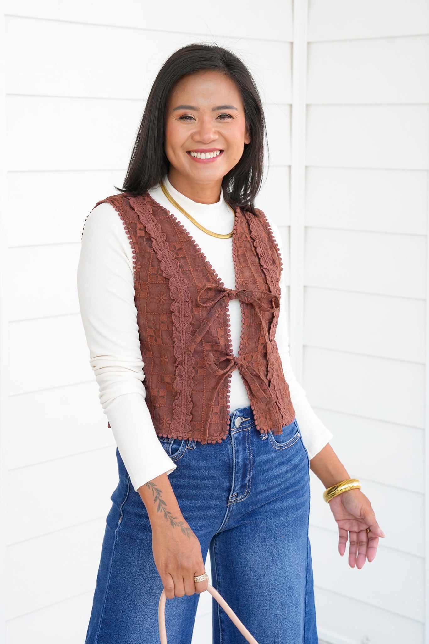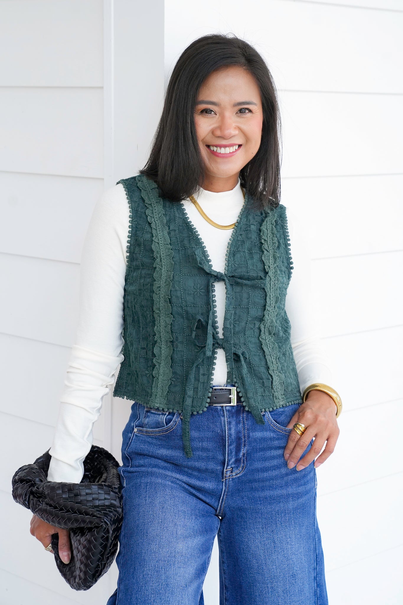This vest is a layering dream. It instantly adds texture and personality to even the simplest outfit. Toss it over a dress to soften the look, layer it with a crop top and denim for boho flair, or pair it with a fitted tee for something casually chic. The embroidery and tie-front detailing give it that boutique finish you’ll love.
