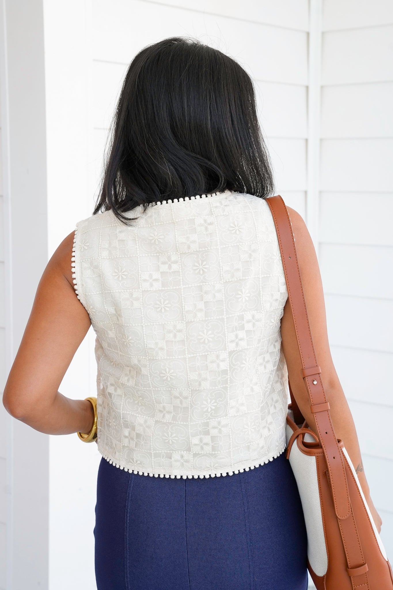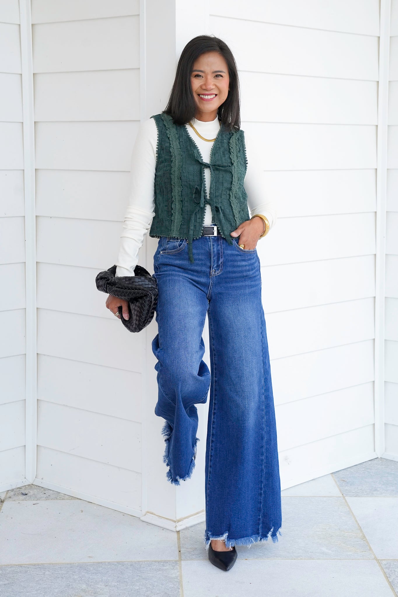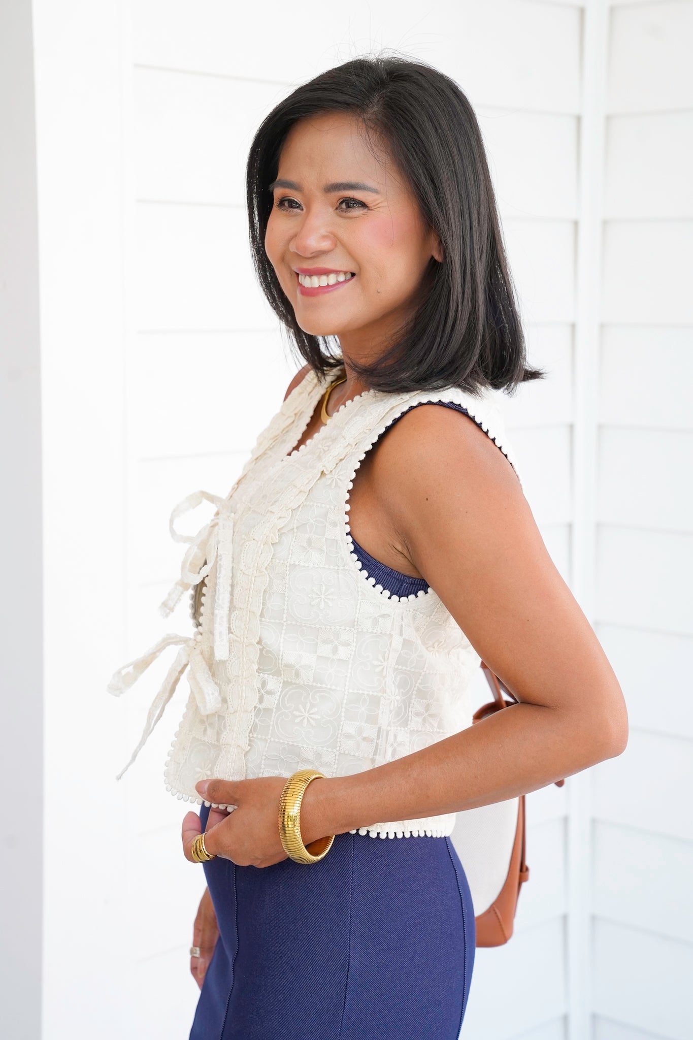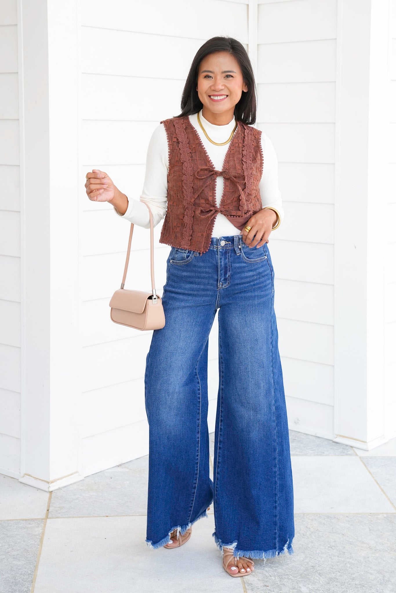 This vest is a layering dream. It instantly adds texture and personality to even the simplest outfit. Toss it over a dress to soften the look, layer it with a crop top and denim for boho flair, or pair it with a fitted tee for something casually chic. The embroidery and tie-front detailing give it that boutique finish you’ll love.
