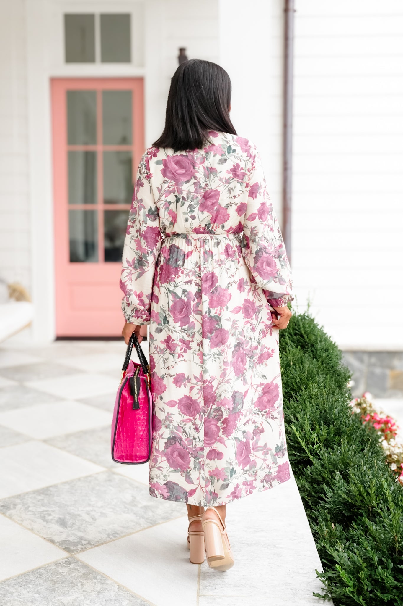 This floral midi dress is romantic, polished, and made for twirling. The tie waist highlights your shape while the flowing skirt adds graceful movement. This piece can be worn to weddings, church, showers, or even styled casually with sandals for a relaxed garden lunch. Pair it with heels and a sleek clutch for a look that instantly elevates special occasions.