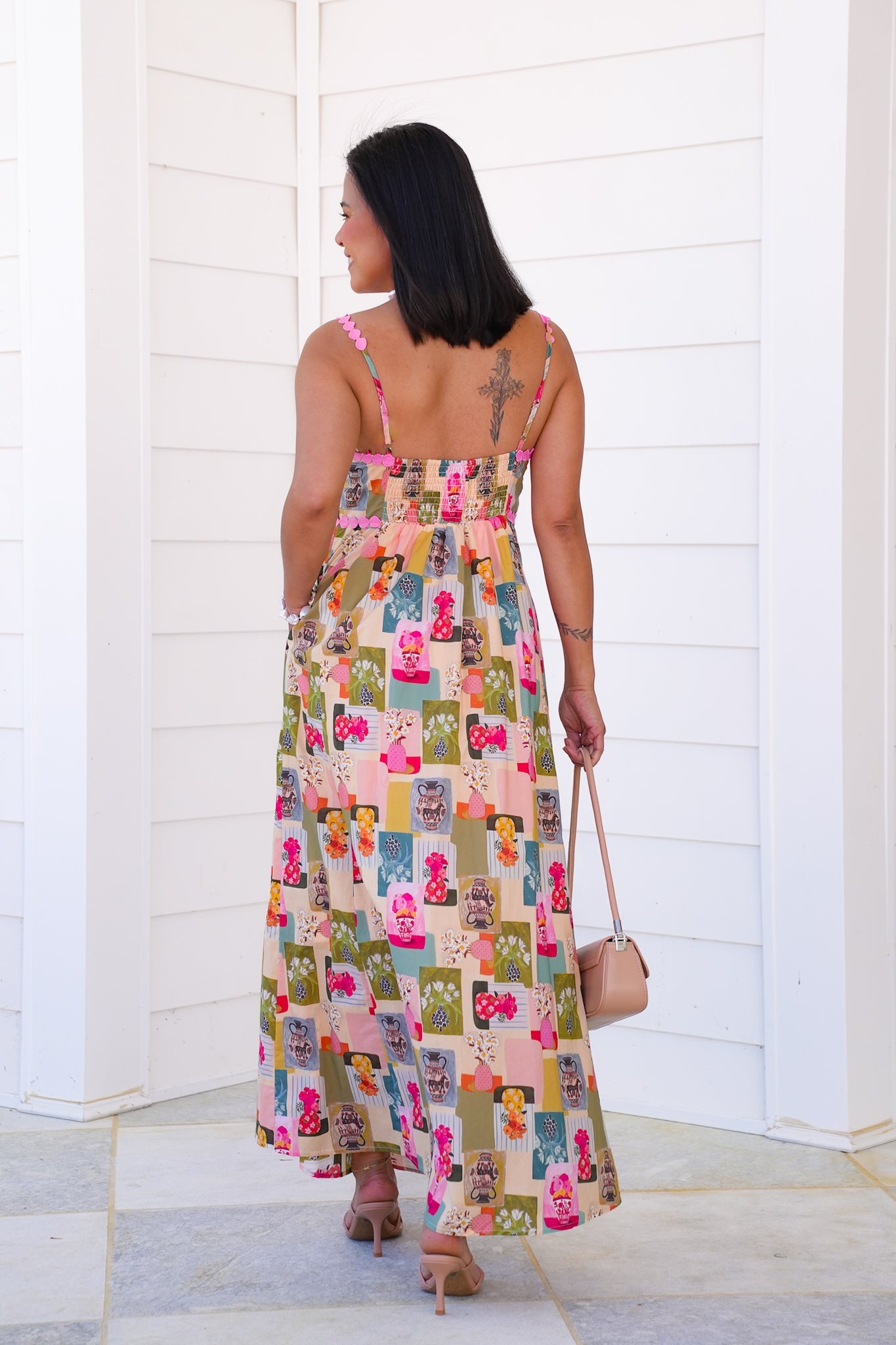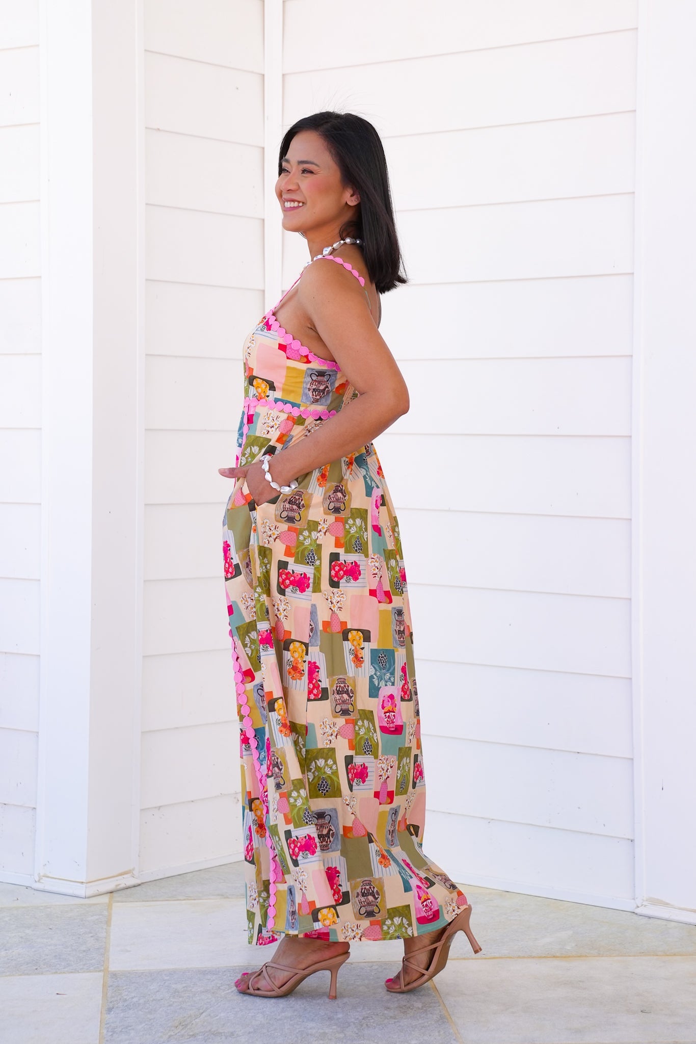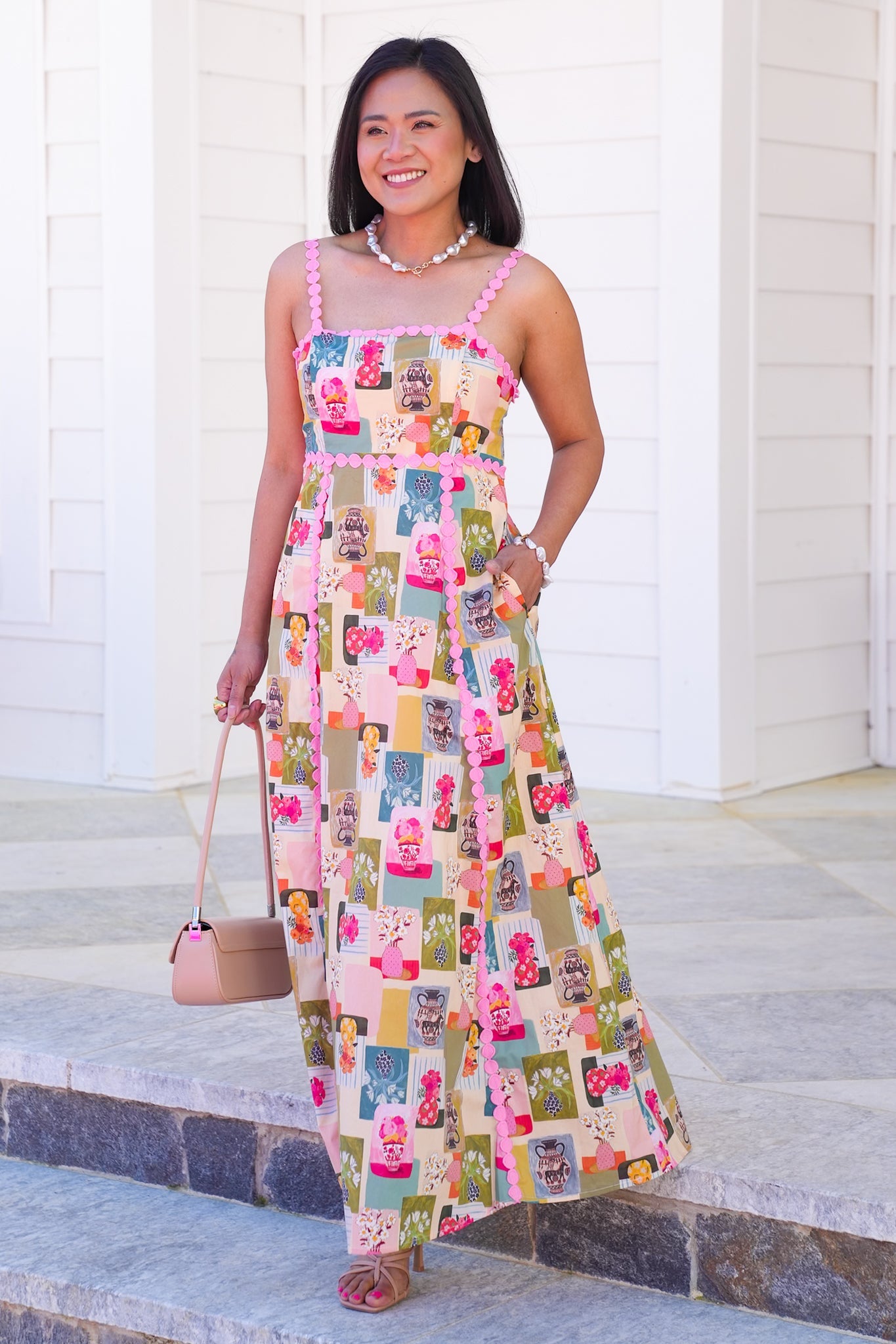 Floral Print Sleeveless Midi Dress with Trim Detail