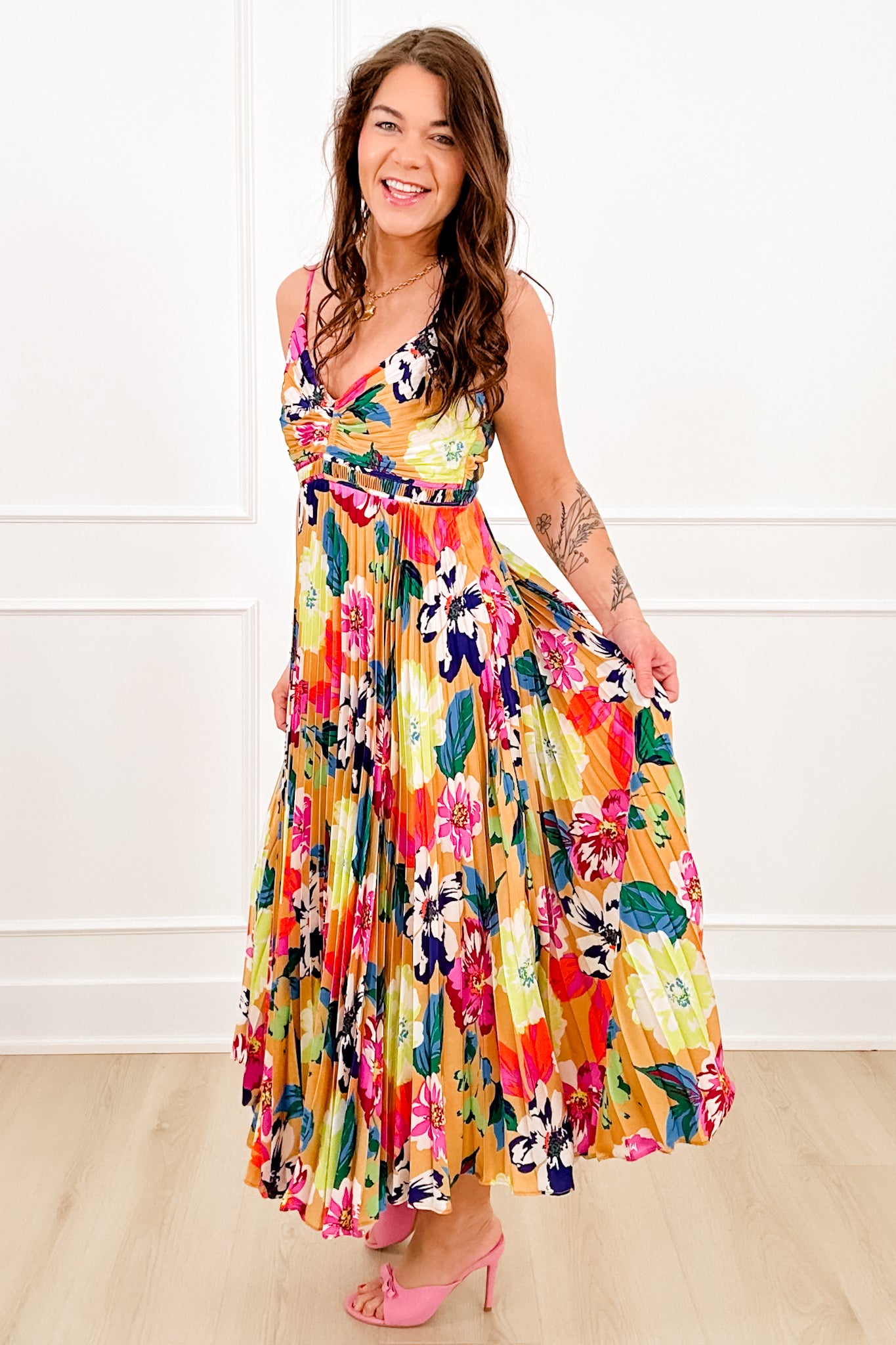 This midi just feels like a vacation! The colorful floral print and flowy pleated skirt give it that light, breezy look that moves so pretty when you walk, like it was made for sunny days and dinner by the water. Adjustable straps help you get the fit just right, and the smocked back keeps it comfortable all day long. Pair it with sandals for daytime or dress it up with wedges for a night out.