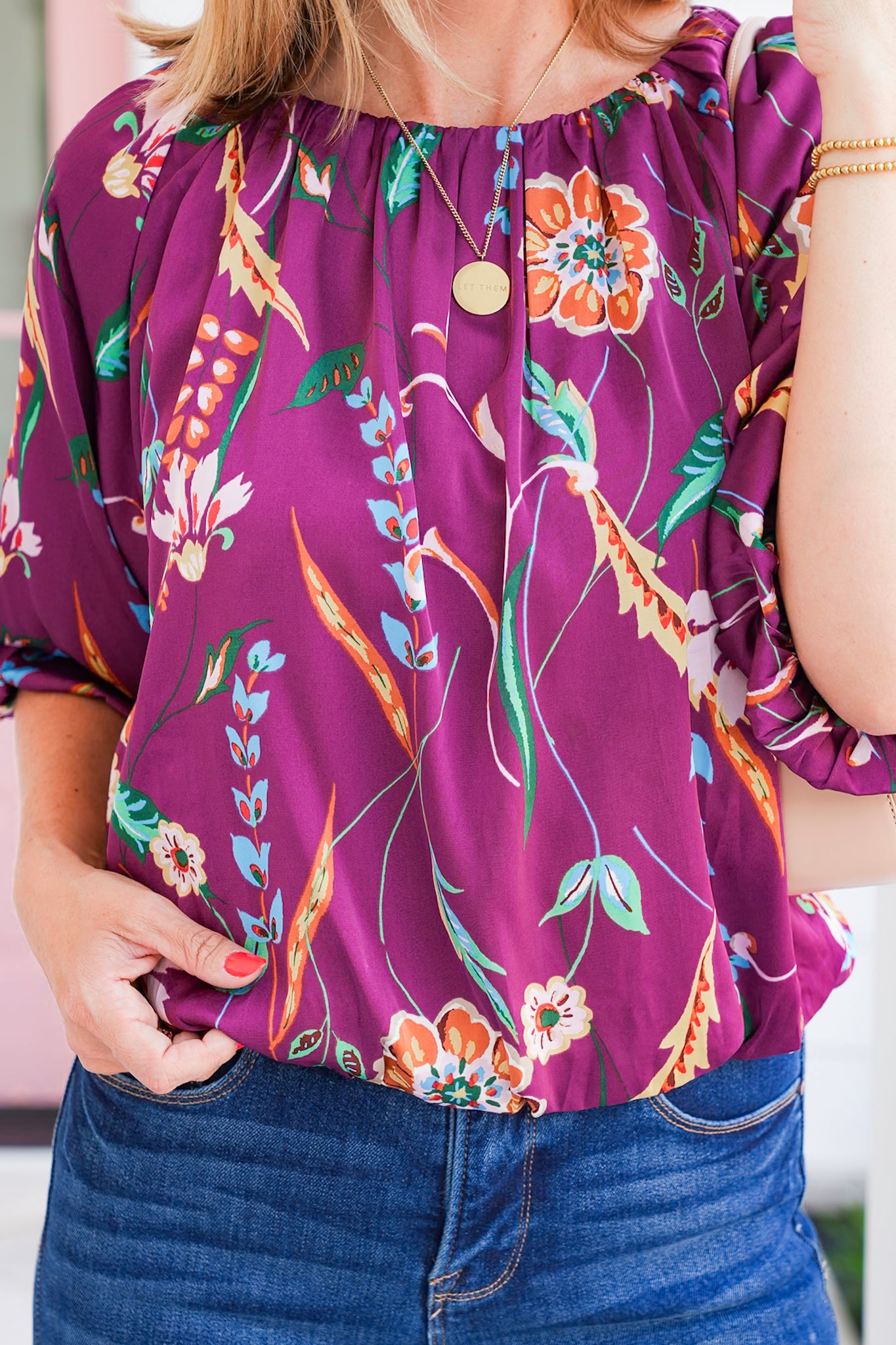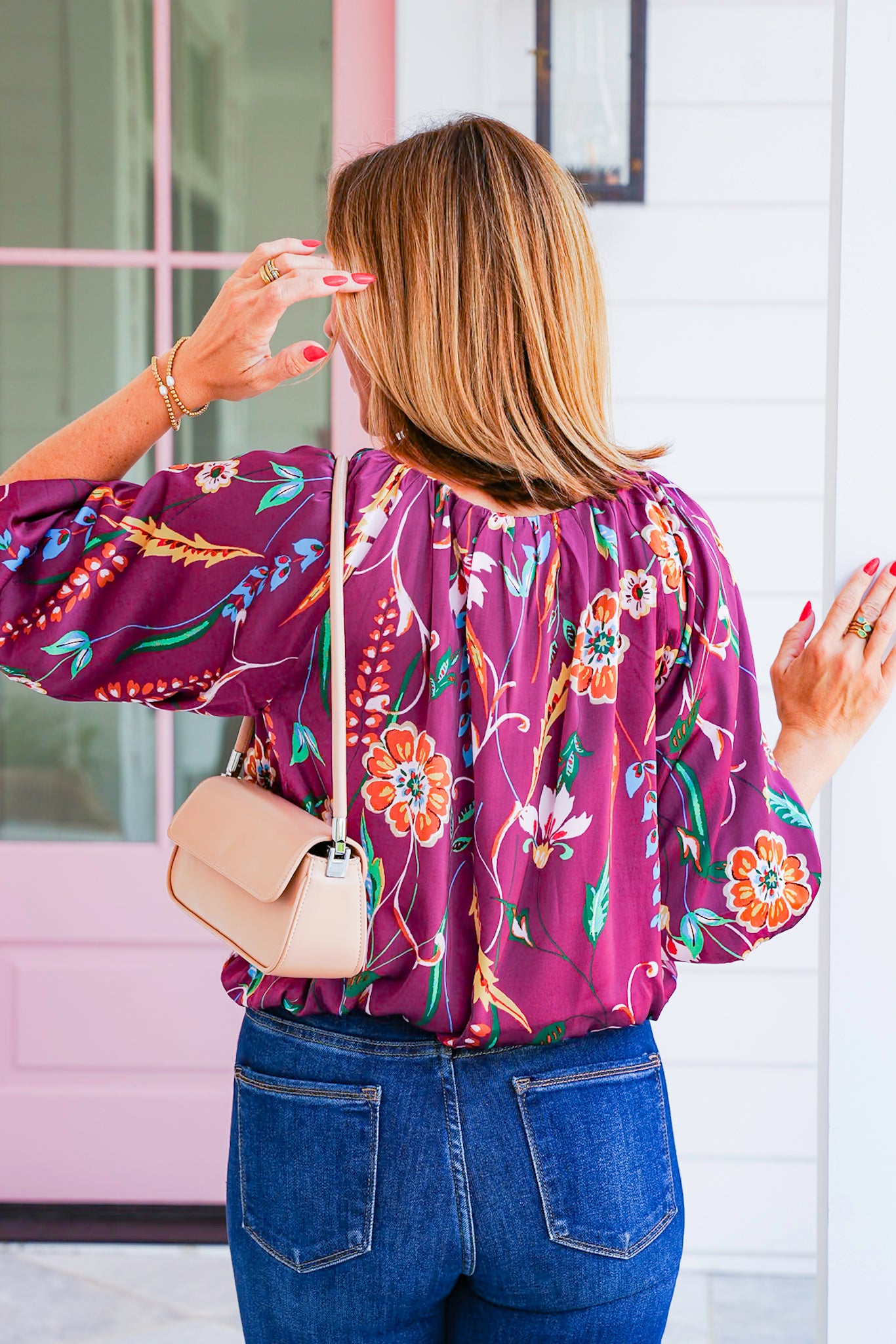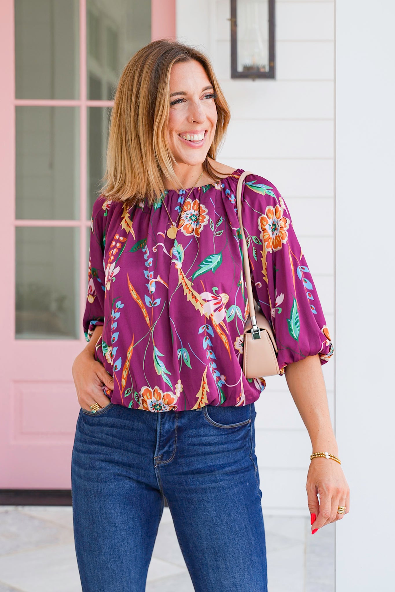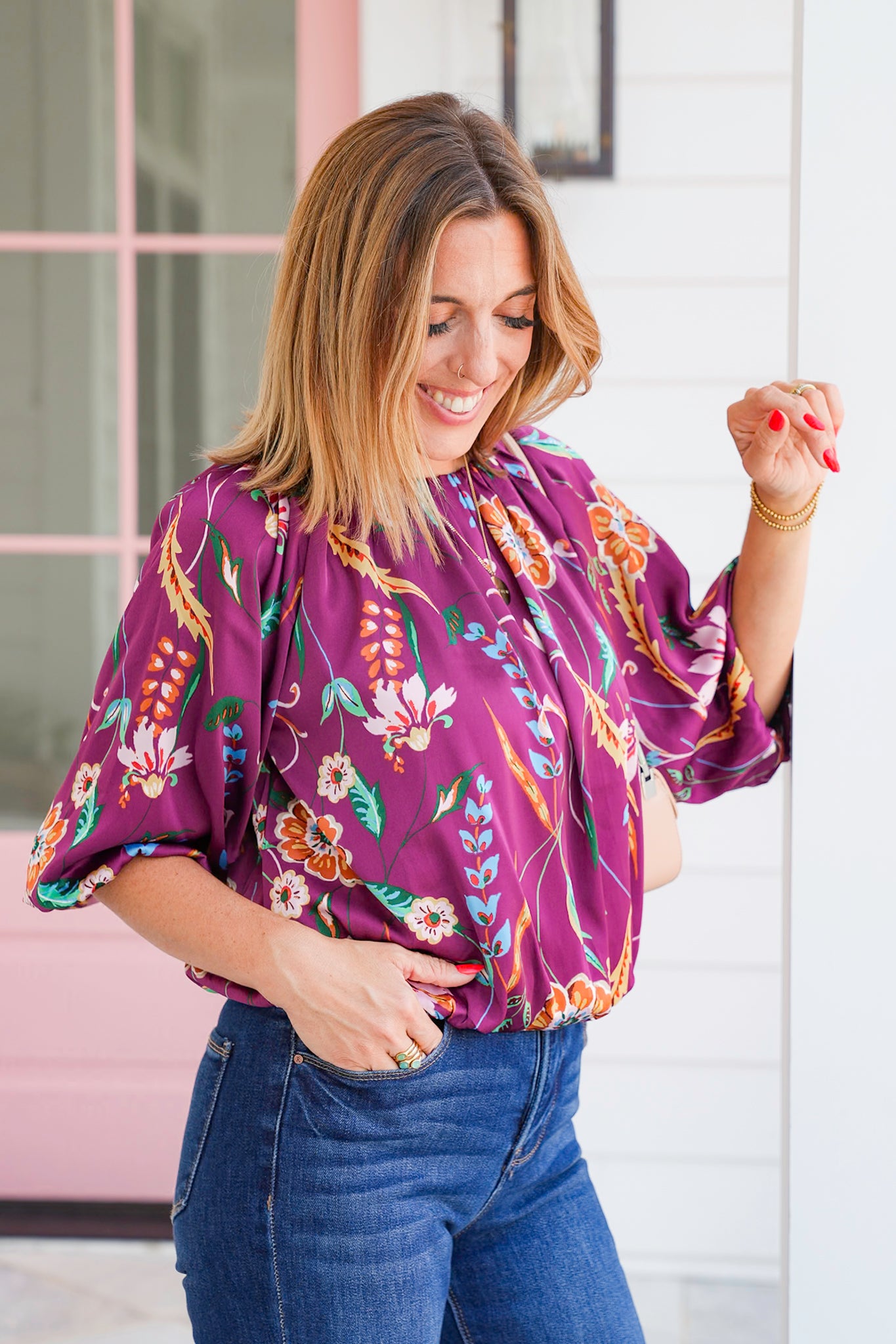 This bubble hem top is playful yet polished, with its silky feel and standout floral print set against a deep plum backdrop. The pleated neckline, puff sleeves, and cropped cut make it a fresh choice for everything from weekend brunch to evenings out.