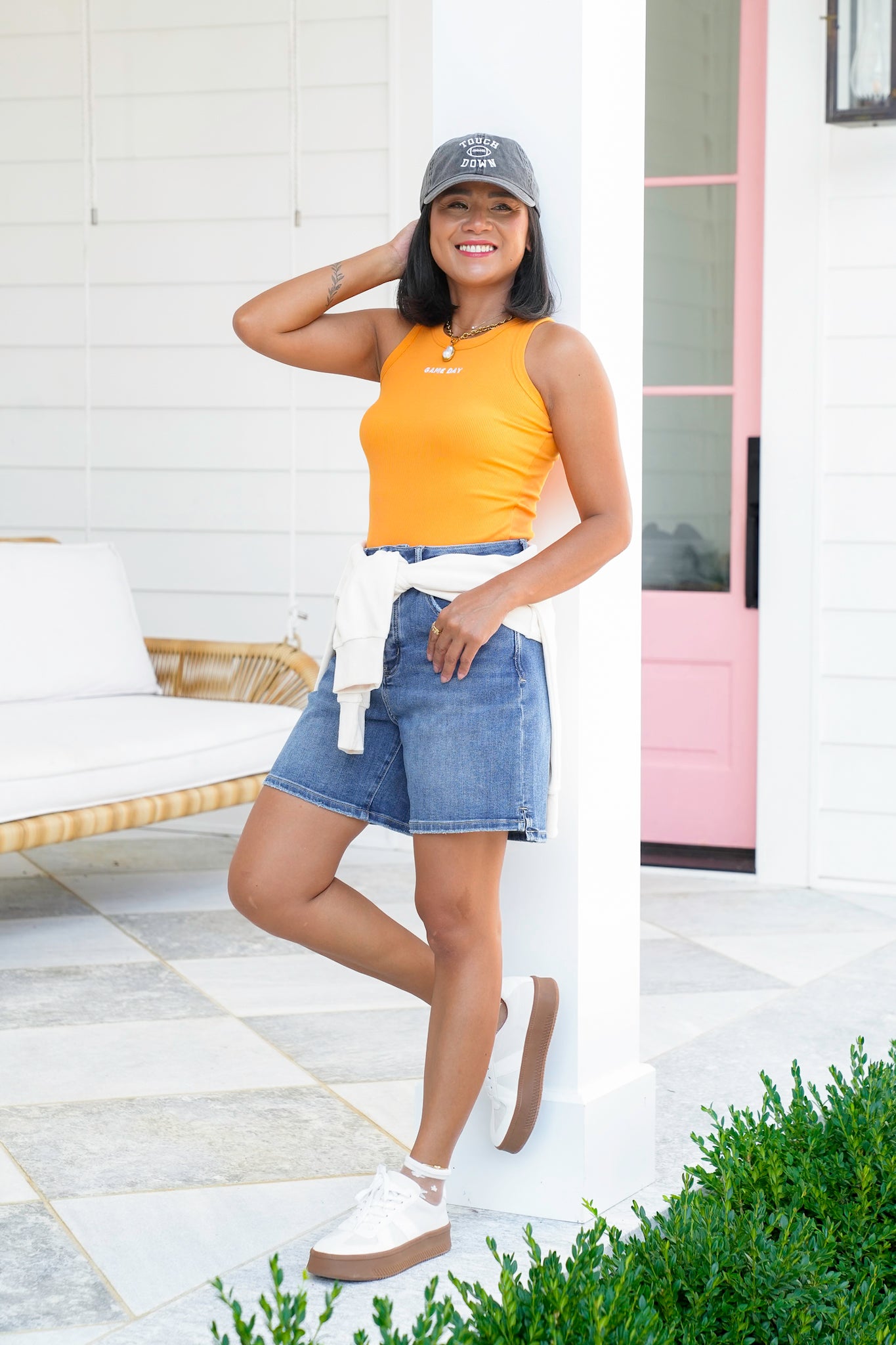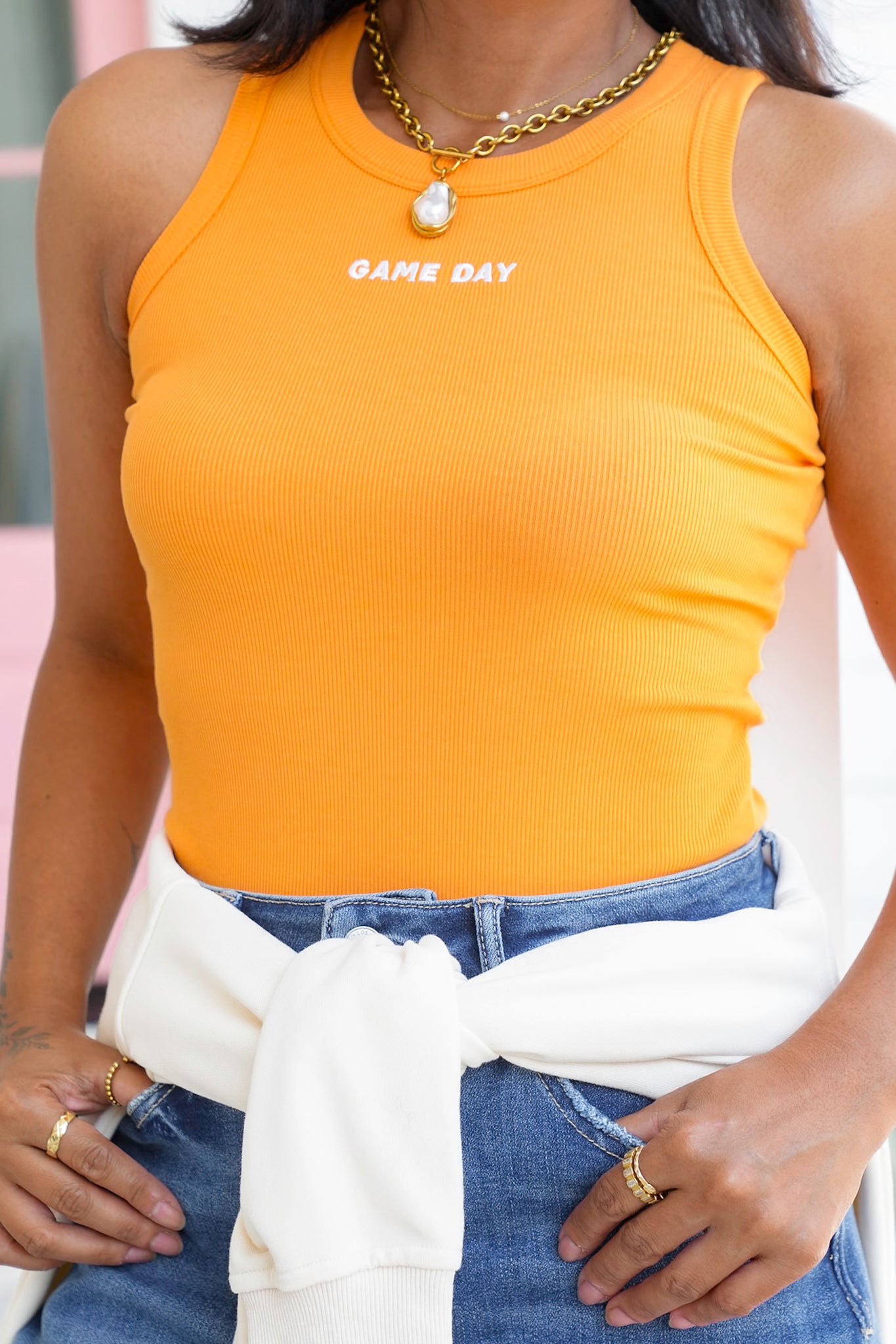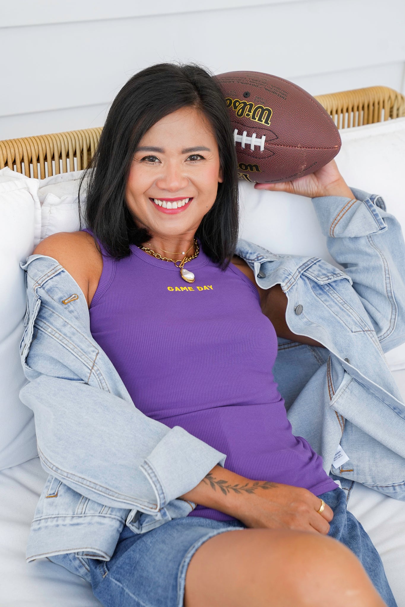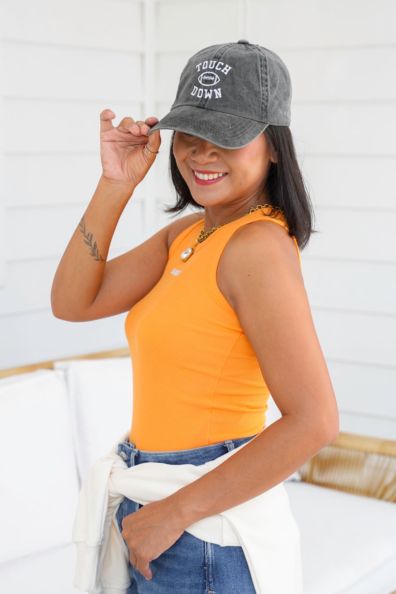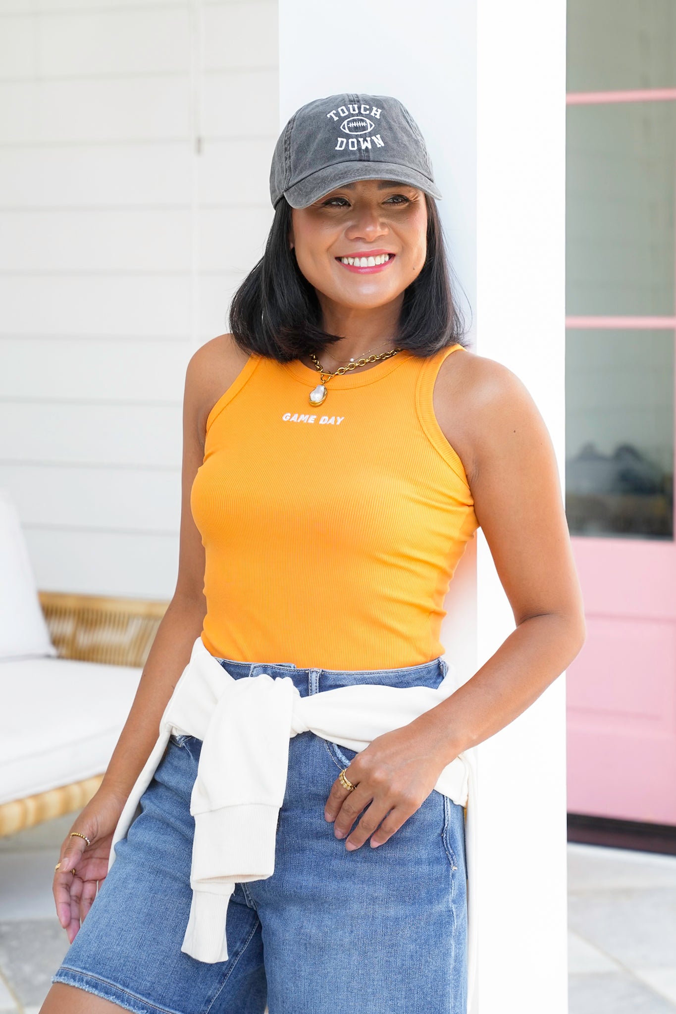 This tank is bringing big game day energy in a sleek, sporty silhouette! Designed with bold contrast trim and a stitched football accent at the chest, it’s got just the right dose of fun without going overboard. The ribbed knit and incredible stretch make it your go-to whether you're cheering from the bleachers or keeping it cute at brunch. Style it with high-rise denim, joggers, or under a flannel for a layered look that scores every time.