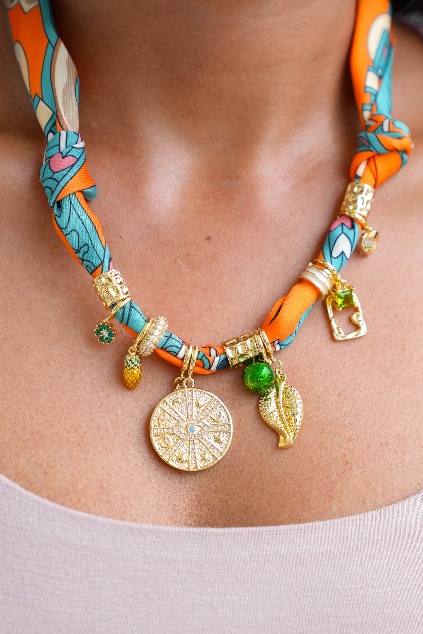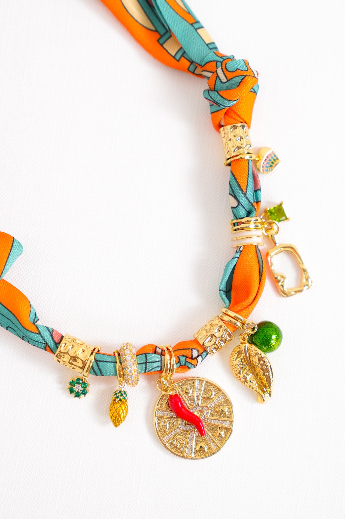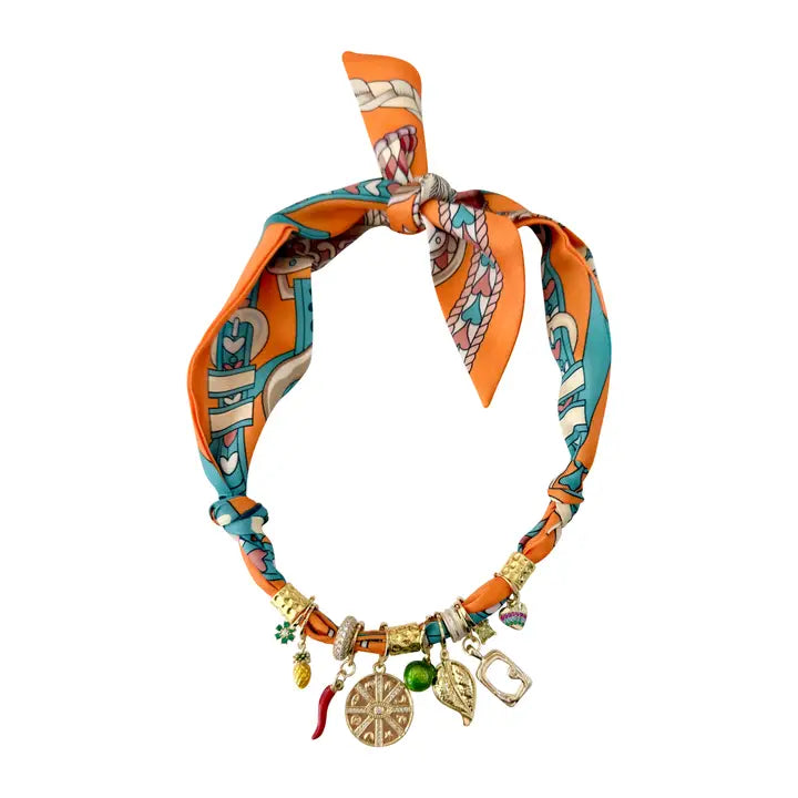 Bold and unique, the Camron Multi Charm Scarf Necklace is a statement accessory with a playful touch. This best-selling design features a luxurious scarf adorned with nine gold-plated CZ charms, including a multi-colored heart, leaf, lime, large coin, chili pepper, pineapple, and green flower.