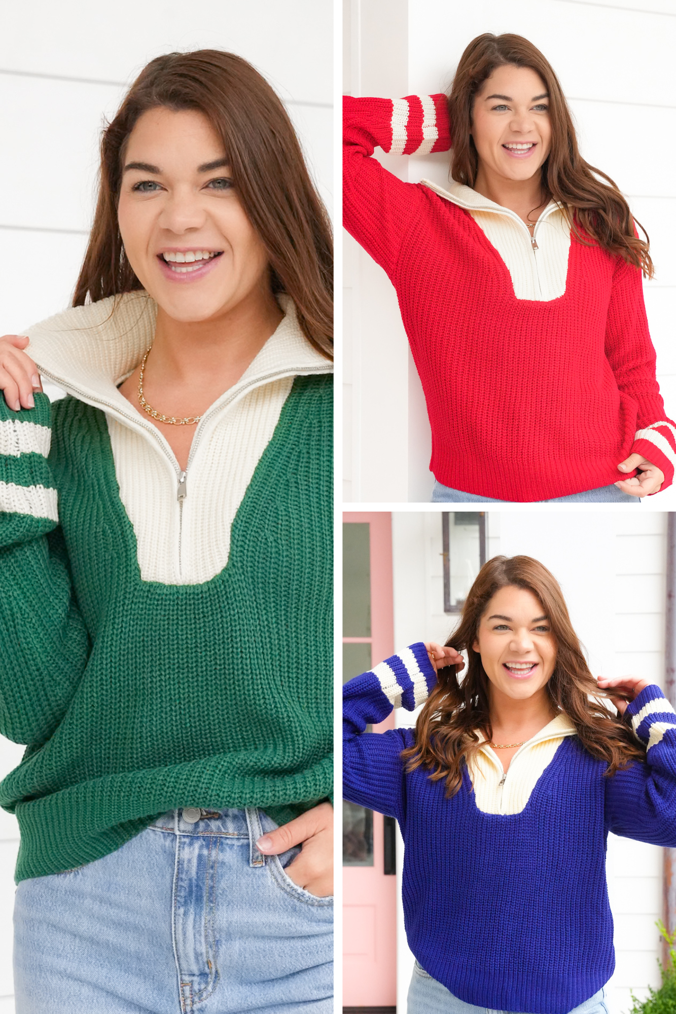 This sweater brings sporty chic to everyday style. The half-zip neckline makes it easy to style open with a layered chain or zipped up for a cozier vibe. The bold stripes on the sleeves add a pop of personality that looks great with denim or joggers.