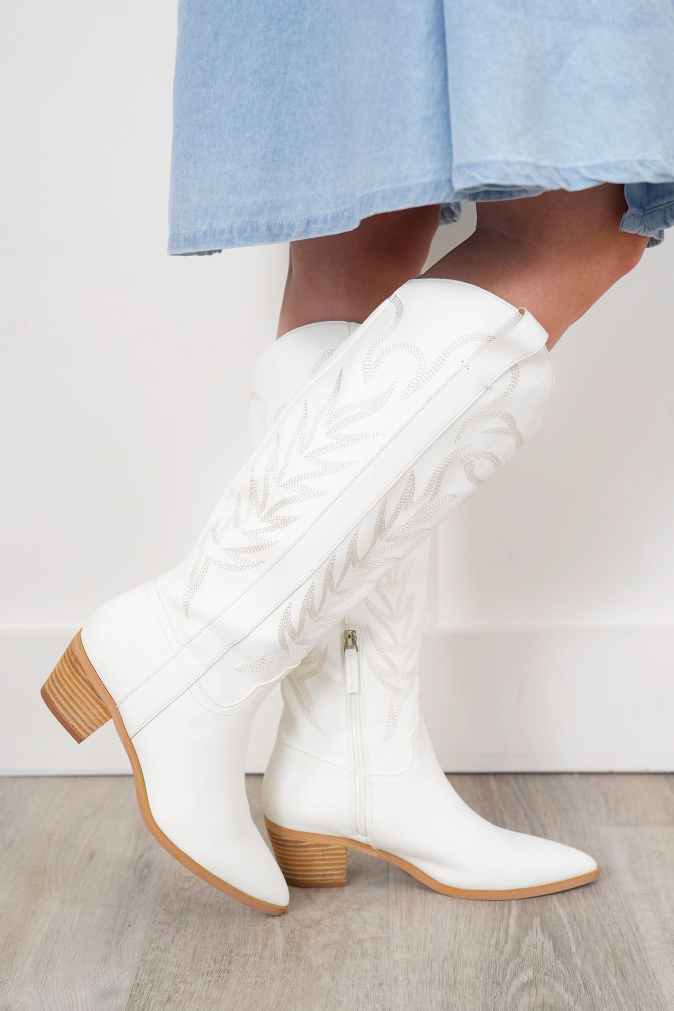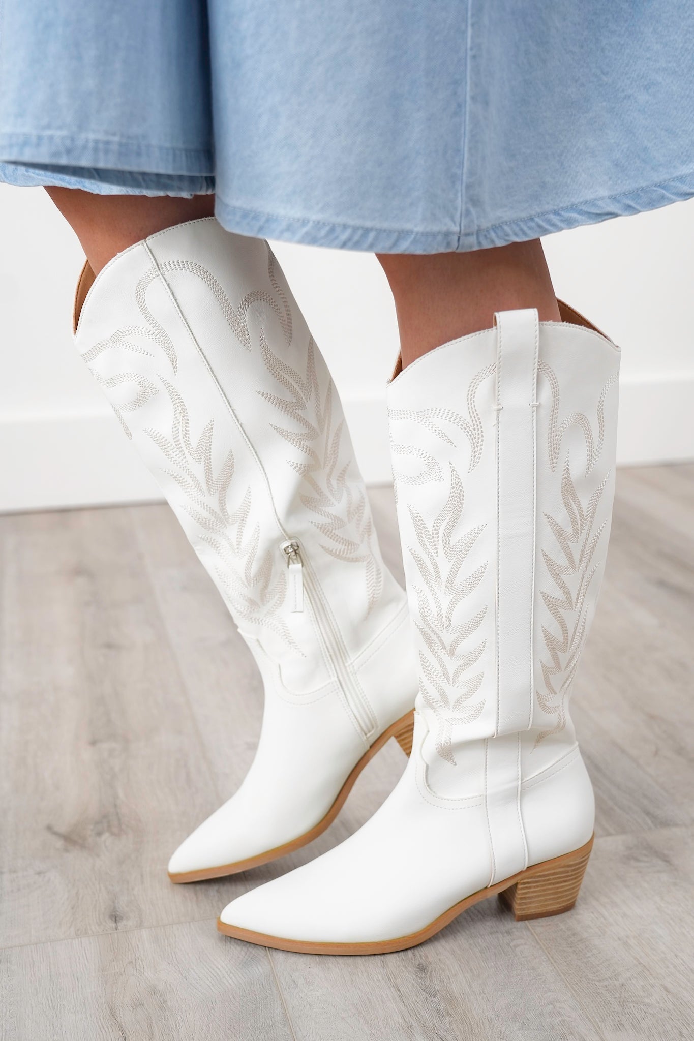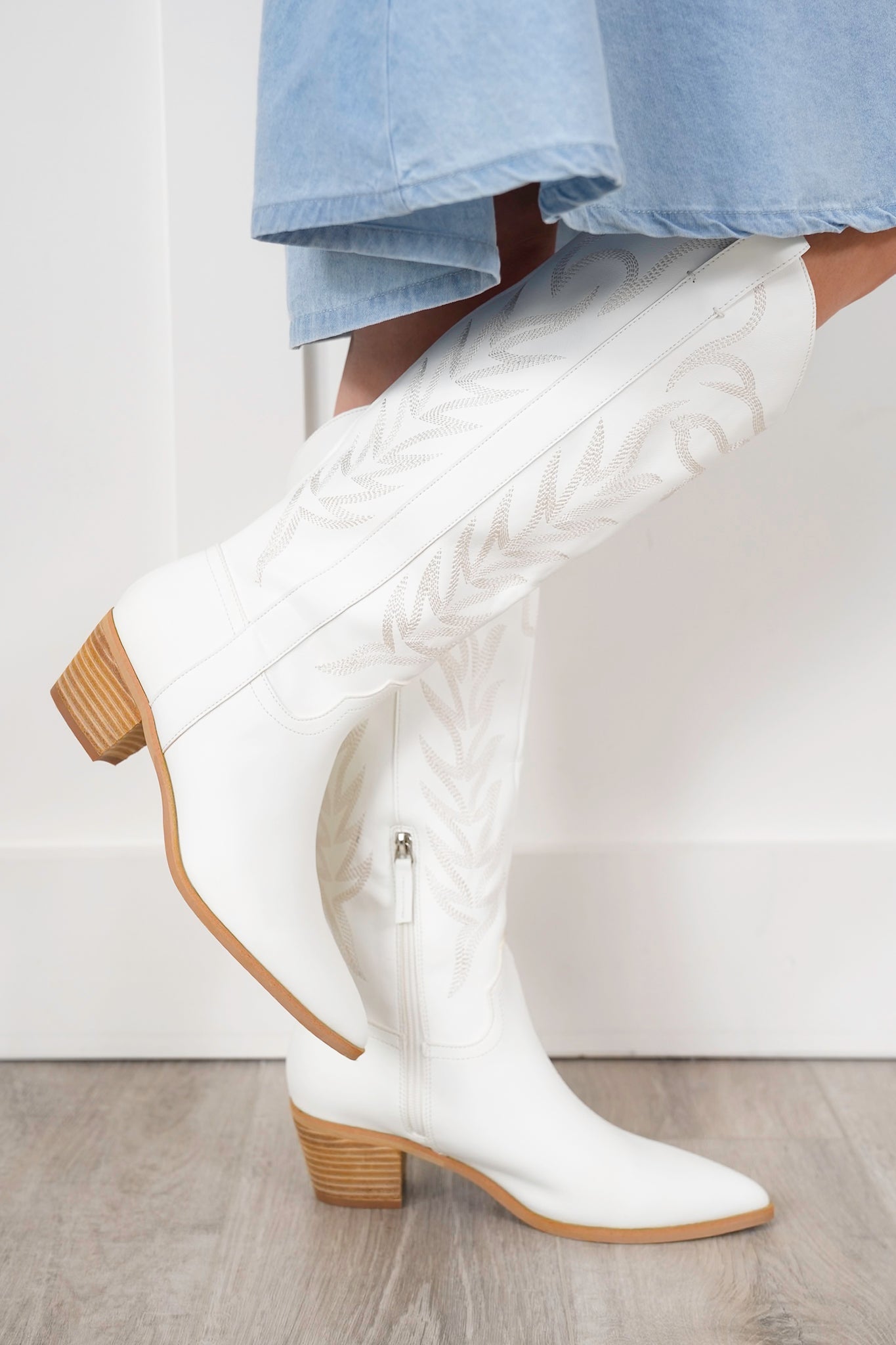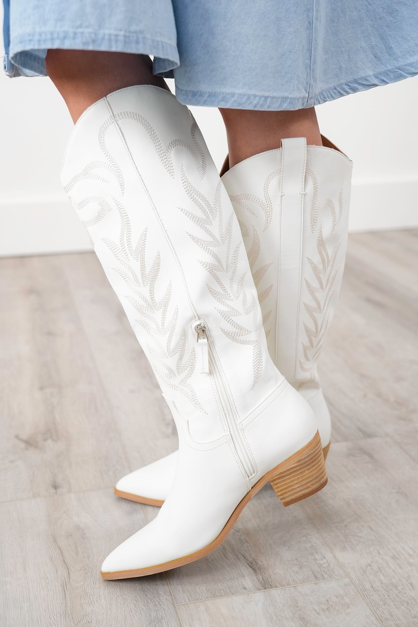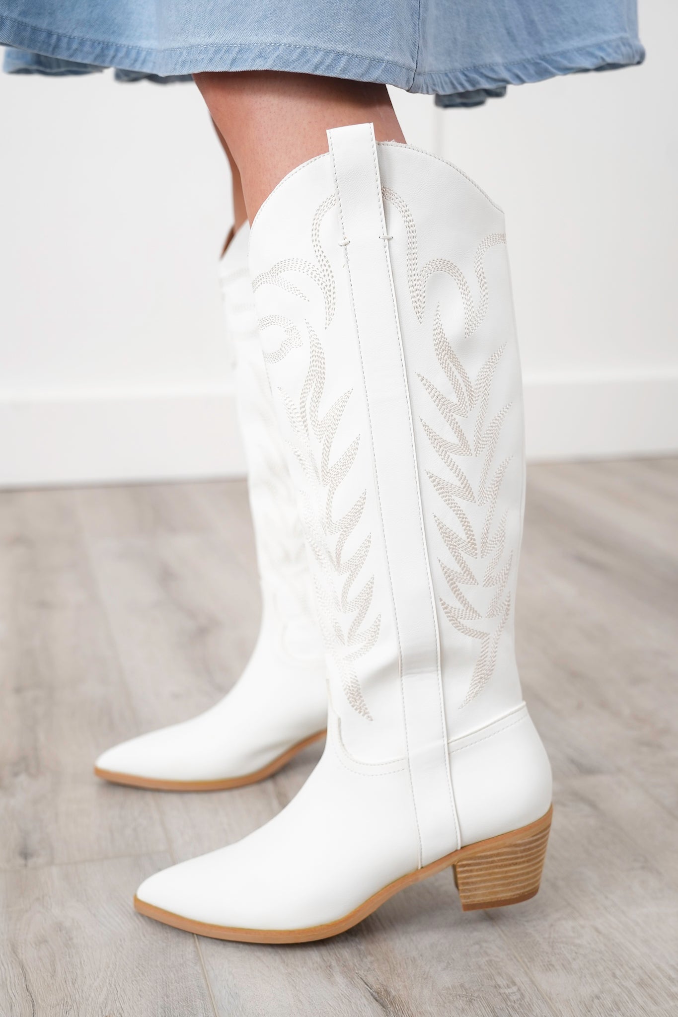 These boots are straight fire, y’all. From the crisp white vegan leather to the stitched western detailing and stacked block heel, they’re ready to stomp into festivals, fairs, and beyond. The higher shaft brings extra drama without sacrificing comfort, and the neutral tone makes them an easy match with dresses, skirts, or denim cutoffs.
