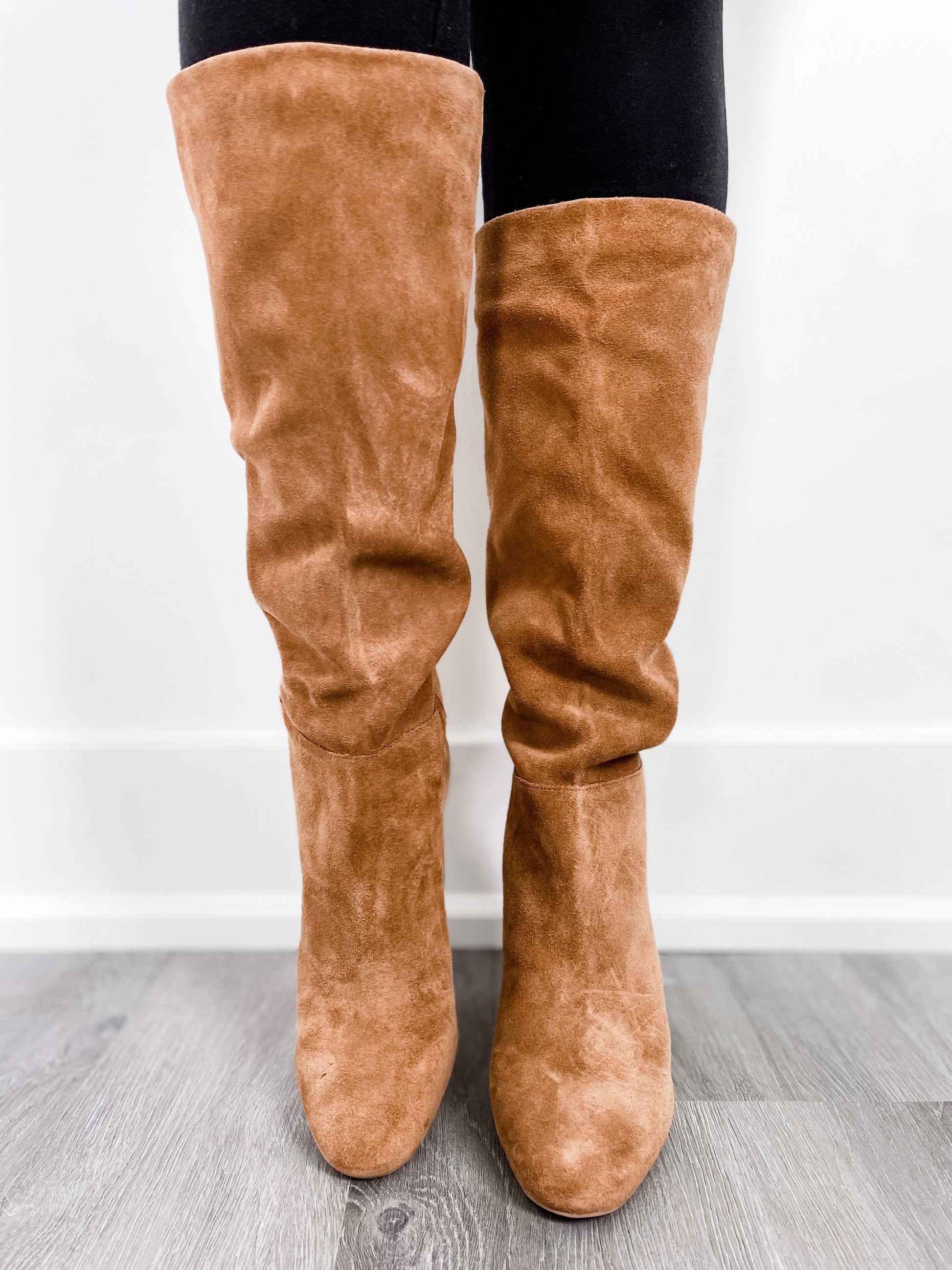 Honey Brown Vegan Suede High Heeled Pull On Boots