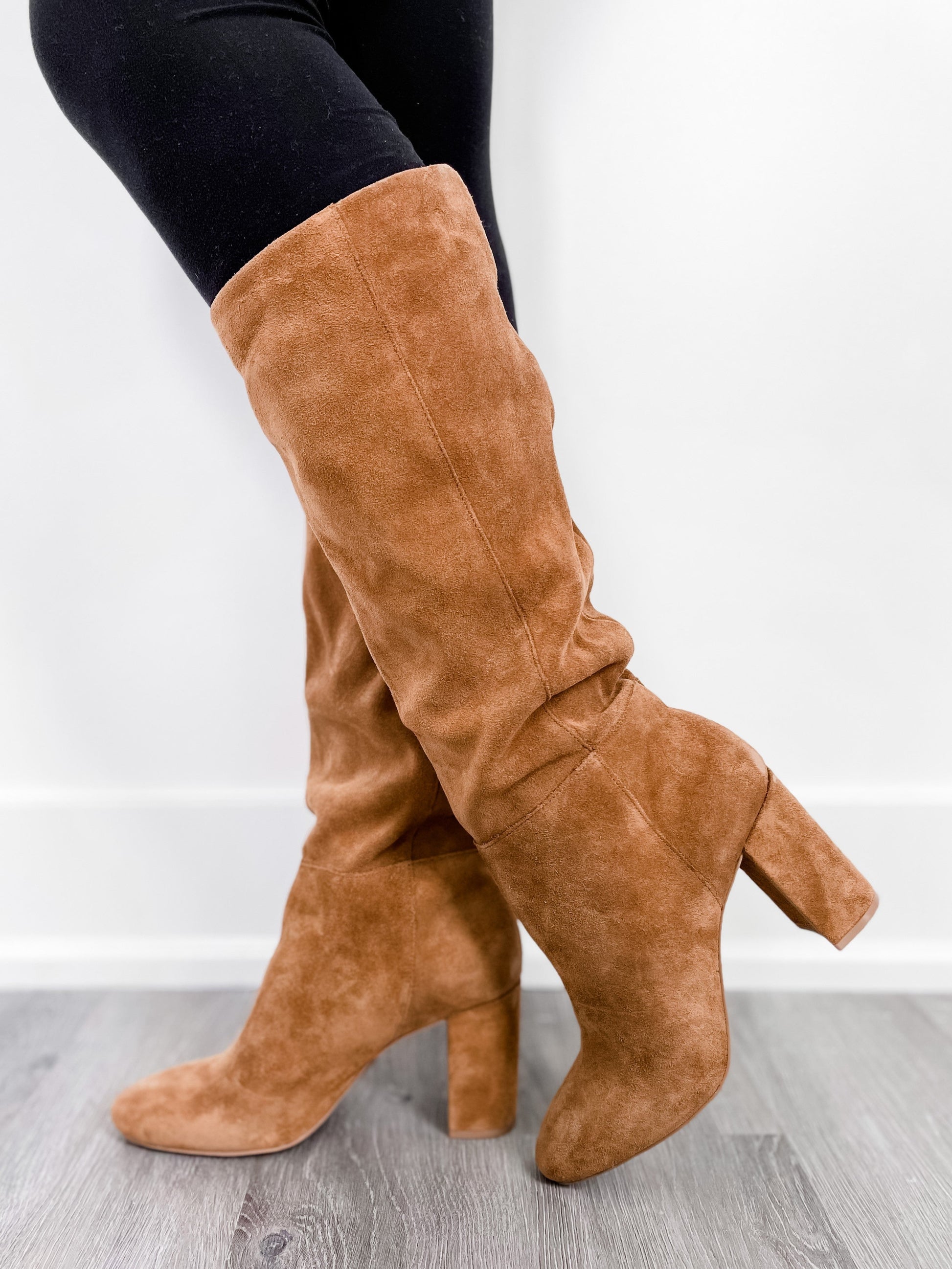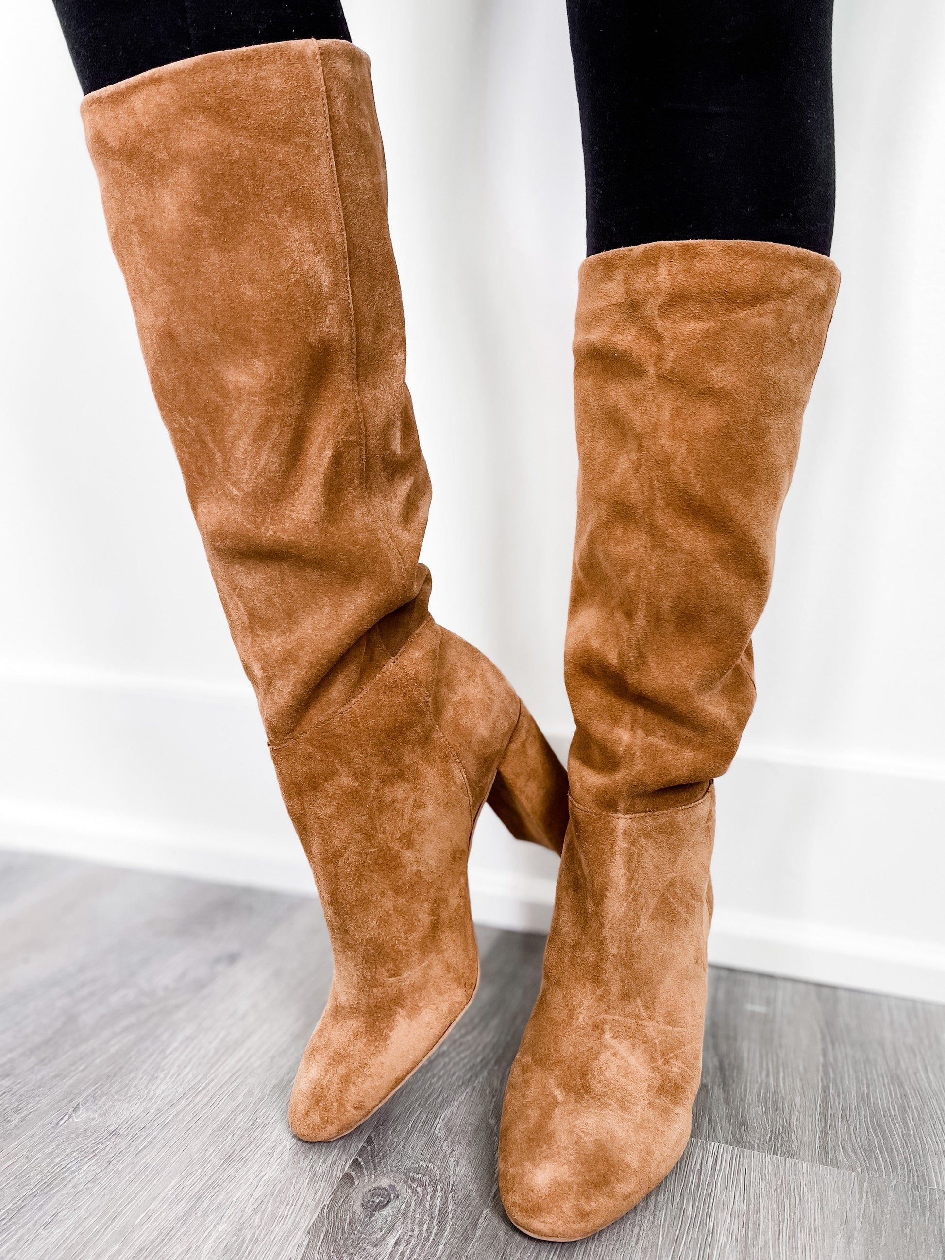 Slip into these honey-brown stunners and stride with confidence! These high-heeled pull-on boots, wrapped in soft vegan suede, bring a touch of laid-back glam to your wardrobe. Featuring a pointed toe, block heel, and knee height, these boots are sure to add so much style and class to your outfits! Wear them with skirts and dresses and layer over denim and leggings in the colder months for a stylish look that works for every season!