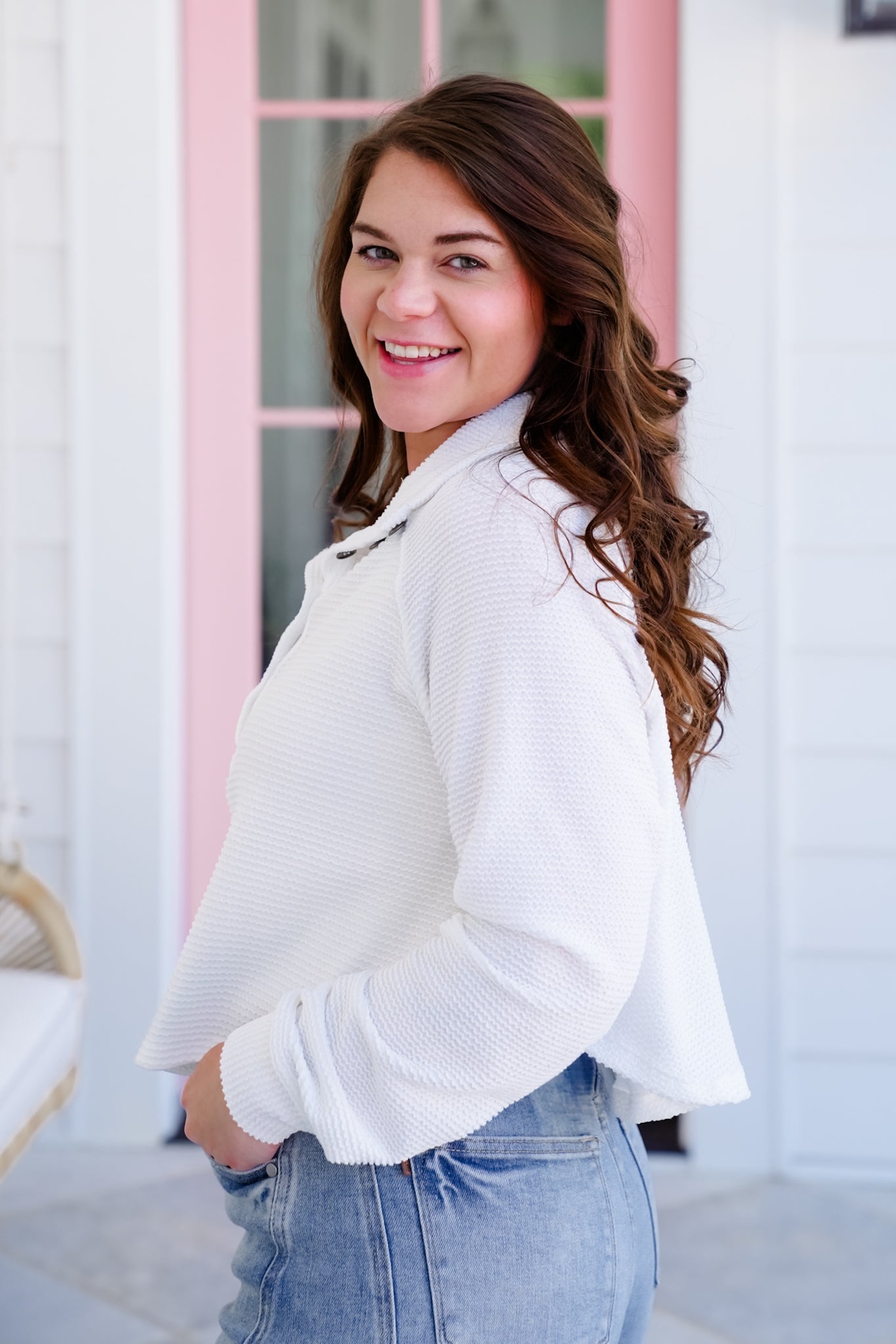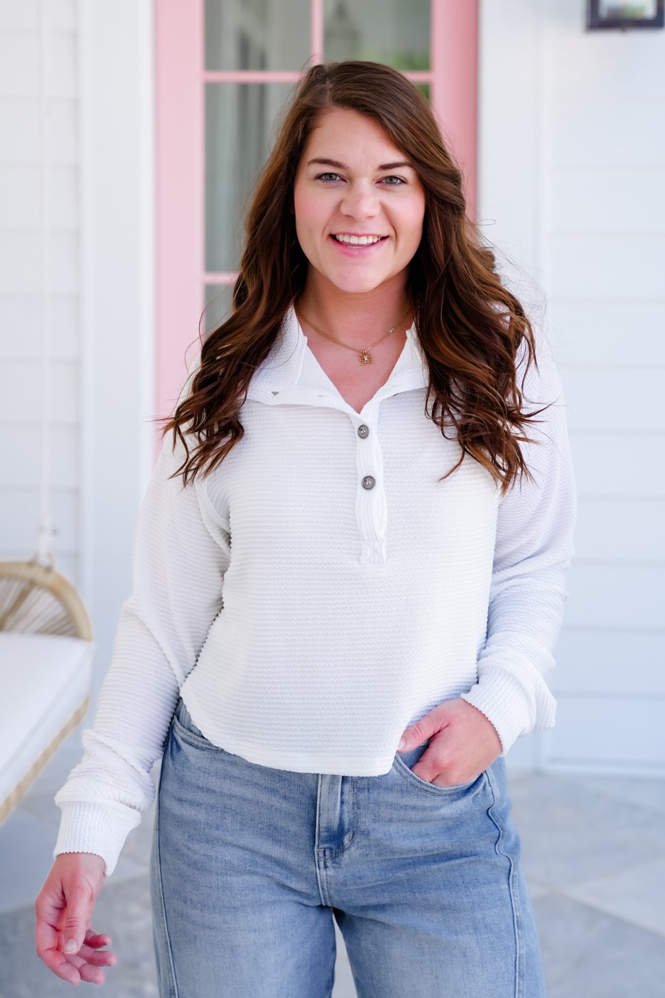 This ivory button-up brings an elevated twist to loungewear with its soft texture and effortless drape. Those oversized buttons and cozy fit make it cute enough for coffee runs and comfy enough for couch days. Pair it with denim shorts, joggers, or the matching bottoms for an easy weekend uniform.