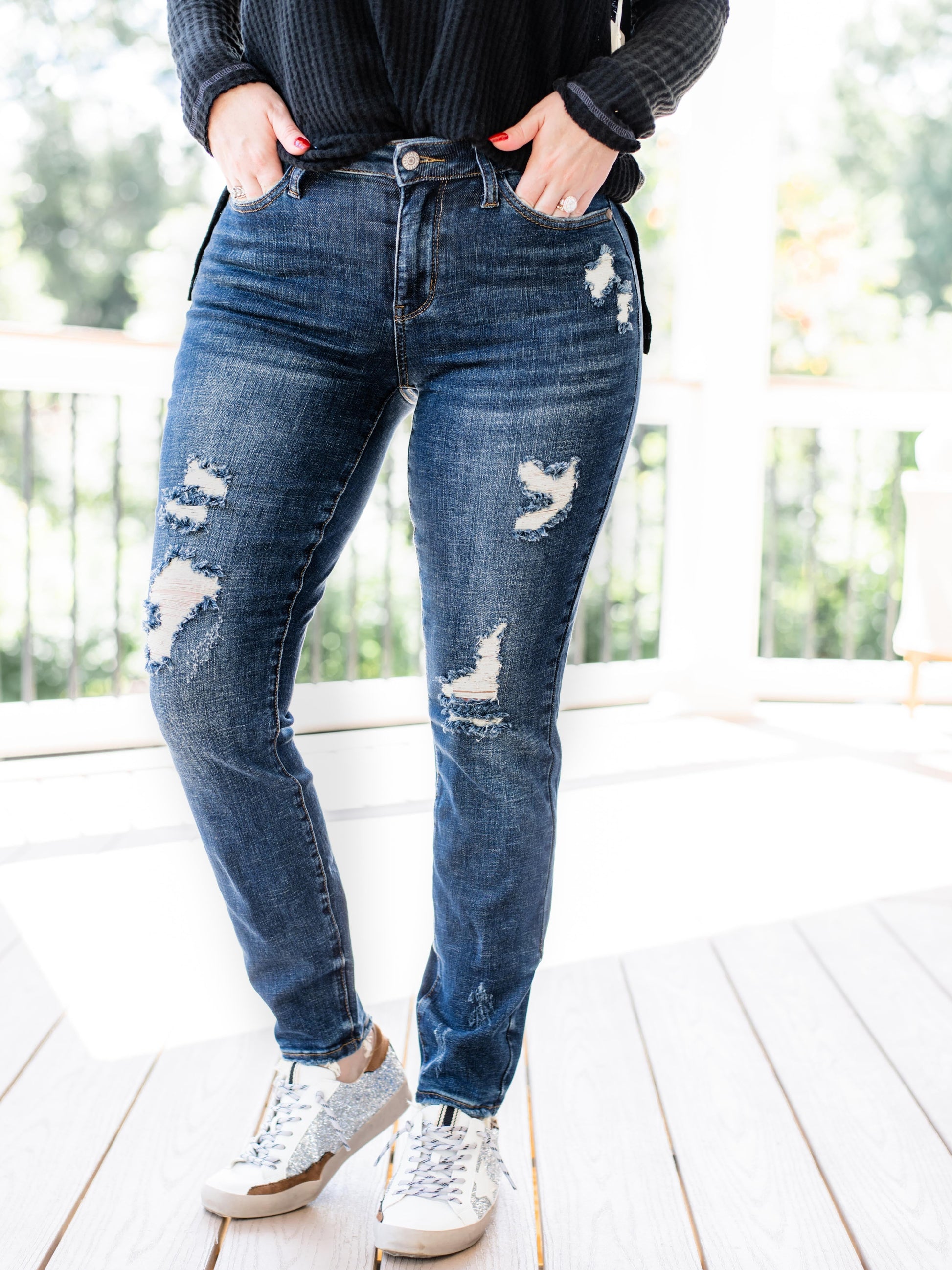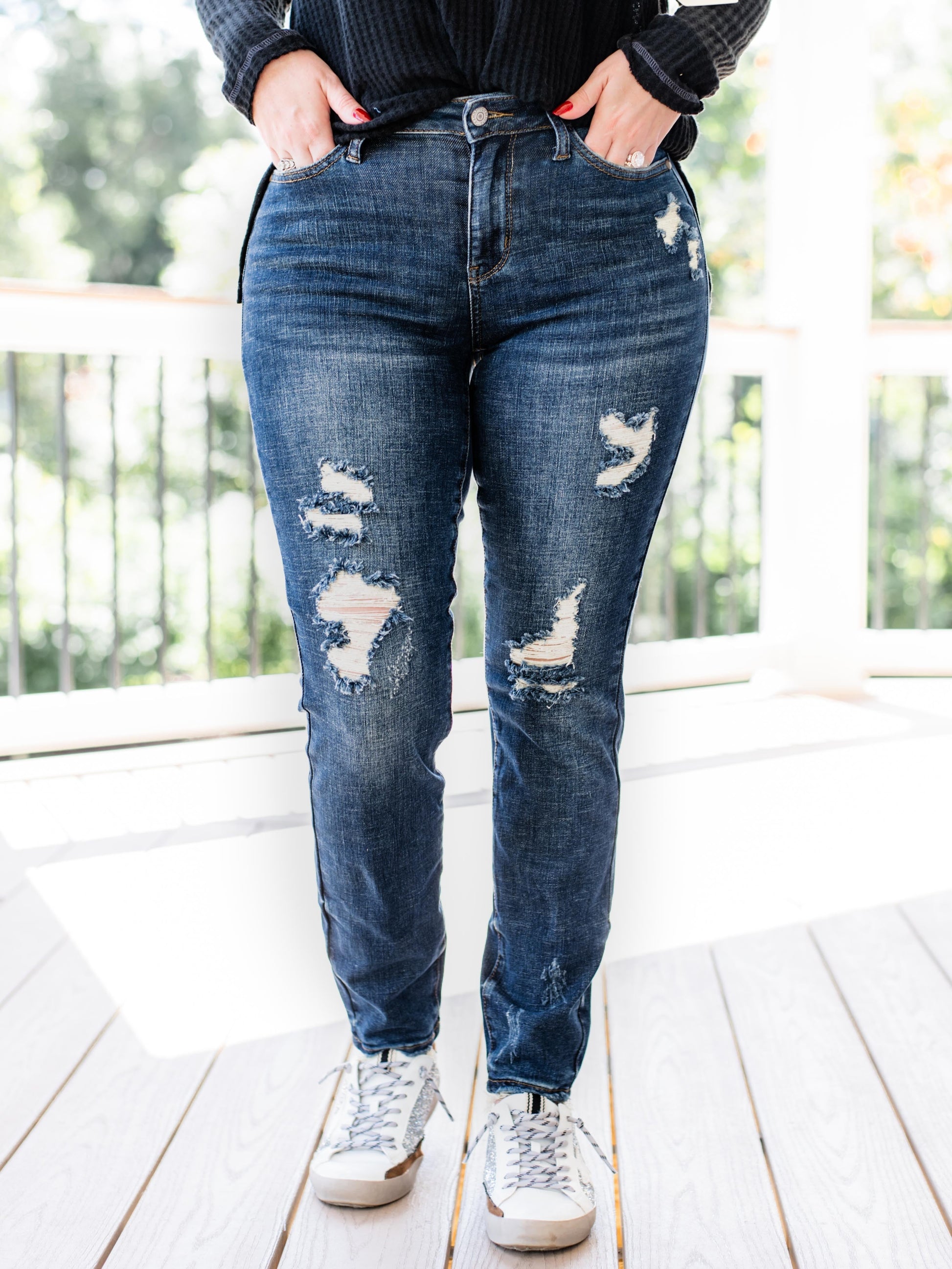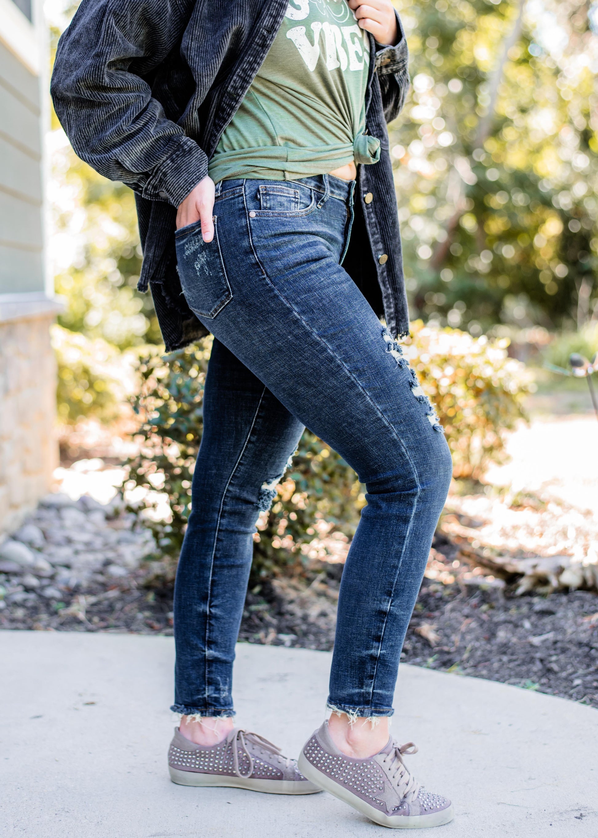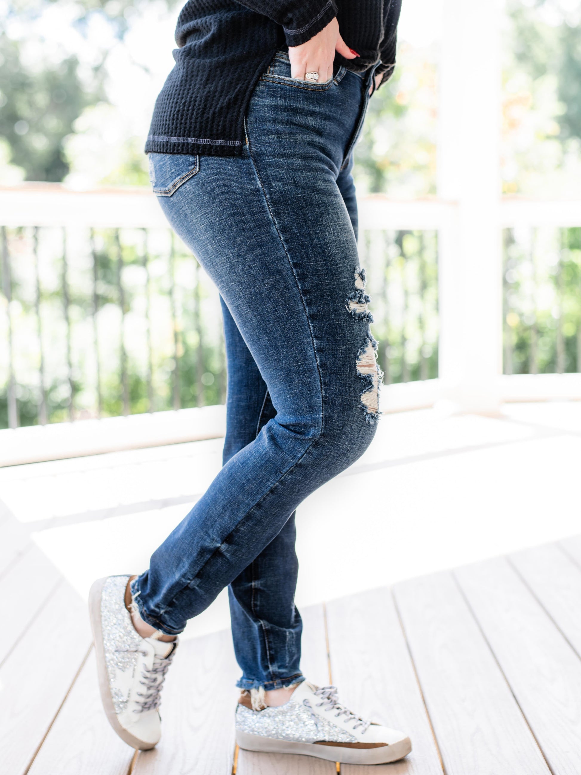 There's something so eyecatching about dark wash denim! This pair of Judy Blues is no exception! This jean is a relaxed fit style with an added touch of distressing - nothing too crazy, but enough to make a statement! They can go casual or classy y'all, they look just as hot with a pair of boots and a snazzy blazer as they do with ShuShop sneakers and a graphic tee! Get you some!