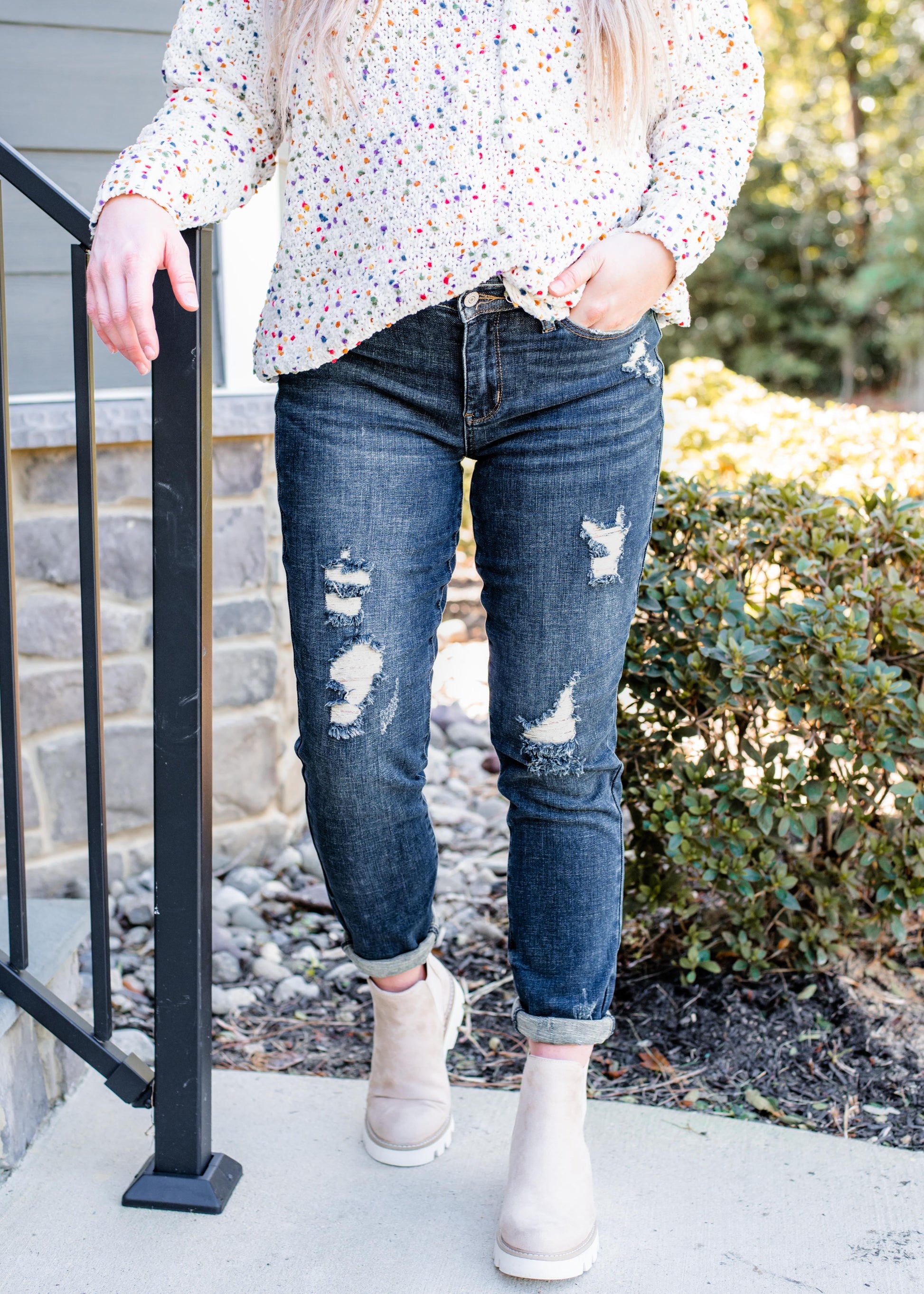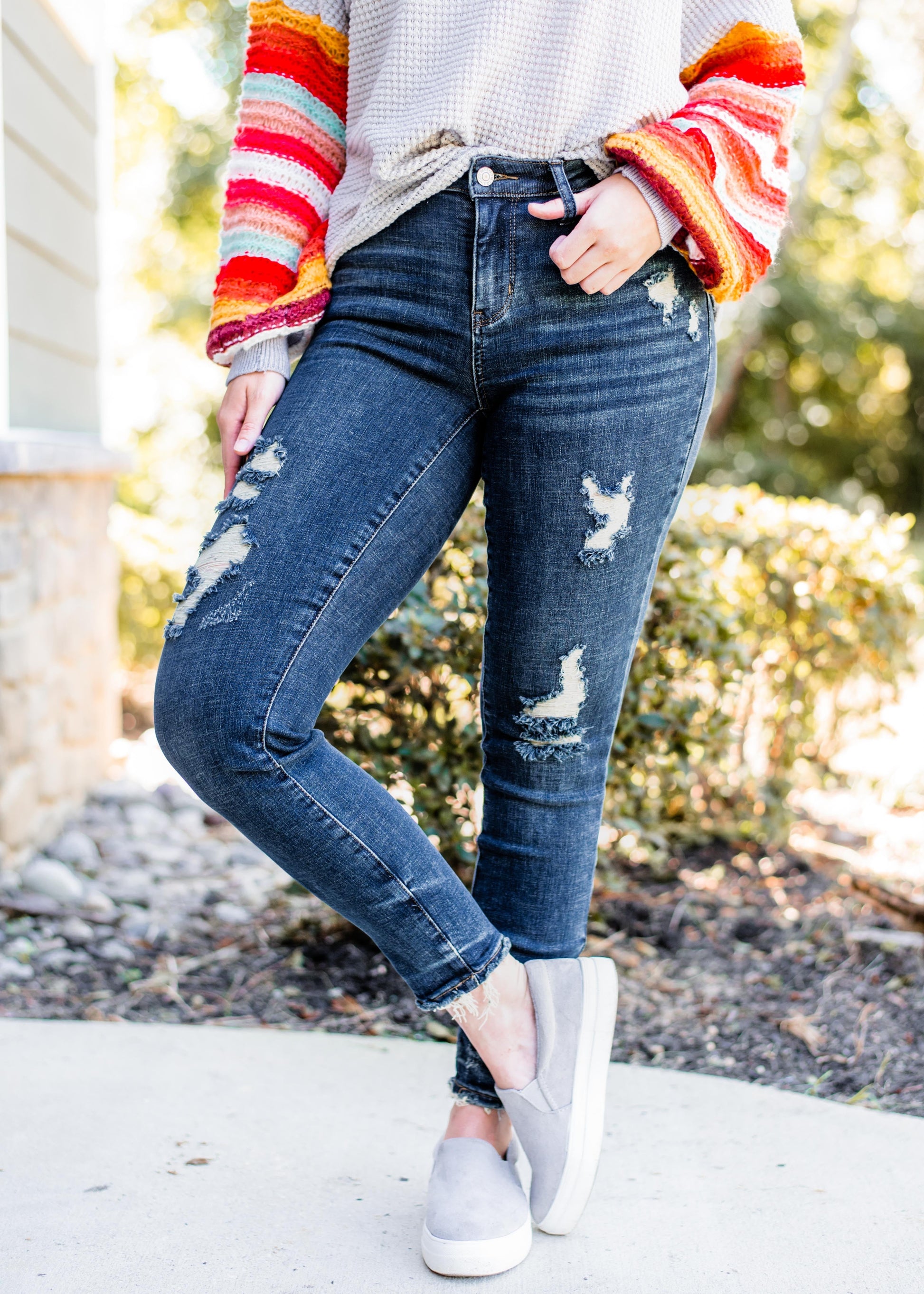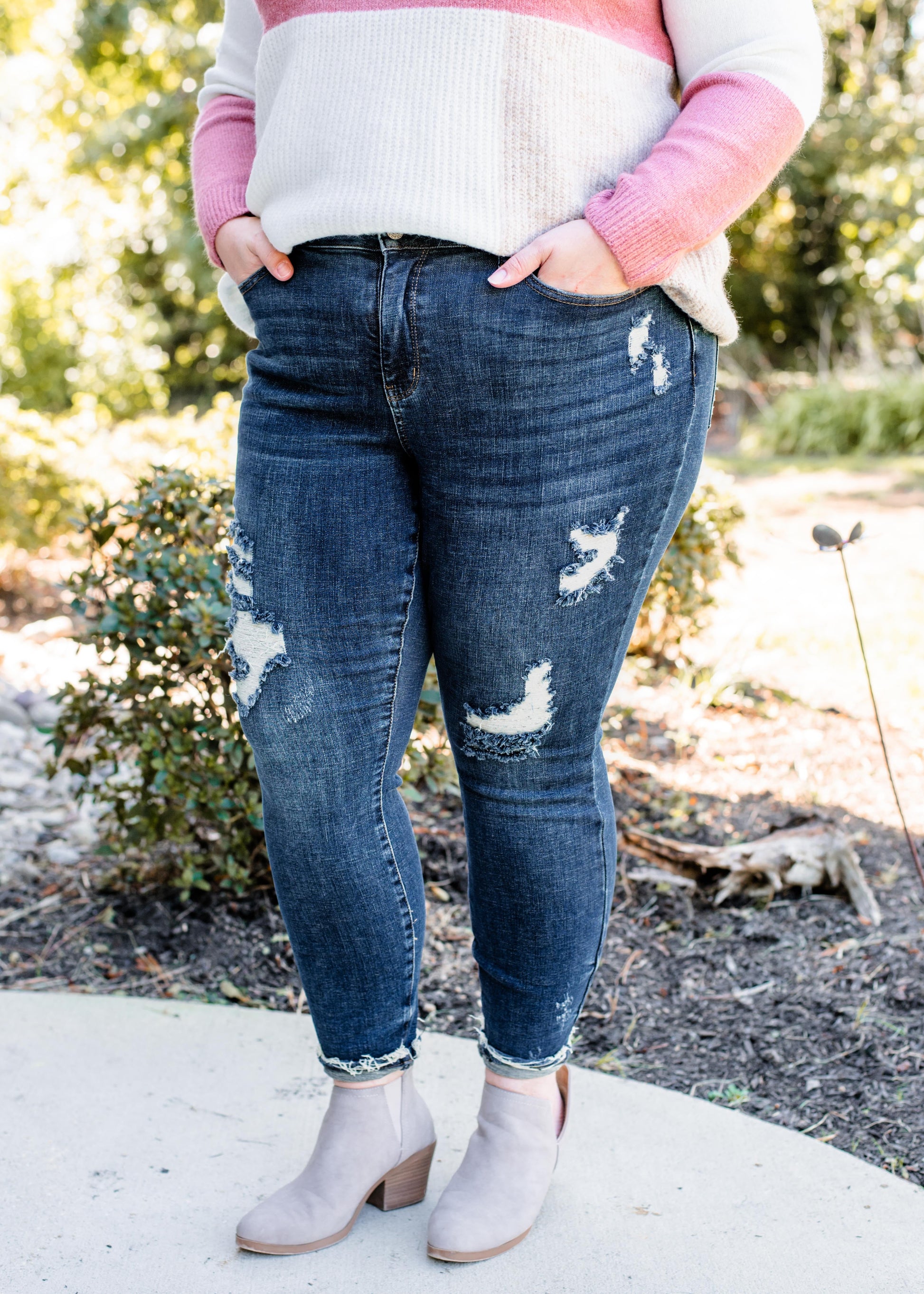 There's something so eyecatching about dark wash denim! This pair of Judy Blues is no exception! This jean is a relaxed fit style with an added touch of distressing - nothing too crazy, but enough to make a statement! They can go casual or classy y'all, they look just as hot with a pair of boots and a snazzy blazer as they do with ShuShop sneakers and a graphic tee! Get you some!
