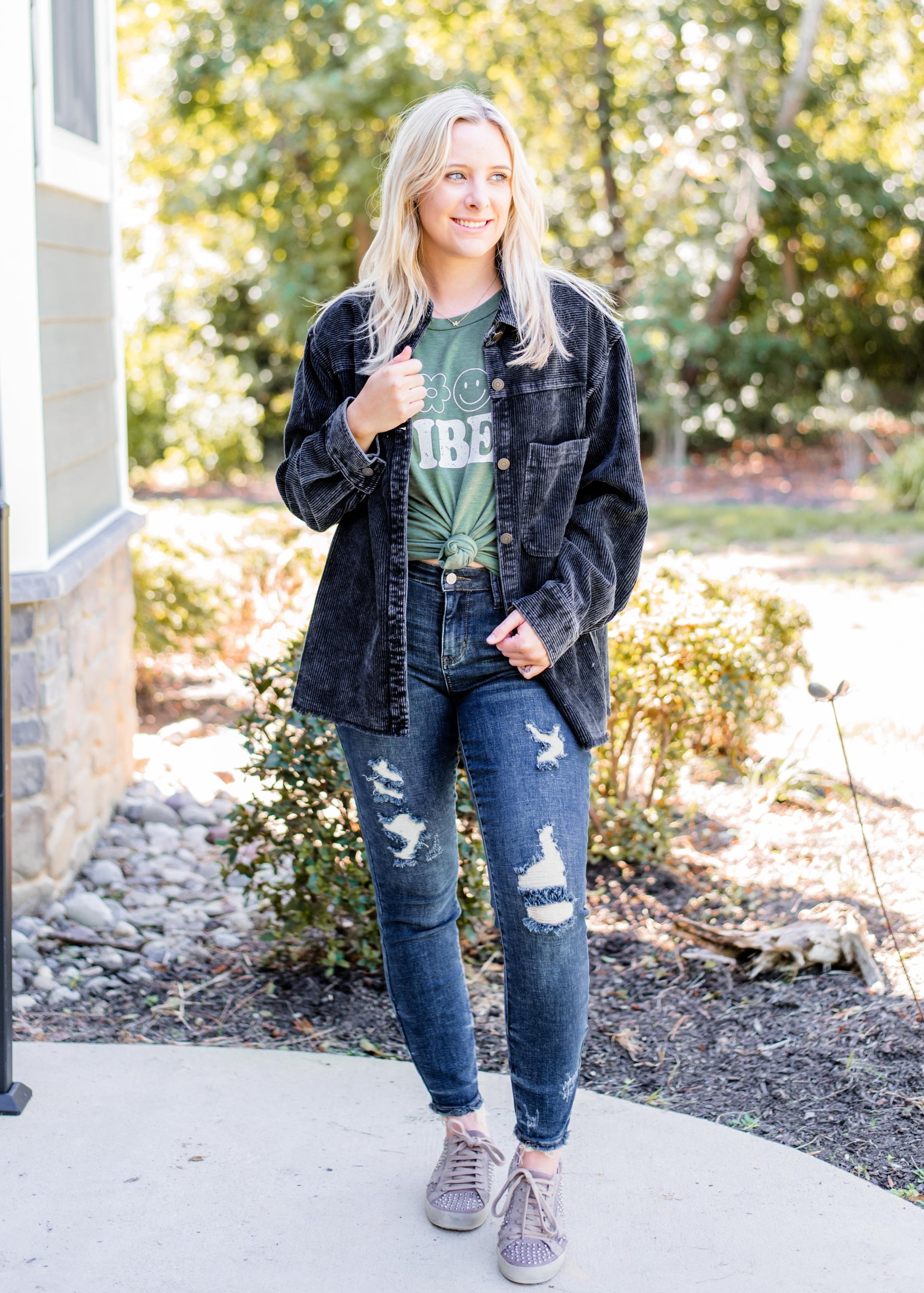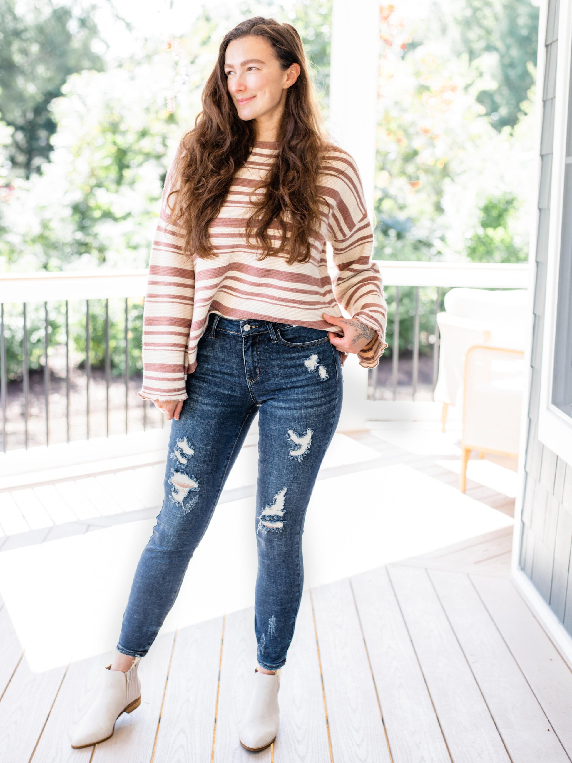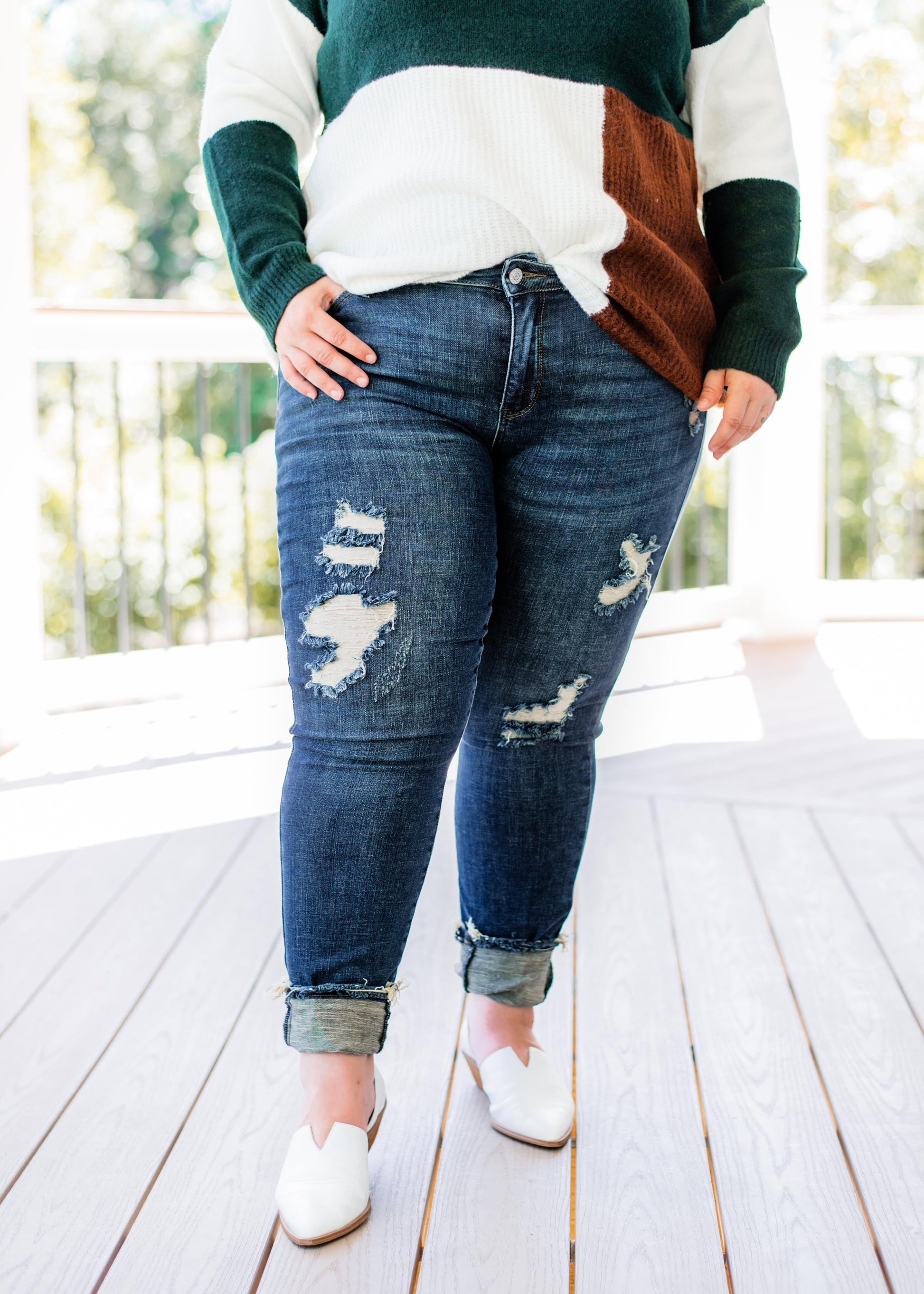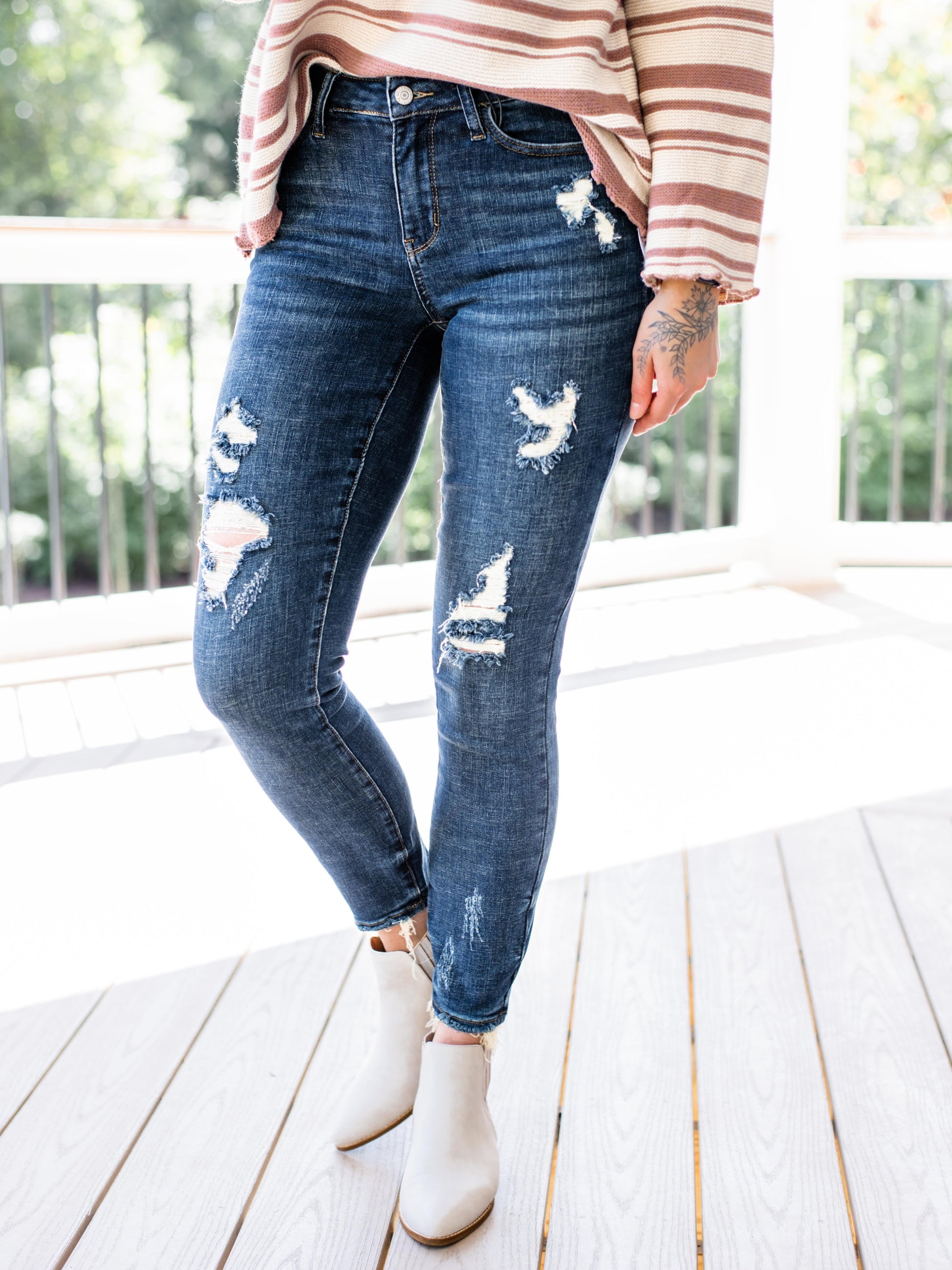 There's something so eyecatching about dark wash denim! This pair of Judy Blues is no exception! This jean is a relaxed fit style with an added touch of distressing - nothing too crazy, but enough to make a statement! They can go casual or classy y'all, they look just as hot with a pair of boots and a snazzy blazer as they do with ShuShop sneakers and a graphic tee! Get you some!