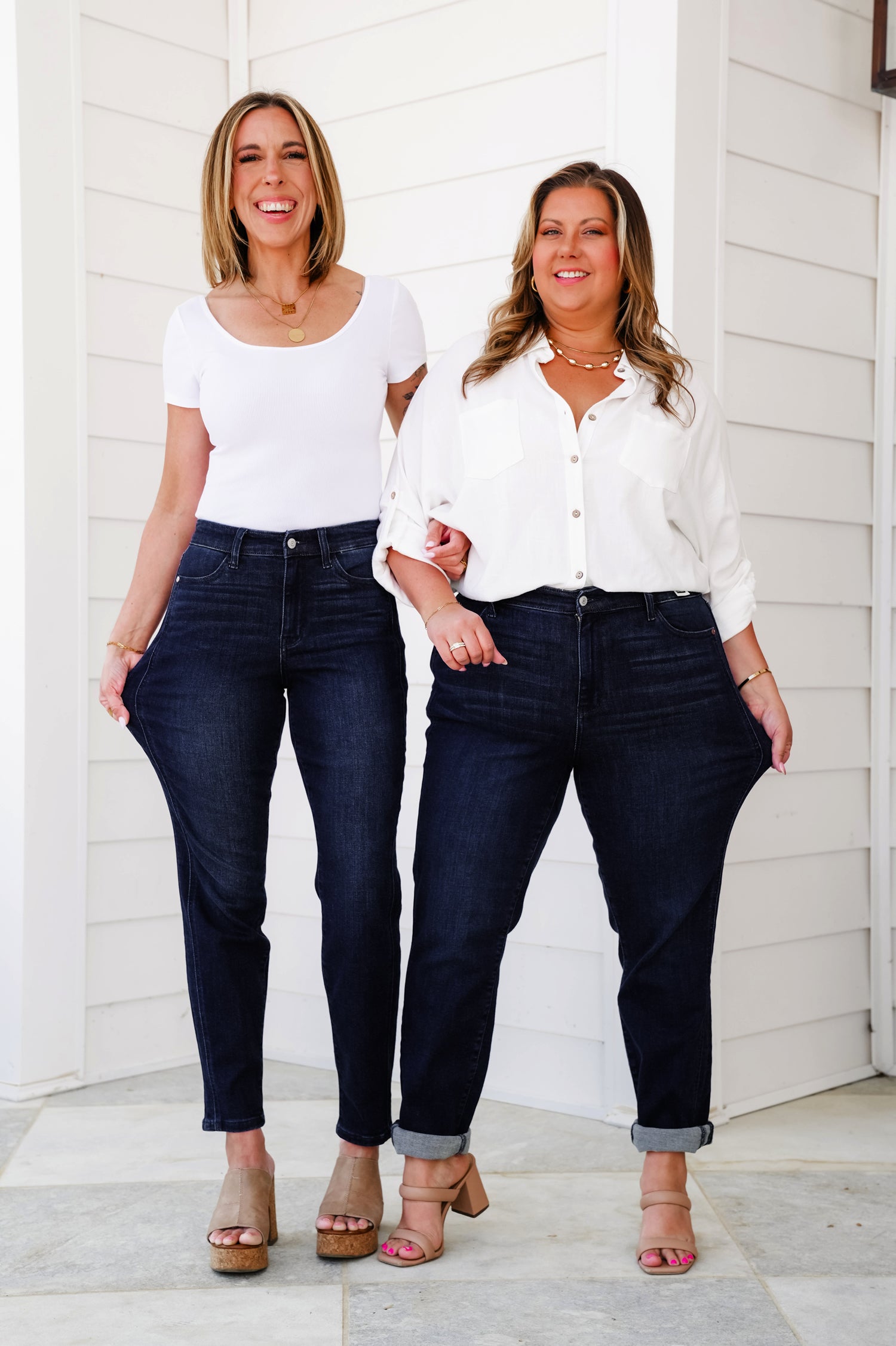 These Judy Blue boyfriend jeans are relaxed throughout, and feature a stunning dark wash, gorgeous graining and seaming detail on the sides that flatter your shape. They have zero distressing and come to you cuffed at the hem! They have a finished hem, and you can uncuff them for a bit more length for our long-legged ladies! The high-rise waist to keep you tucked in and secure. Wear them with everything from graphic tops and basic tees to flowy blouses and layering pieces!