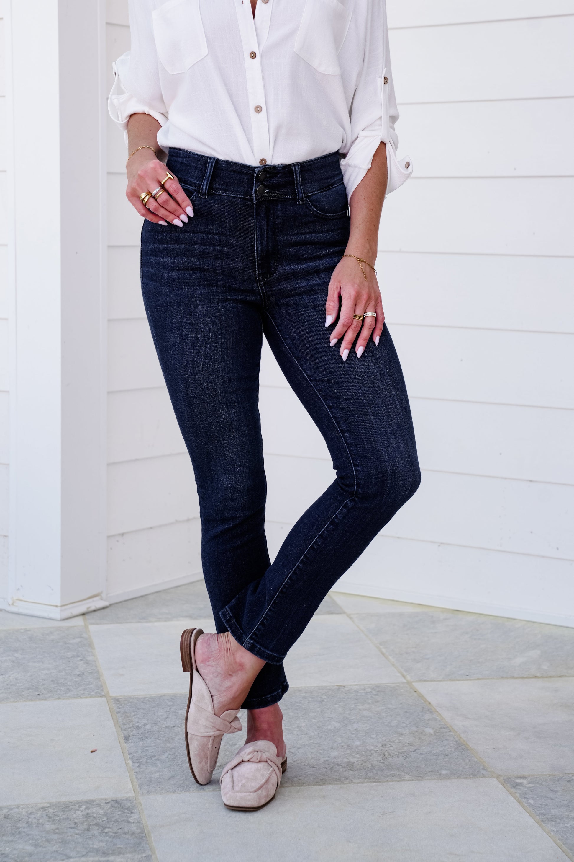 These polished Judy Blue capris are the ultimate blend of classy and casual! The rich dark wash and non-distressed finish give them a sleek, put-together vibe, while the double button waistband flatters your waist and adds a chic touch. Wide cuffs at the hem keep things modern, and the slim straight leg creates a silhouette that works beautifully for both work and play.