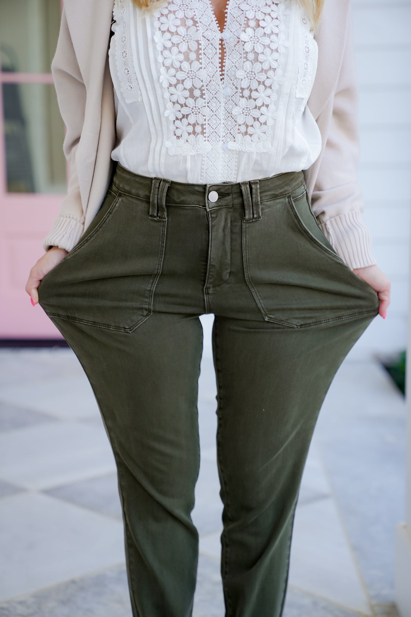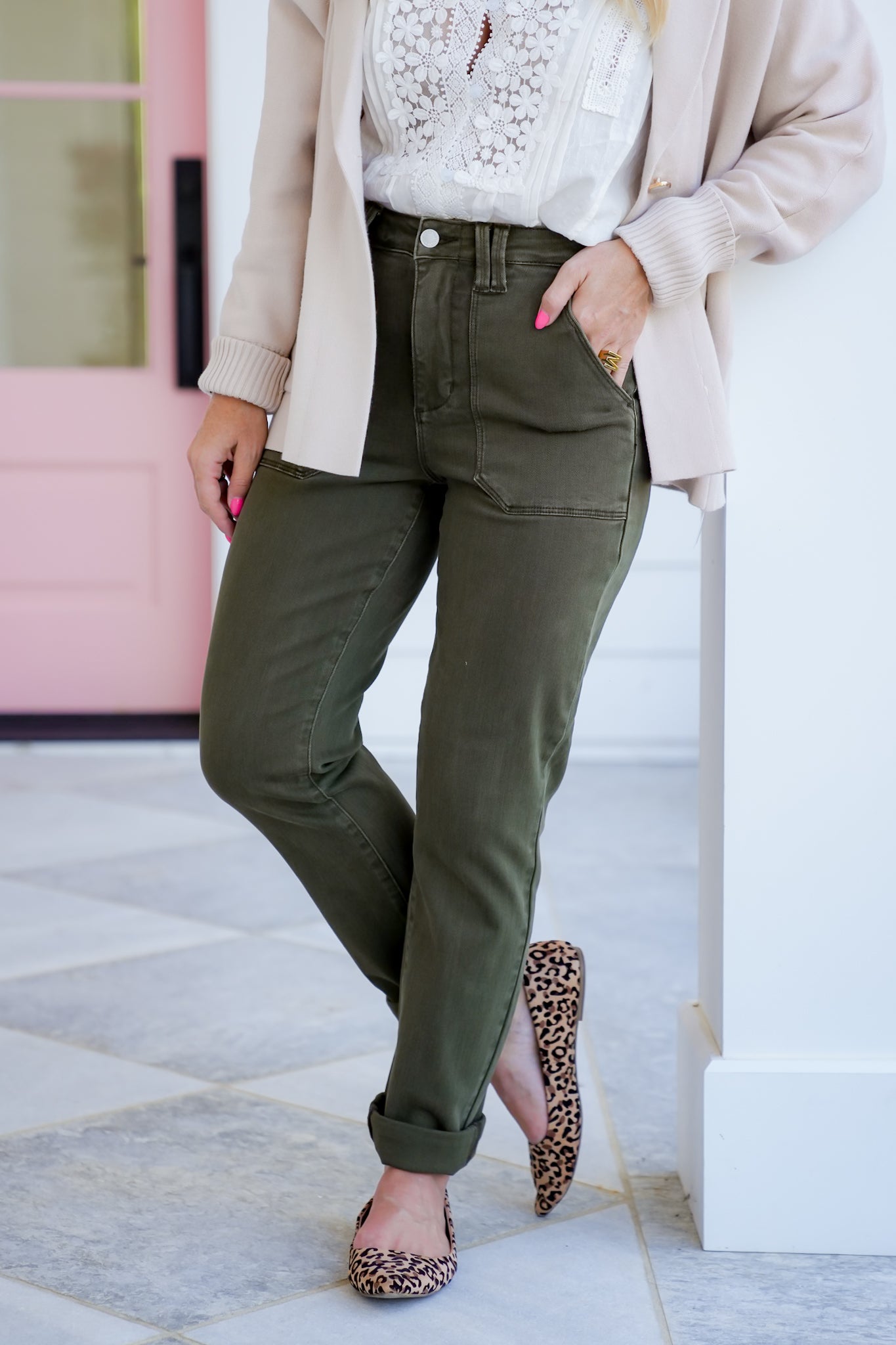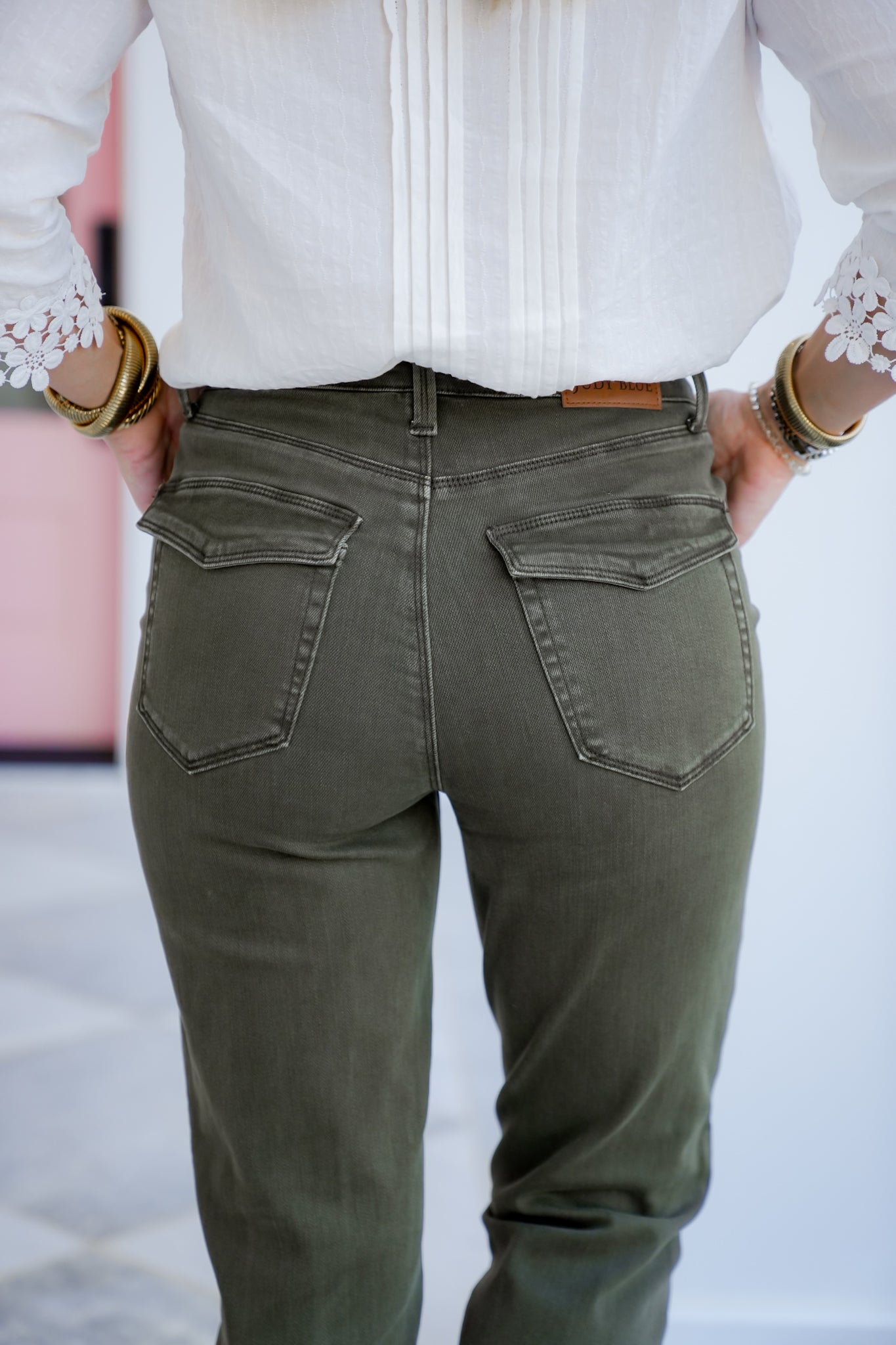 These Judy Blue green cuffed jeans are the style upgrade your closet has been craving! The high-rise design smooths and flatters, while the unique green tone brings a fresh, modern twist to denim. With trouser-inspired pocket details and a sewn cuff, these jeans strike the perfect balance between casual chic and polished style. Dress them up with a feminine blouse and heels or keep it relaxed with sneakers and a graphic tee, you’ll love how versatile they are.