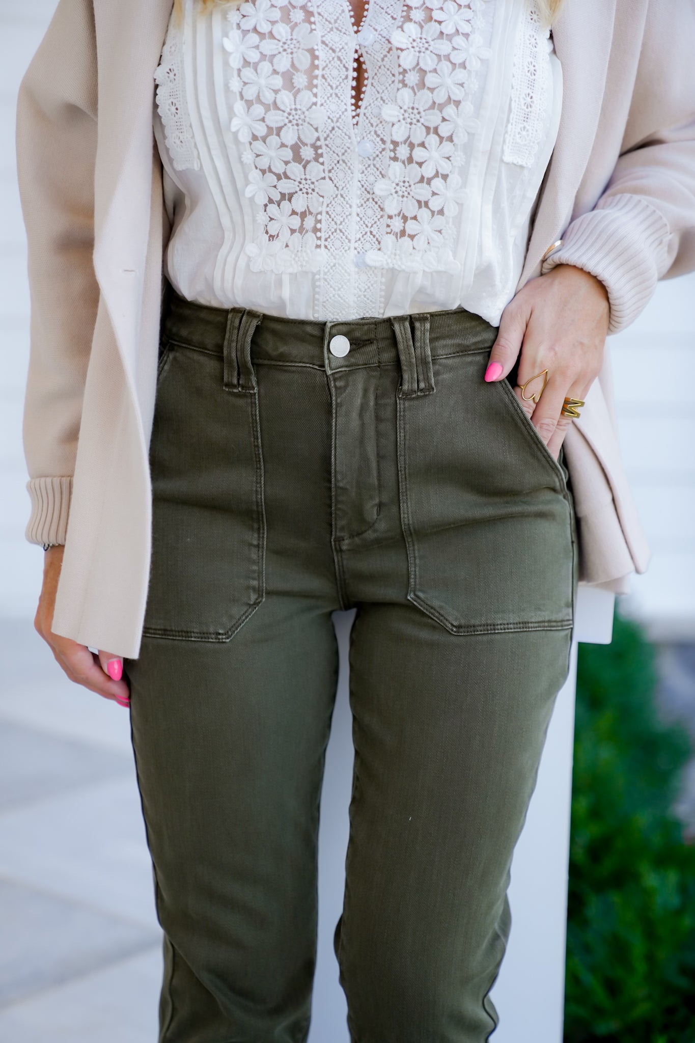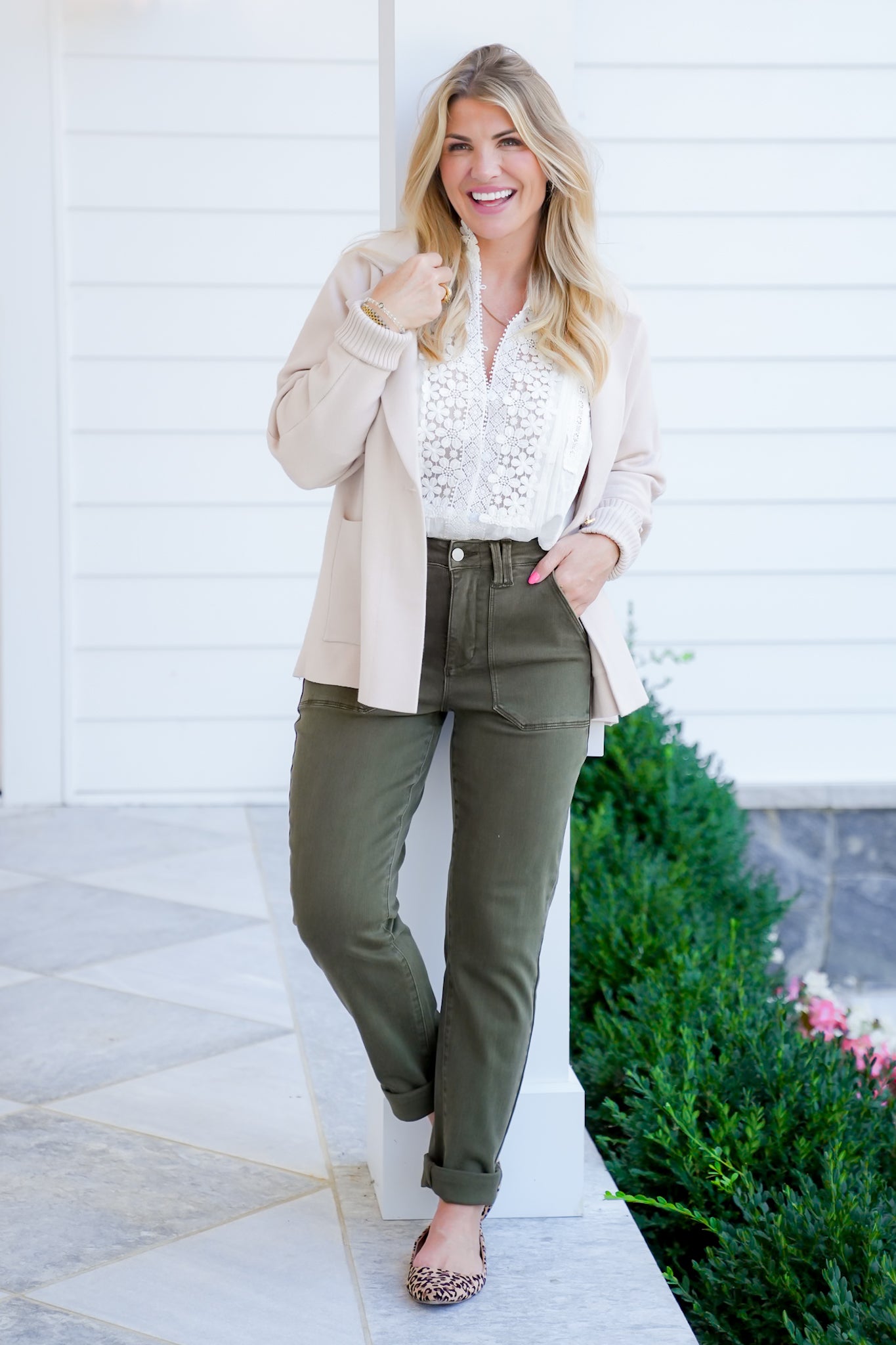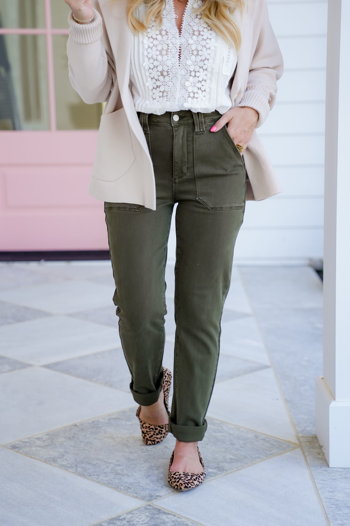 These Judy Blue green cuffed jeans are the style upgrade your closet has been craving! The high-rise design smooths and flatters, while the unique green tone brings a fresh, modern twist to denim. With trouser-inspired pocket details and a sewn cuff, these jeans strike the perfect balance between casual chic and polished style. Dress them up with a feminine blouse and heels or keep it relaxed with sneakers and a graphic tee, you’ll love how versatile they are.