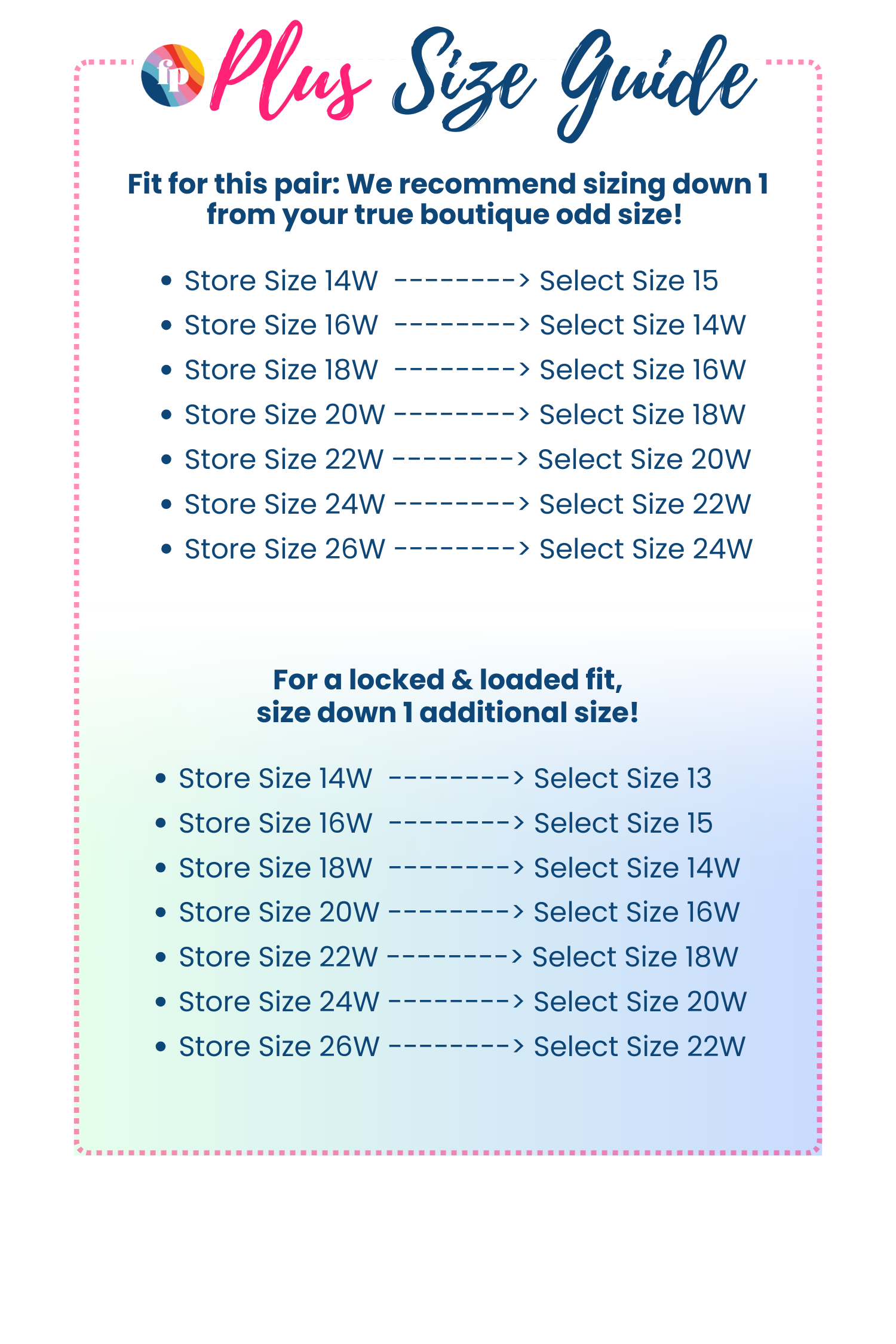 Plus (sizes 14W-24W): Size down 1 from your true size for the best fit. If you prefer a more fitted fit, you can size down two.