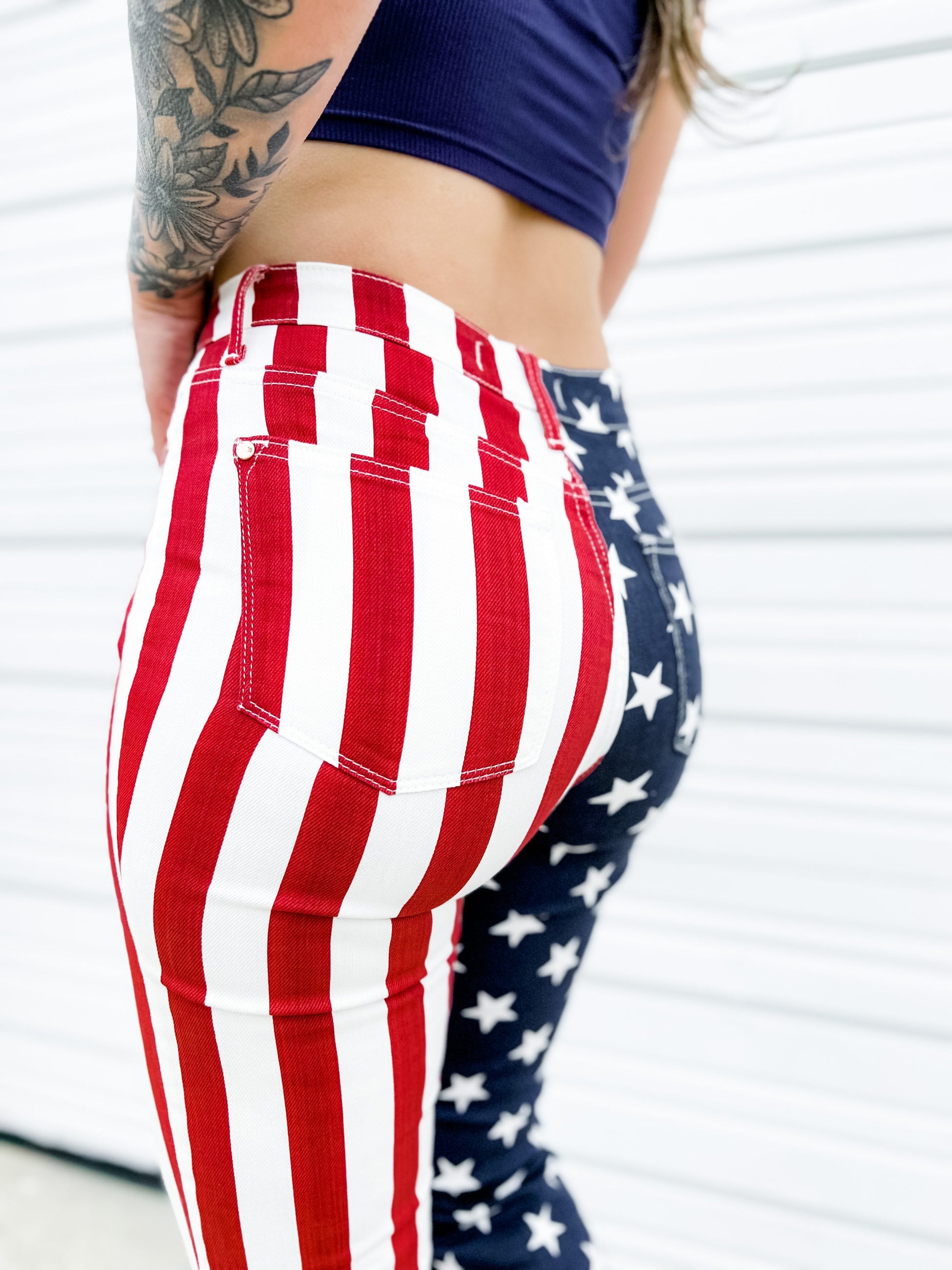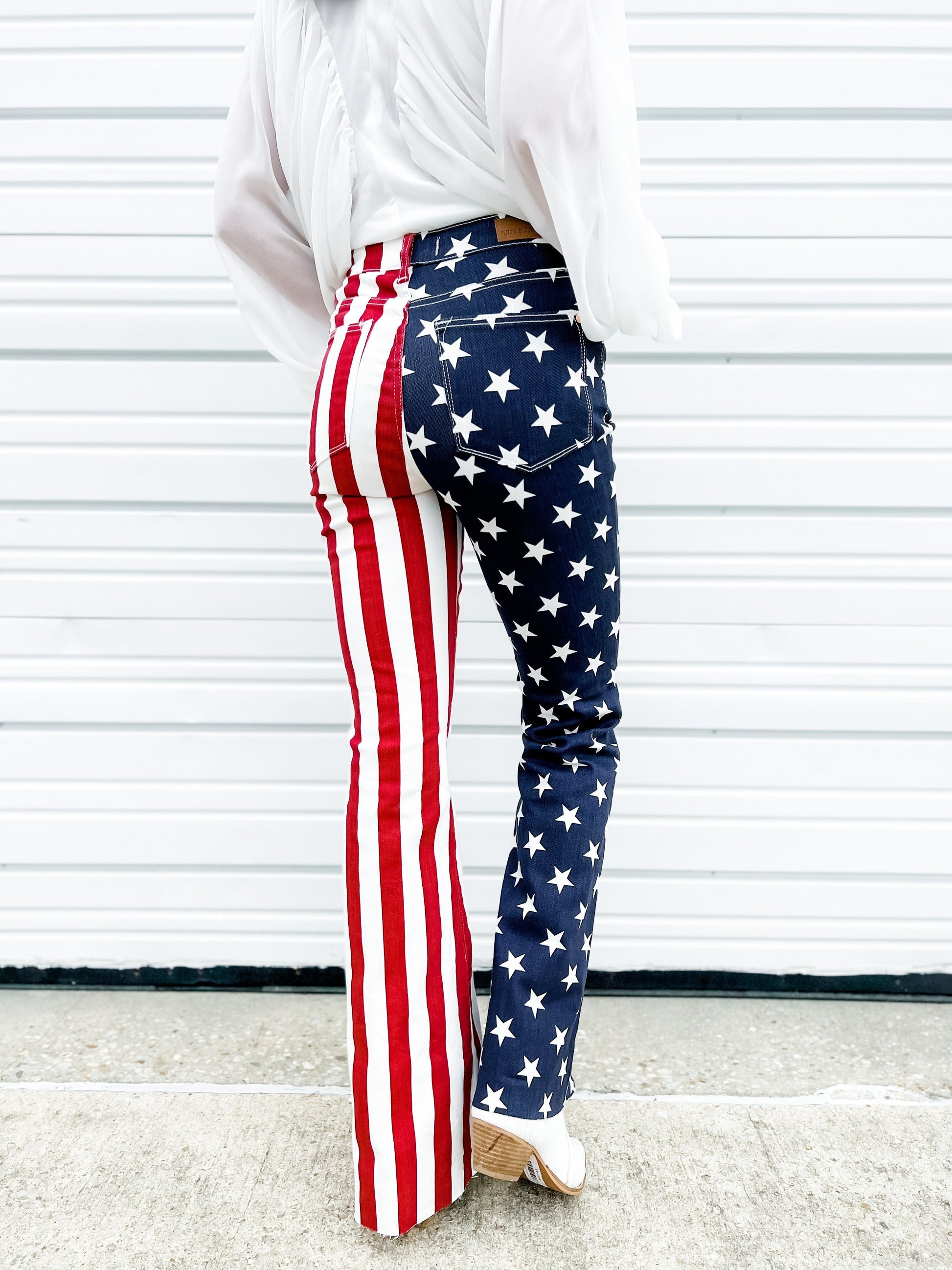 Judy Blue High Rise Stars and Stripes Print Raw Hem Flare Jeans