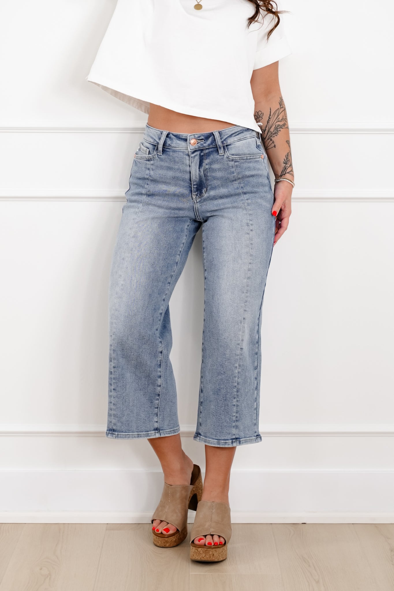 Judy Blue The Carolina Mid Rise Light Wash Crop Wide Leg Jeans with Center Seam