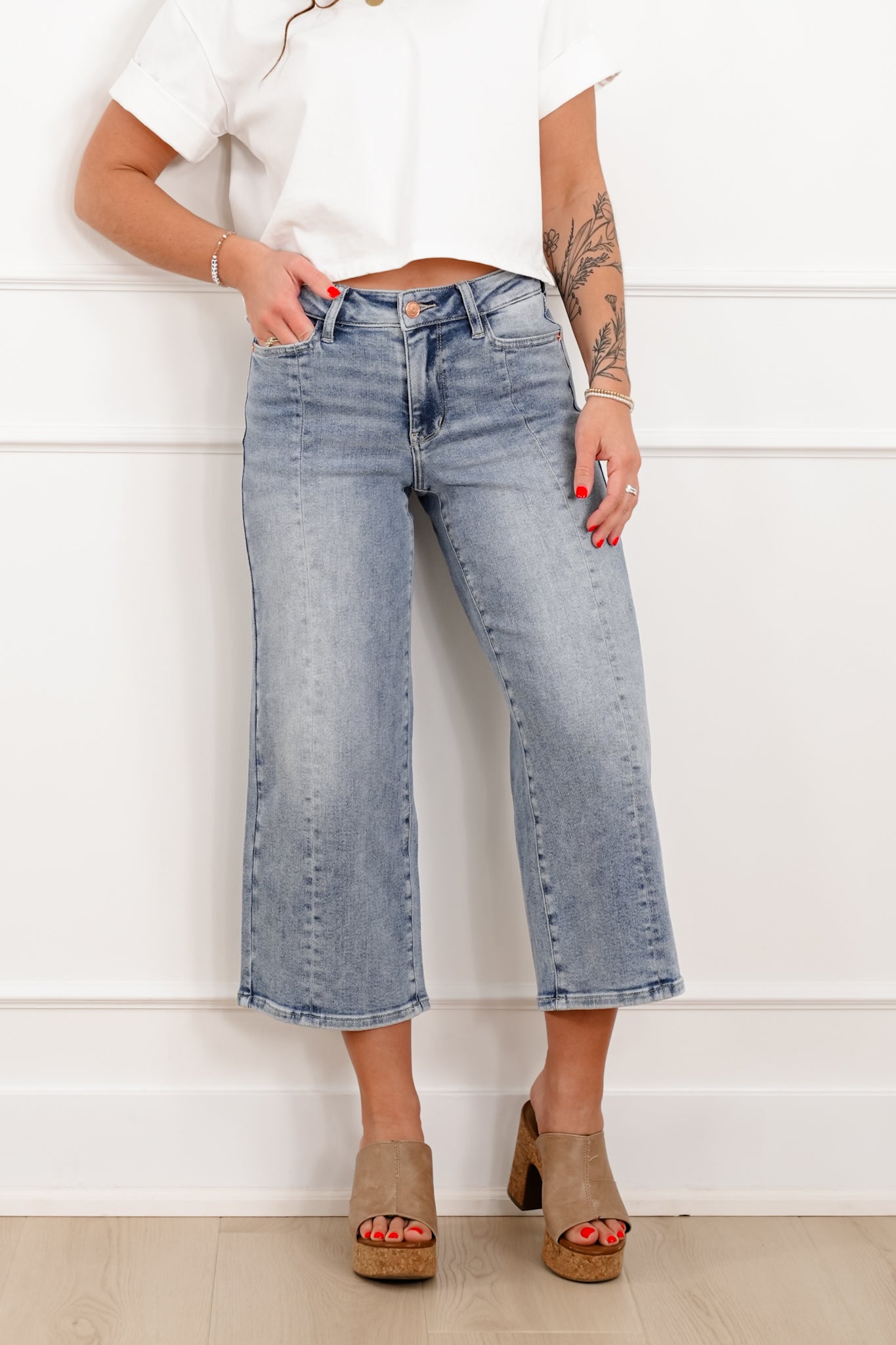 This pair gives you that modern, elevated denim look without sacrificing comfort. The cropped wide leg silhouette and the vertical center seam elongates your legs beautifully. The light wash is easy to style year-round, and the non distressed design with a clean finished hem keeps the look polished and versatile. Pair them with a fitted tank and wedges for a chic vibe, or keep it casual with a tee and sneakers.