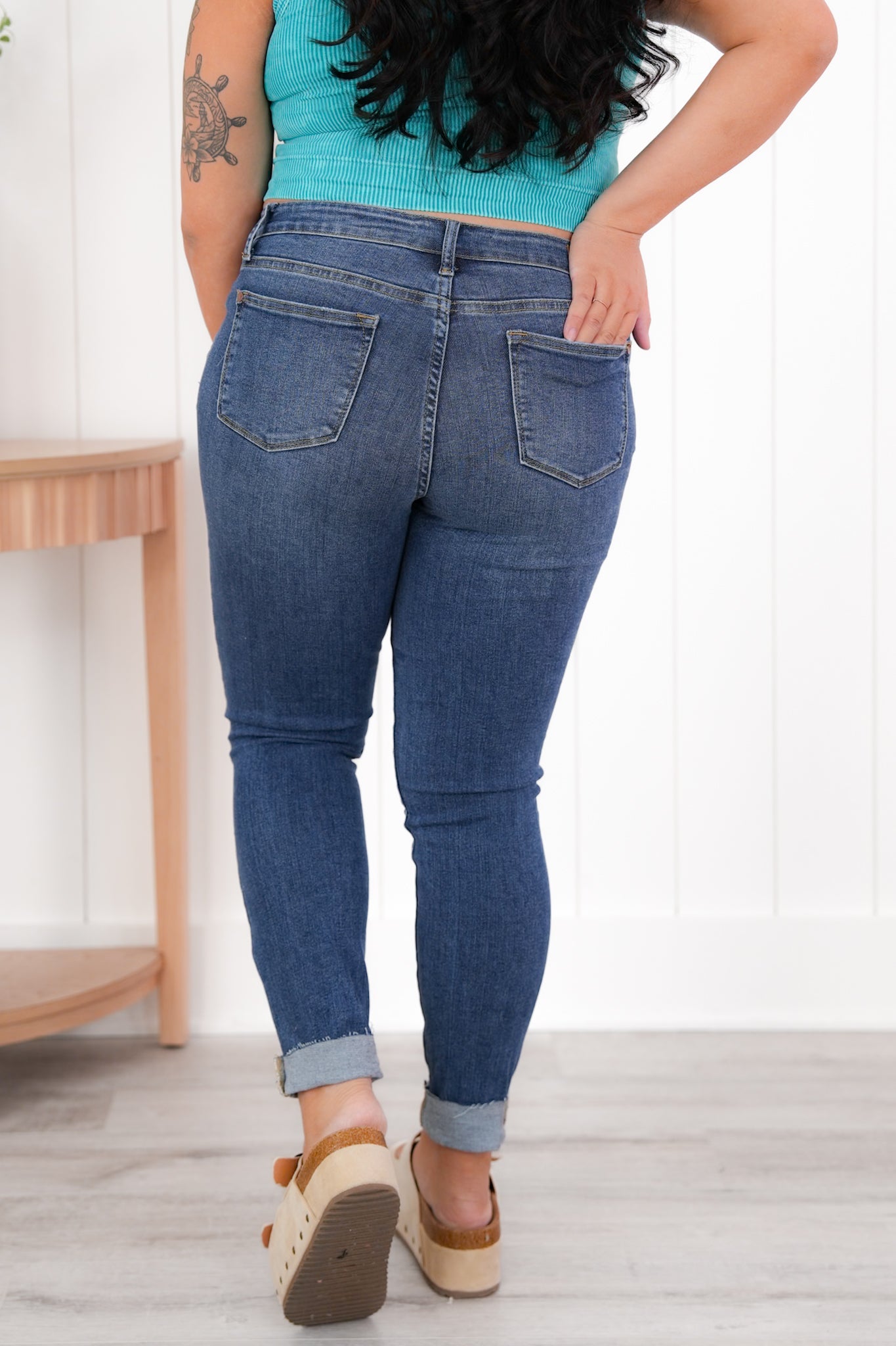 This pair is a dark-washed, mid-rise skinny with raw hems - so totally on-trend! The tummy panel is stretchy and comfortable without being binding, and there are pockets, so these look like "real" jeans (because they are!)