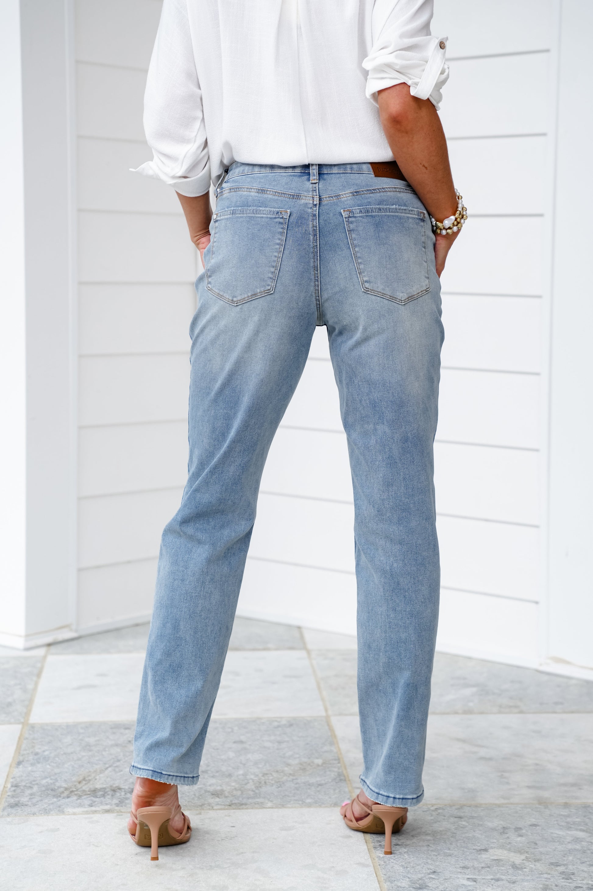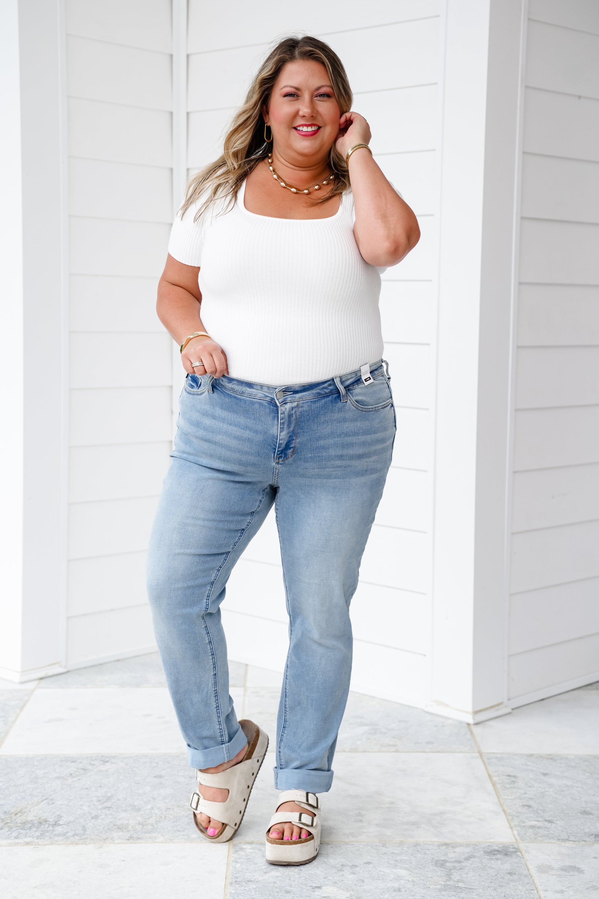These Judy Blue V Front Cuffed Boyfriend Jeans with Cool Denim are about to become your go-to pair. The flattering mid-rise and relaxed boyfriend fit deliver an easygoing vibe, while the V-front waistband adds a subtle contouring effect that visually slims the waistline.