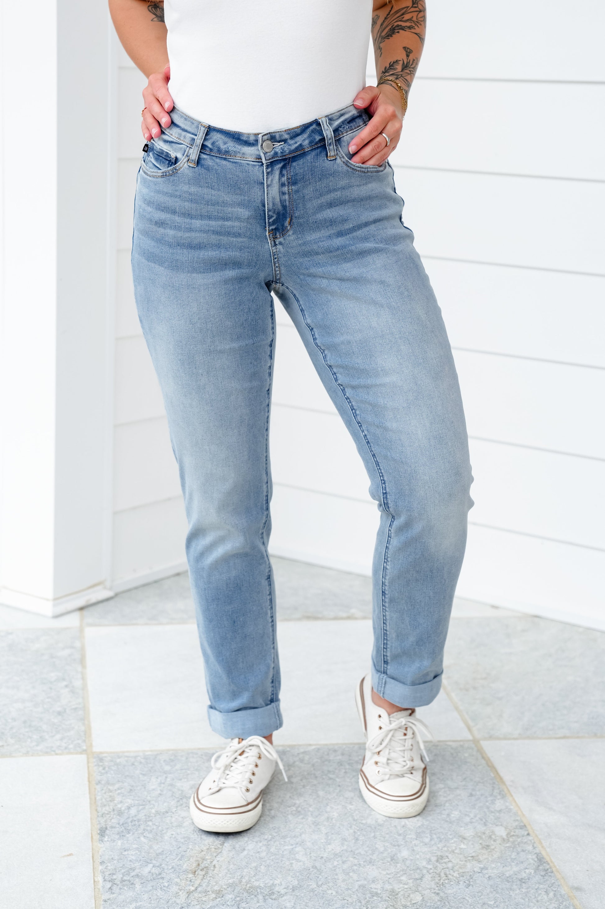 Judy Blue Riptide Mid Rise Medium Wash V Front Cuffed Boyfriend Jeans with Cool Denim