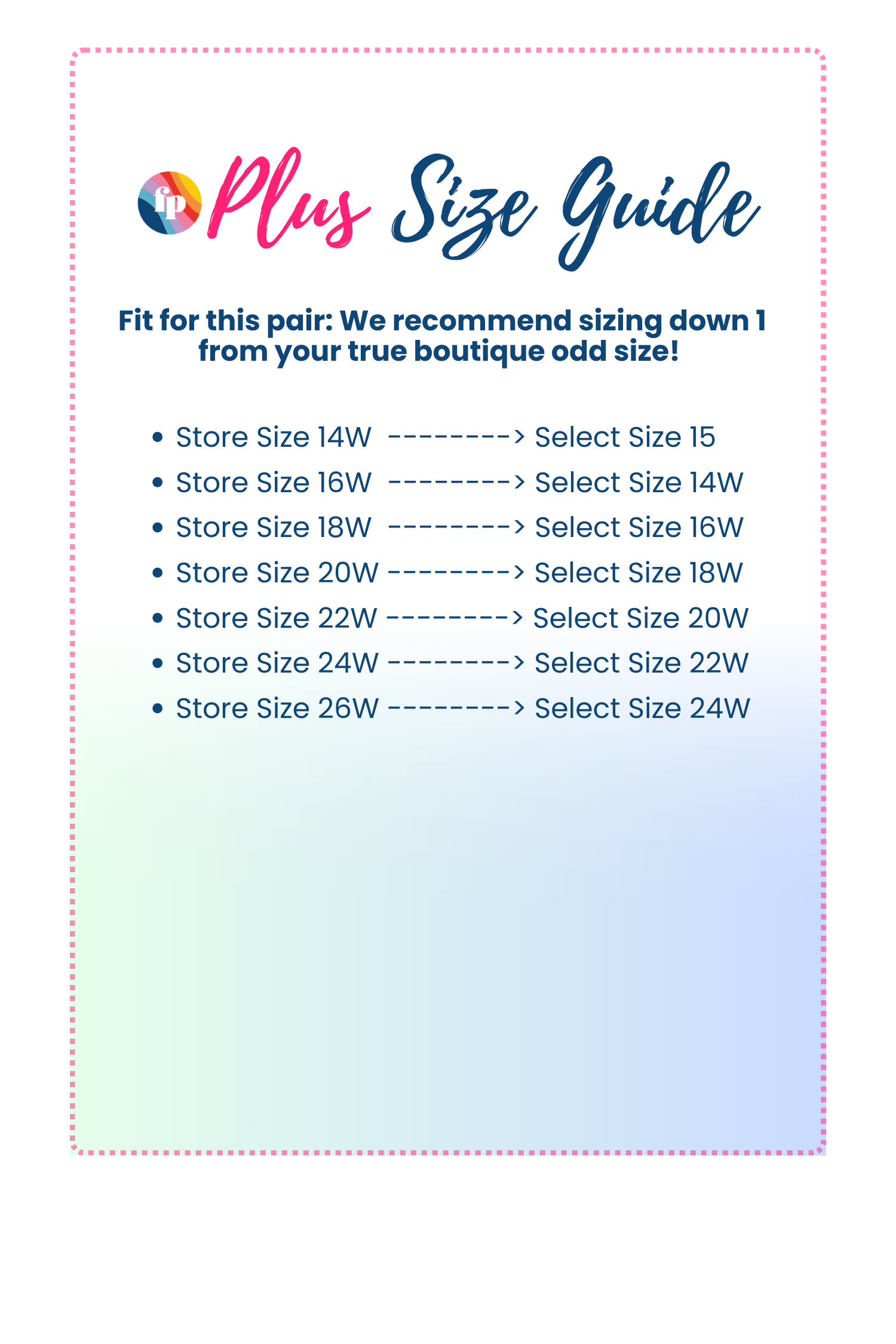 Sizes 14-24w: If you want a relaxed waist go true to size; if you want a more fitted fit, you can size down 1.