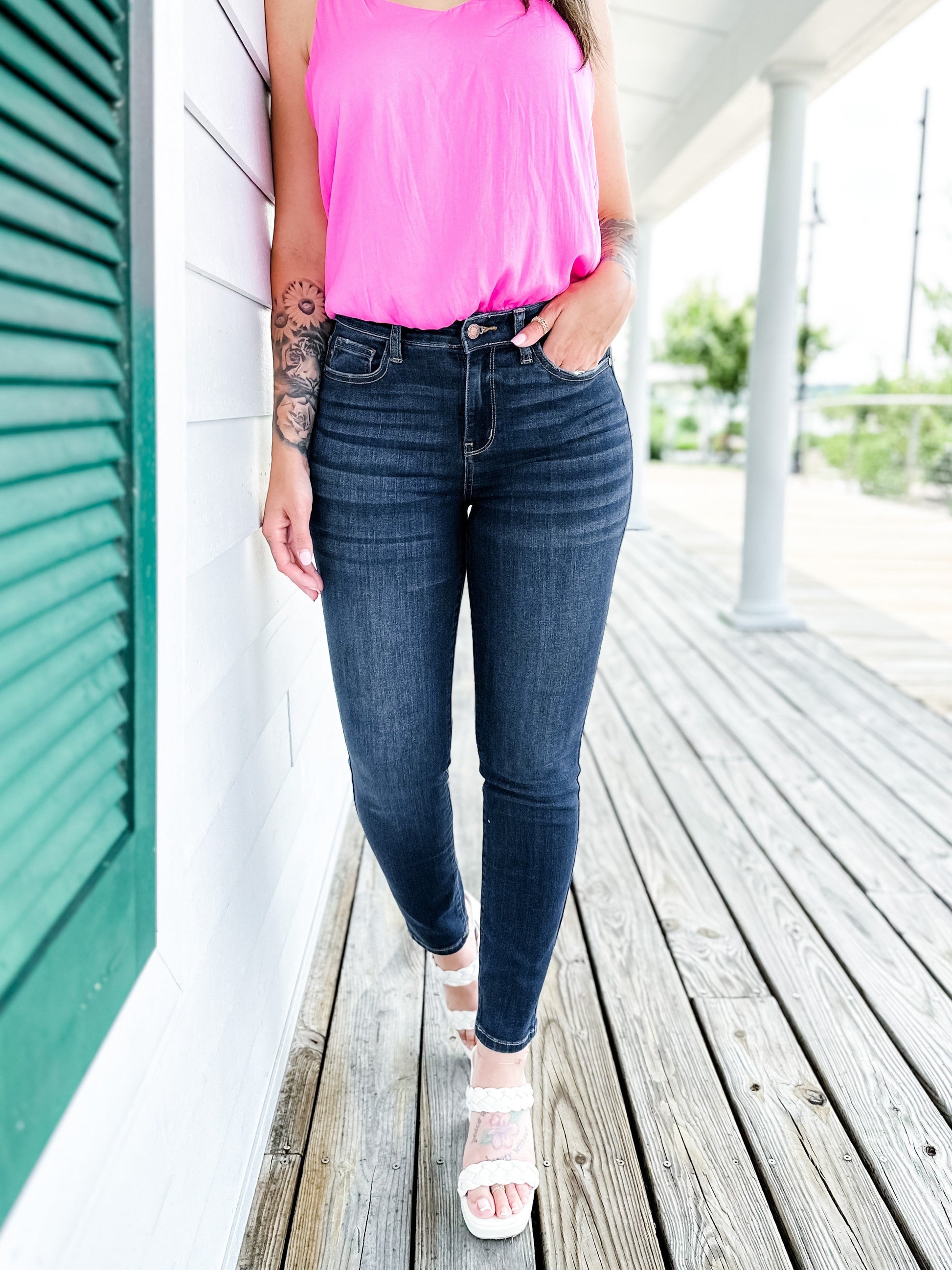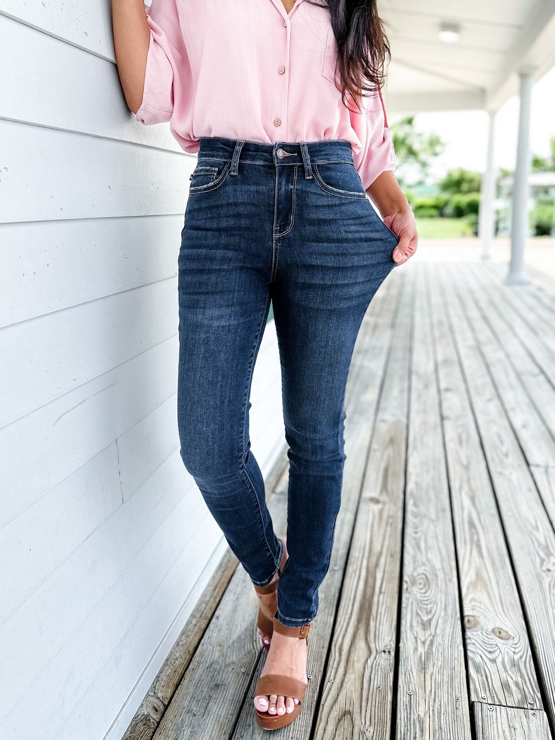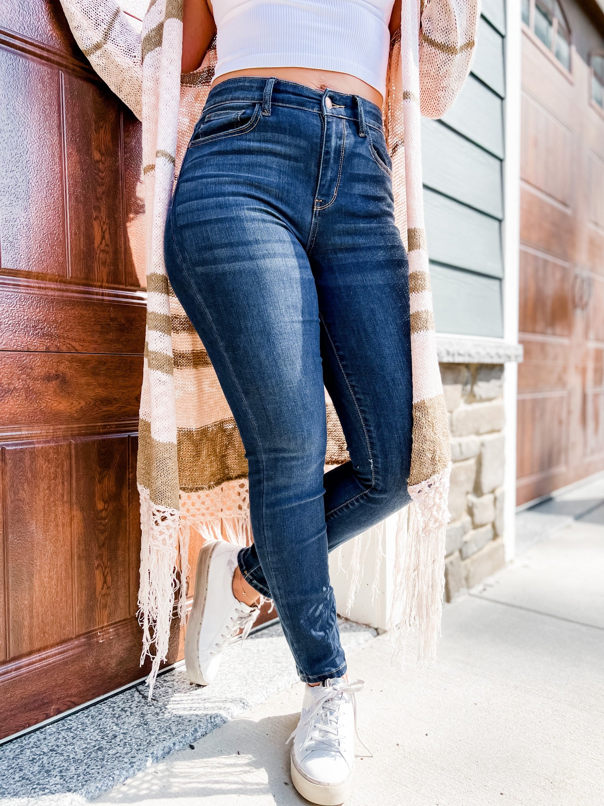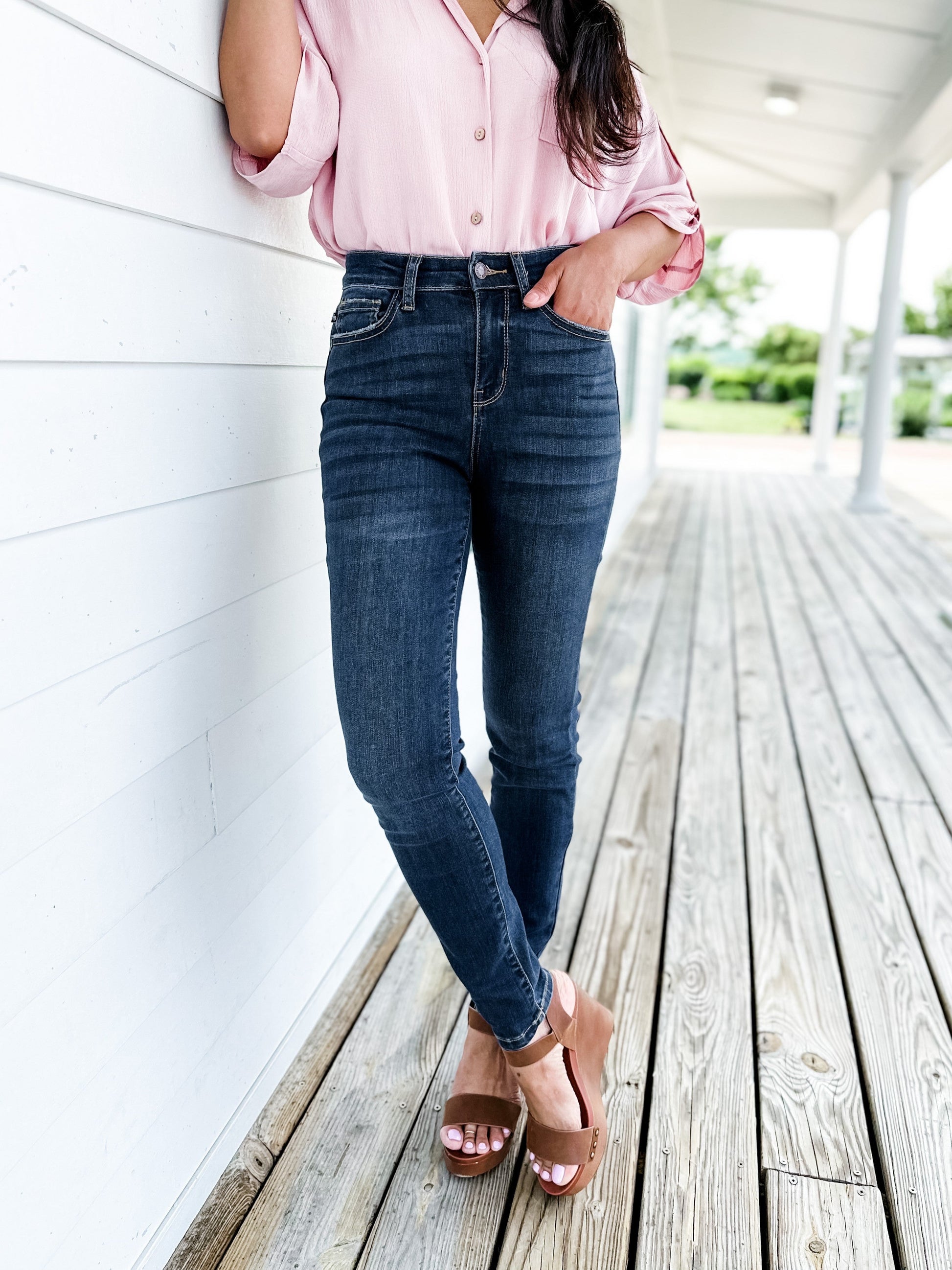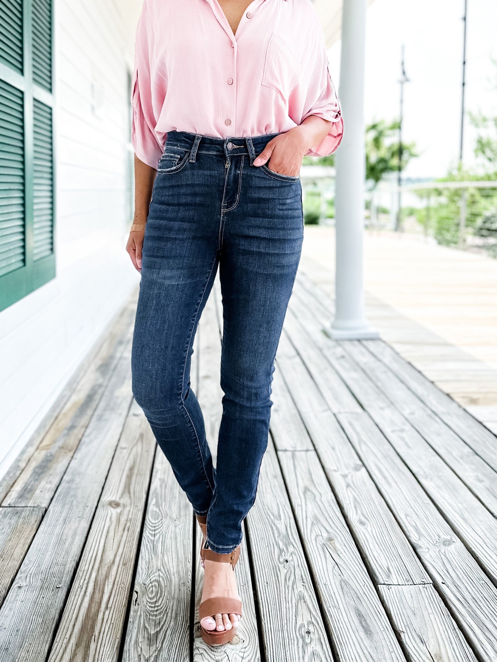 That high rise keeps everything tucked on in exactly how you want it to! The waistband is super soft and comfortable making these one of the most comfortable jeans ever!