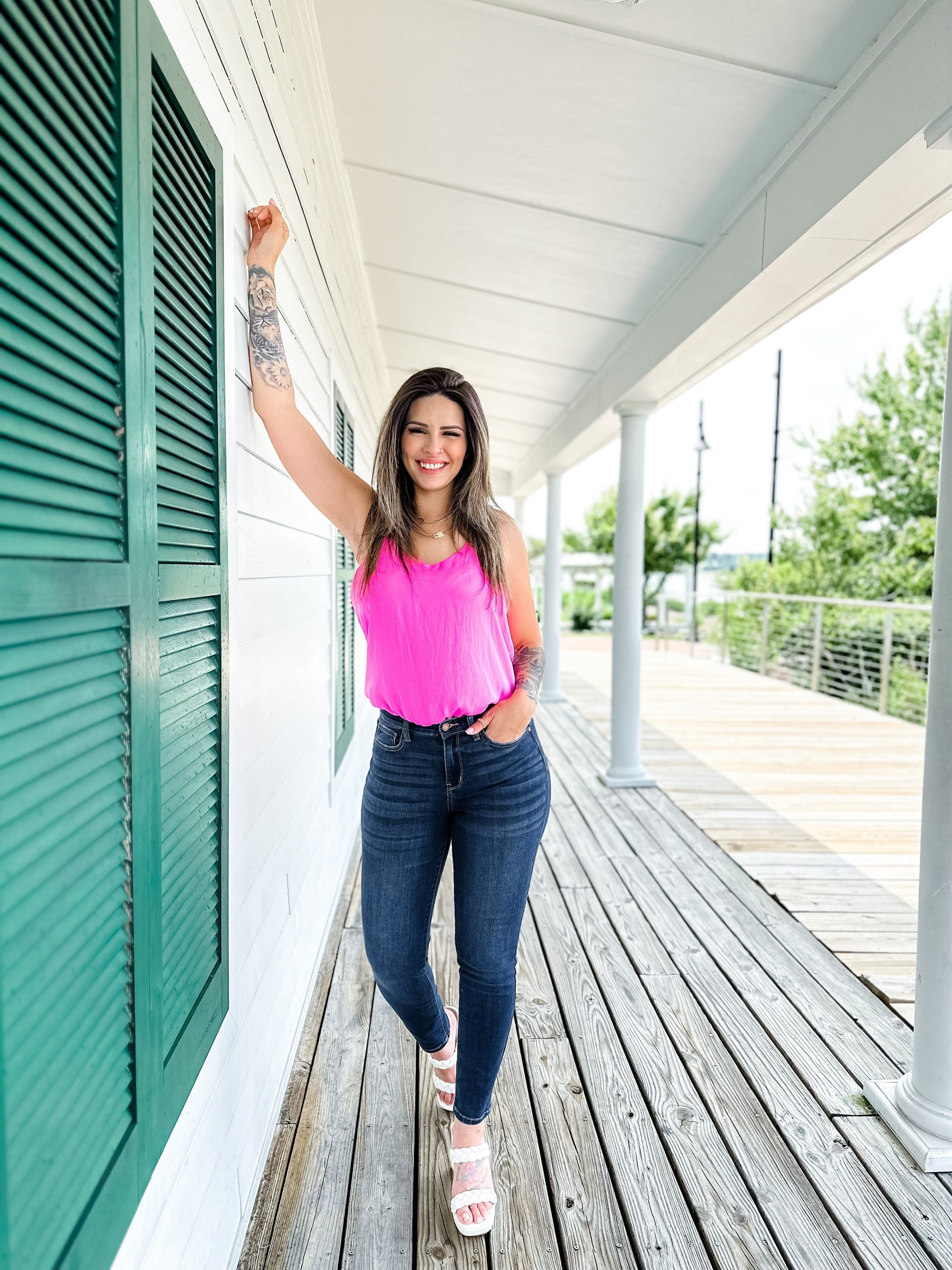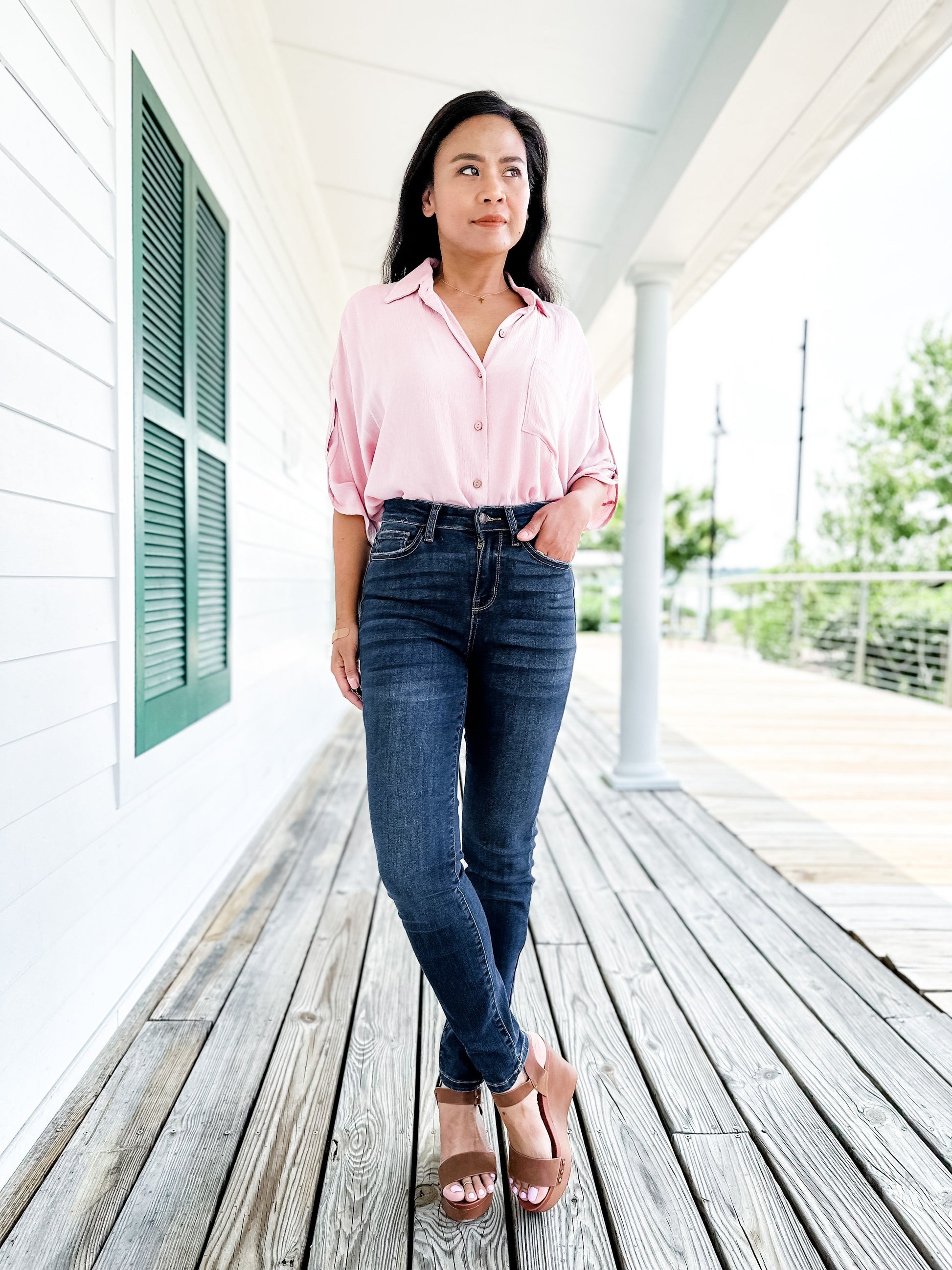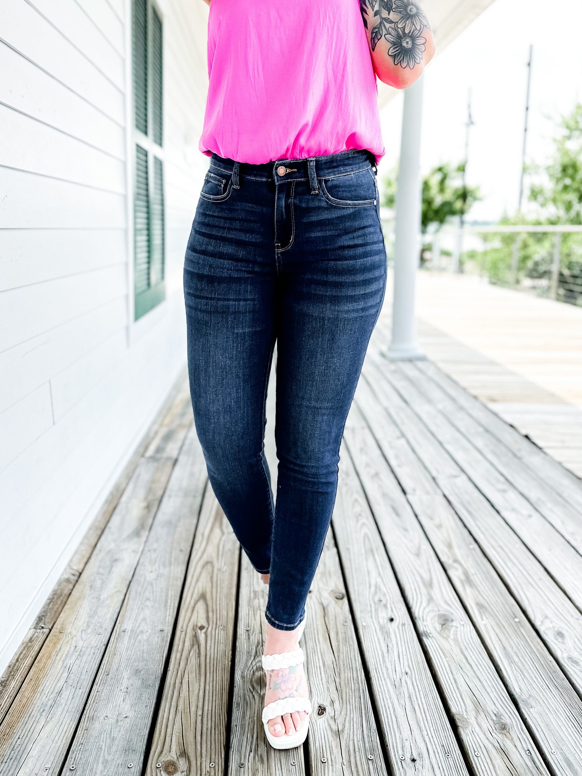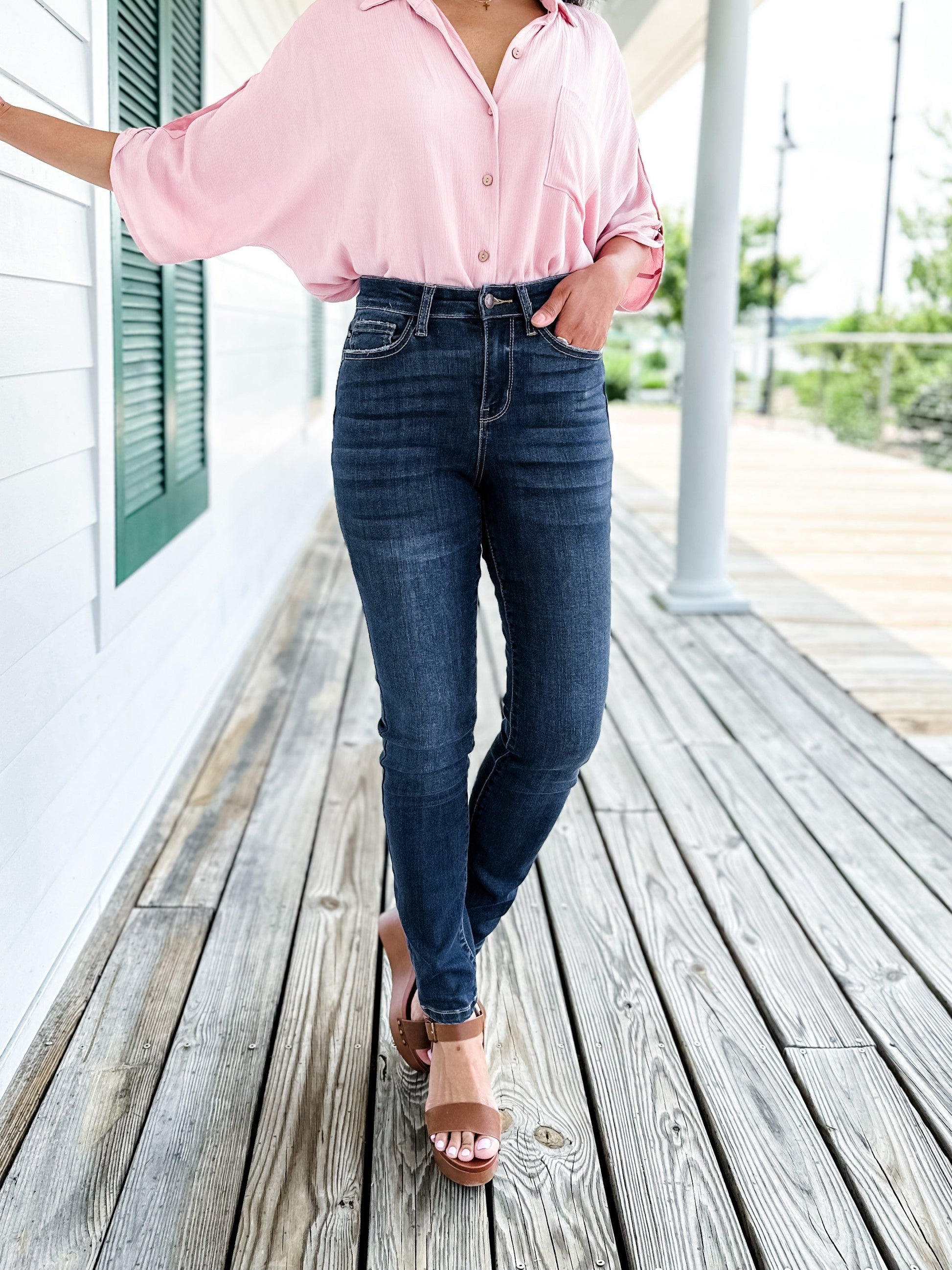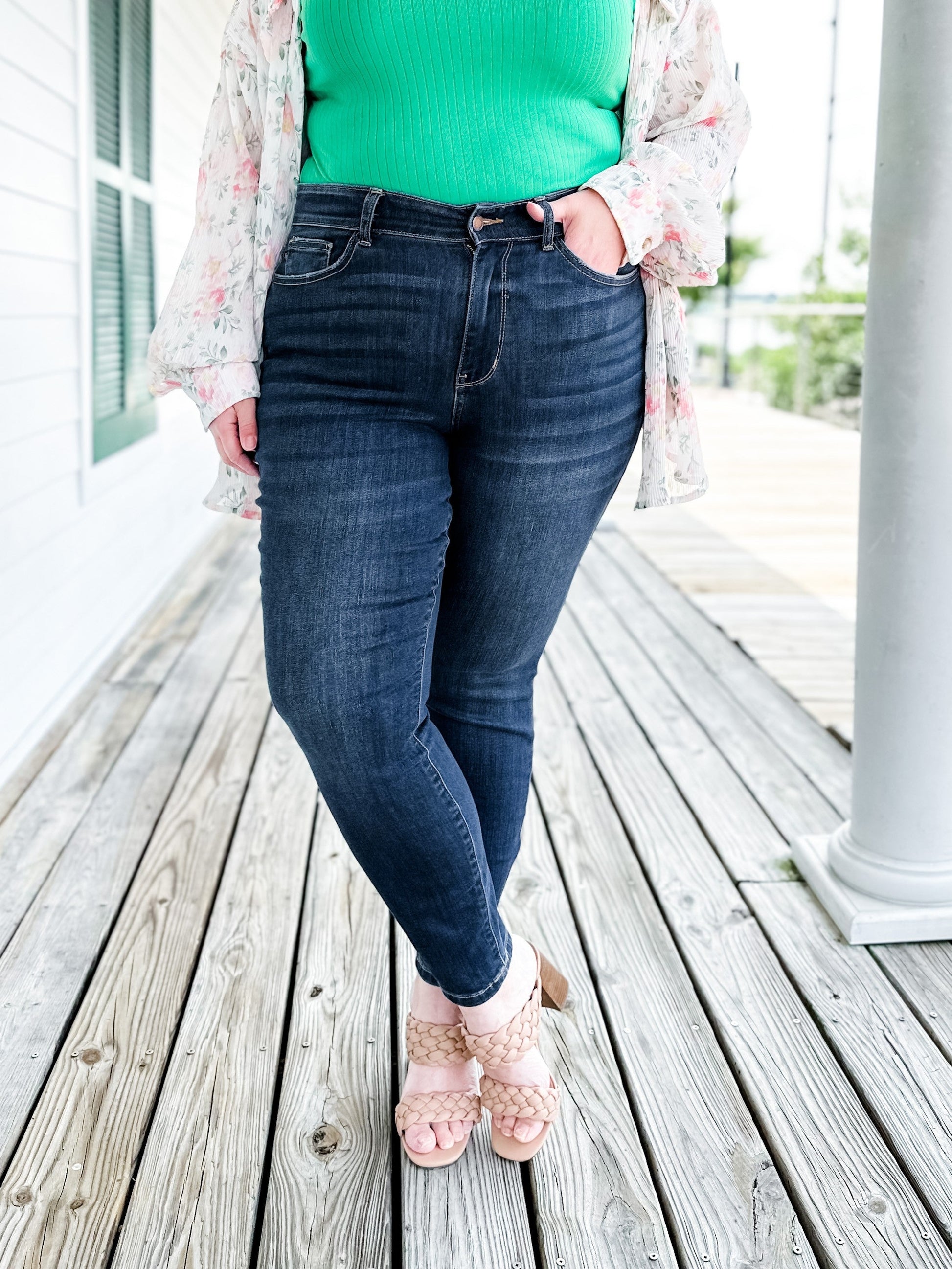 That high rise keeps everything tucked on in exactly how you want it to! The waistband is super soft and comfortable making these one of the most comfortable jeans ever!