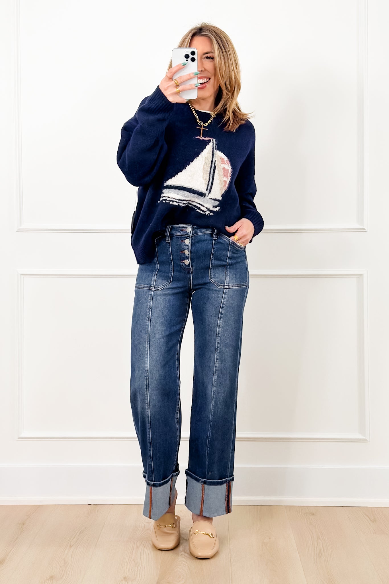 Set sail in style with this adorable sailboat pullover! The charming sailboat graphic paired with striped trim details gives it that classic coastal feel you'll love wearing all season. The soft wool blend keeps it cozy with great stretch, and the roomy fit makes it perfect for layering over button-downs or wearing on its own with your favorite denim. Available in navy or cream in sizes XS through L!