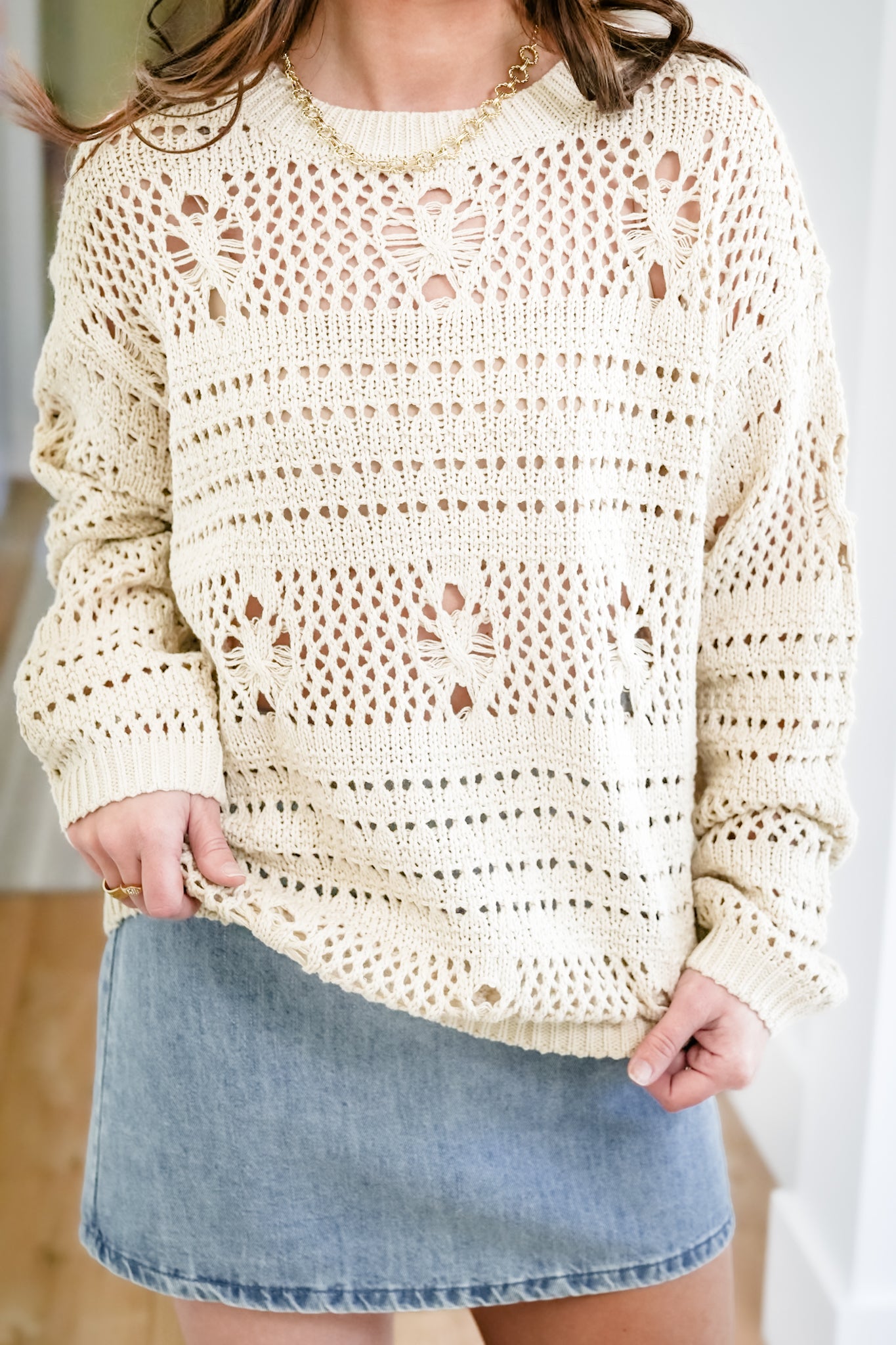All about texture and easy charm, this knitted pullover is a wardrobe winner! The open-knit pattern with playful peek-a-boo details gives it a relaxed, lived-in look that still feels elevated. The heavier knit adds warmth without feeling bulky, and the classic round neckline layers beautifully over tanks and tees. Pair it with denim shorts now or jeans later for that effortlessly cute vibe that works for casual days, weekend plans, or lounging with style.