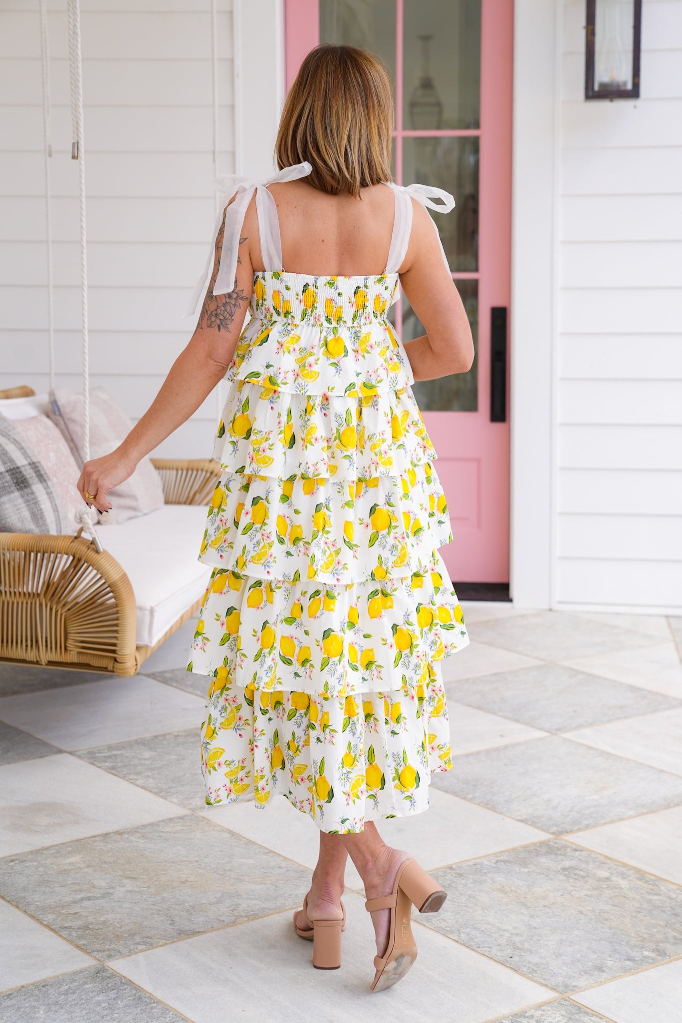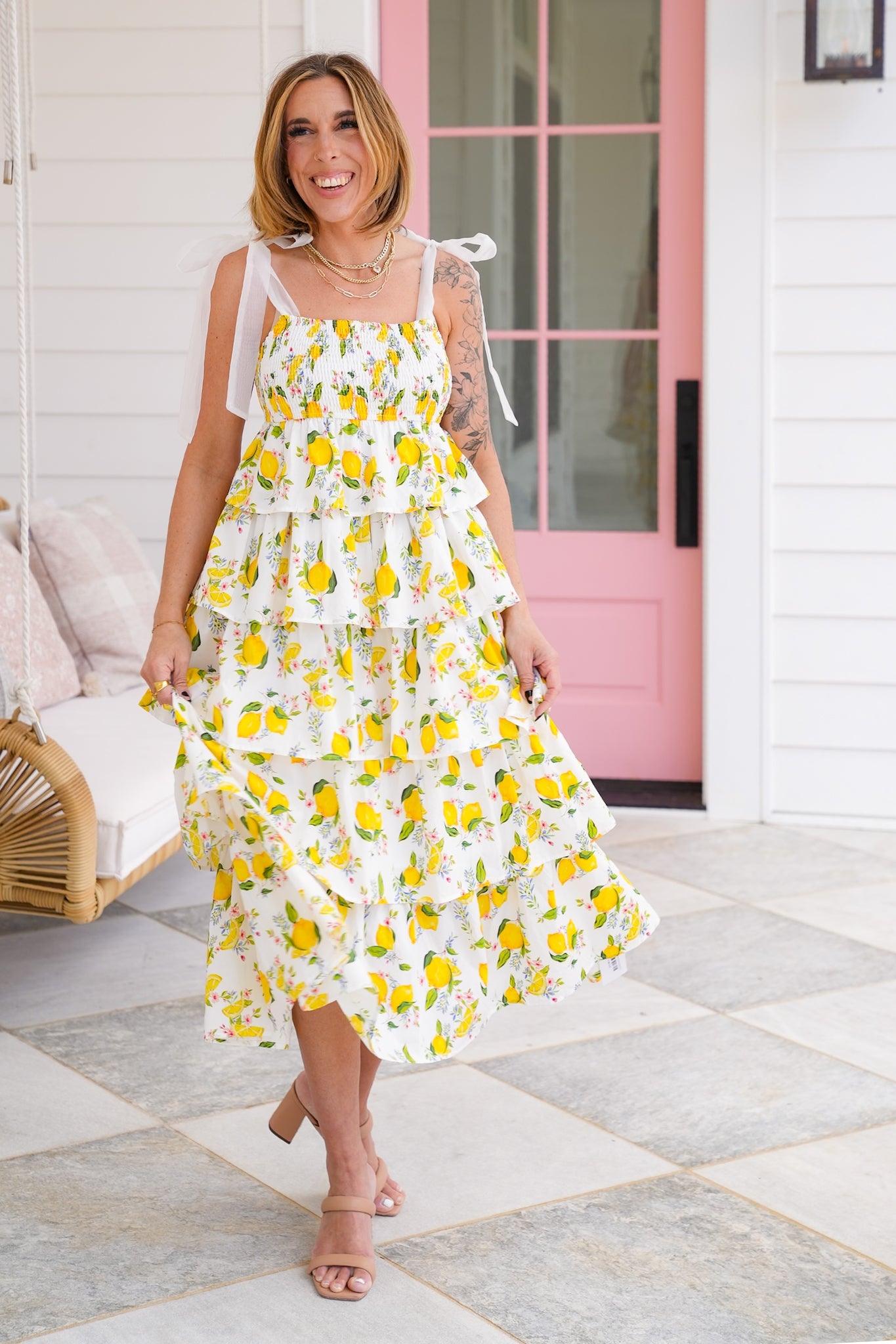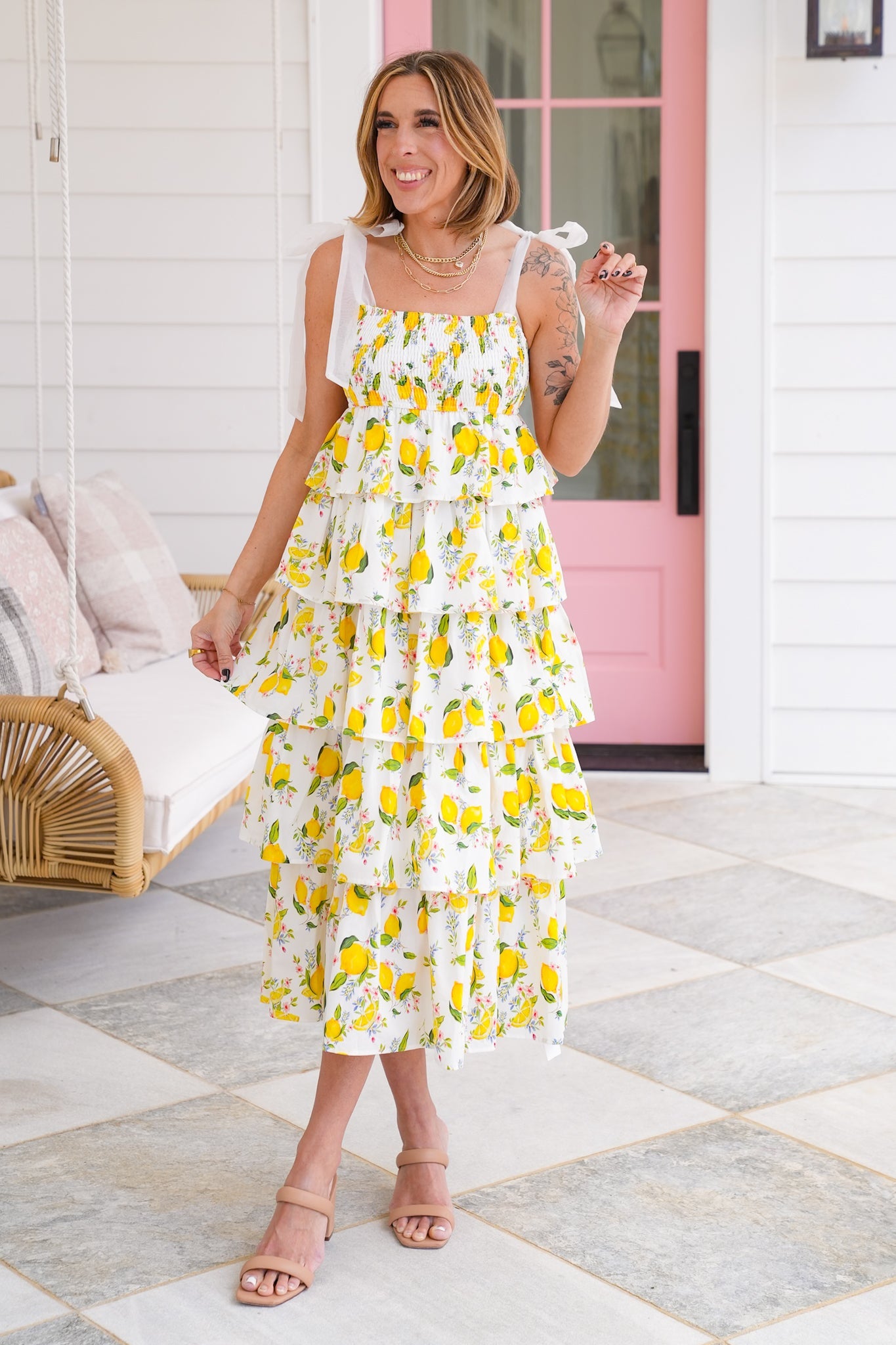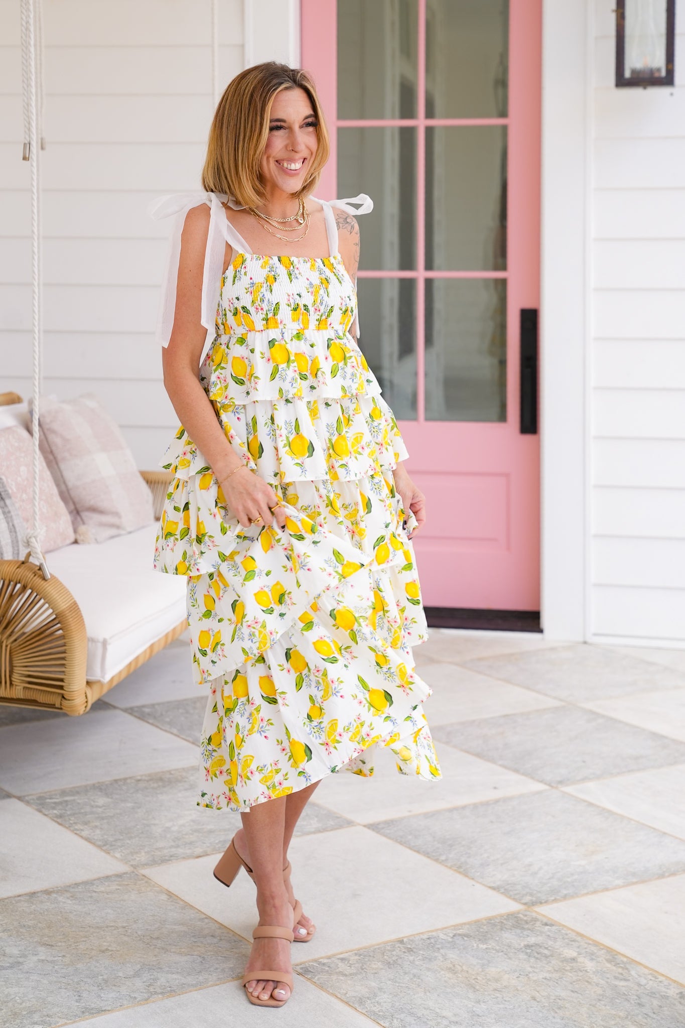 Brighten up your day with this lemon print midi dress, perfect for sunny strolls or a brunch date! The tiered design gives it a relaxed, flowy vibe, while the smocked bodice creates a flattering fit. Pair it with strappy sandals for a casual look or dress it up with wedges for an event.