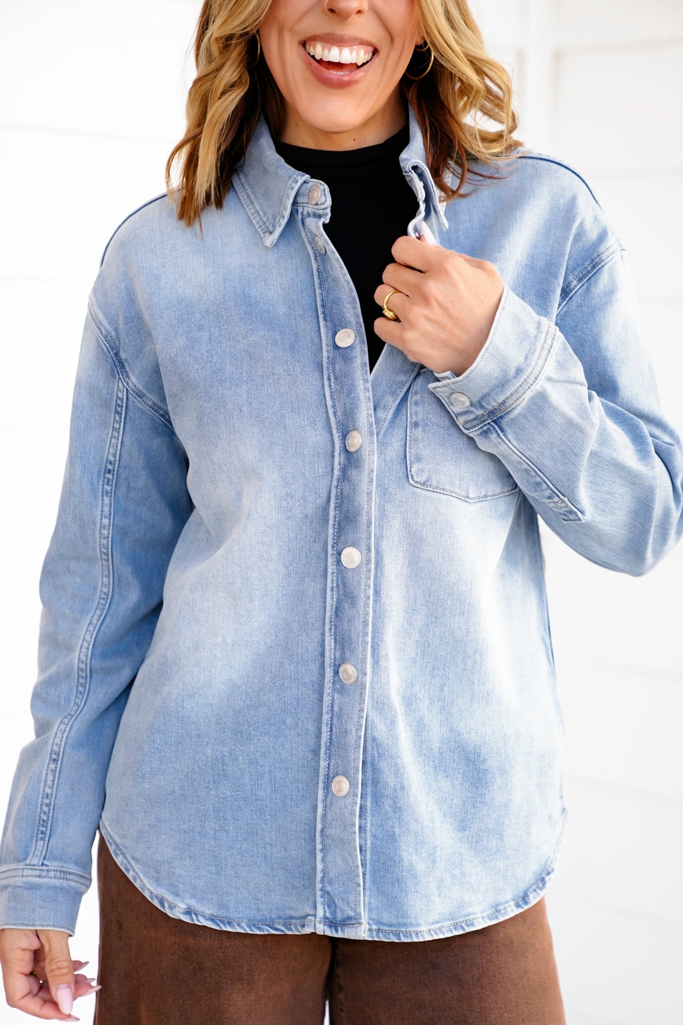 This light wash top mixes classic denim-inspired styling with a soft, modern feel thanks to its moderate stretch and relaxed shape. The snap-button front, single chest pocket, and slightly rounded hem make it an easy grab for layering or wearing solo. Dress it up with dark trousers or keep it weekend-casual with leggings or wide-leg jeans—its versatility is a total win.