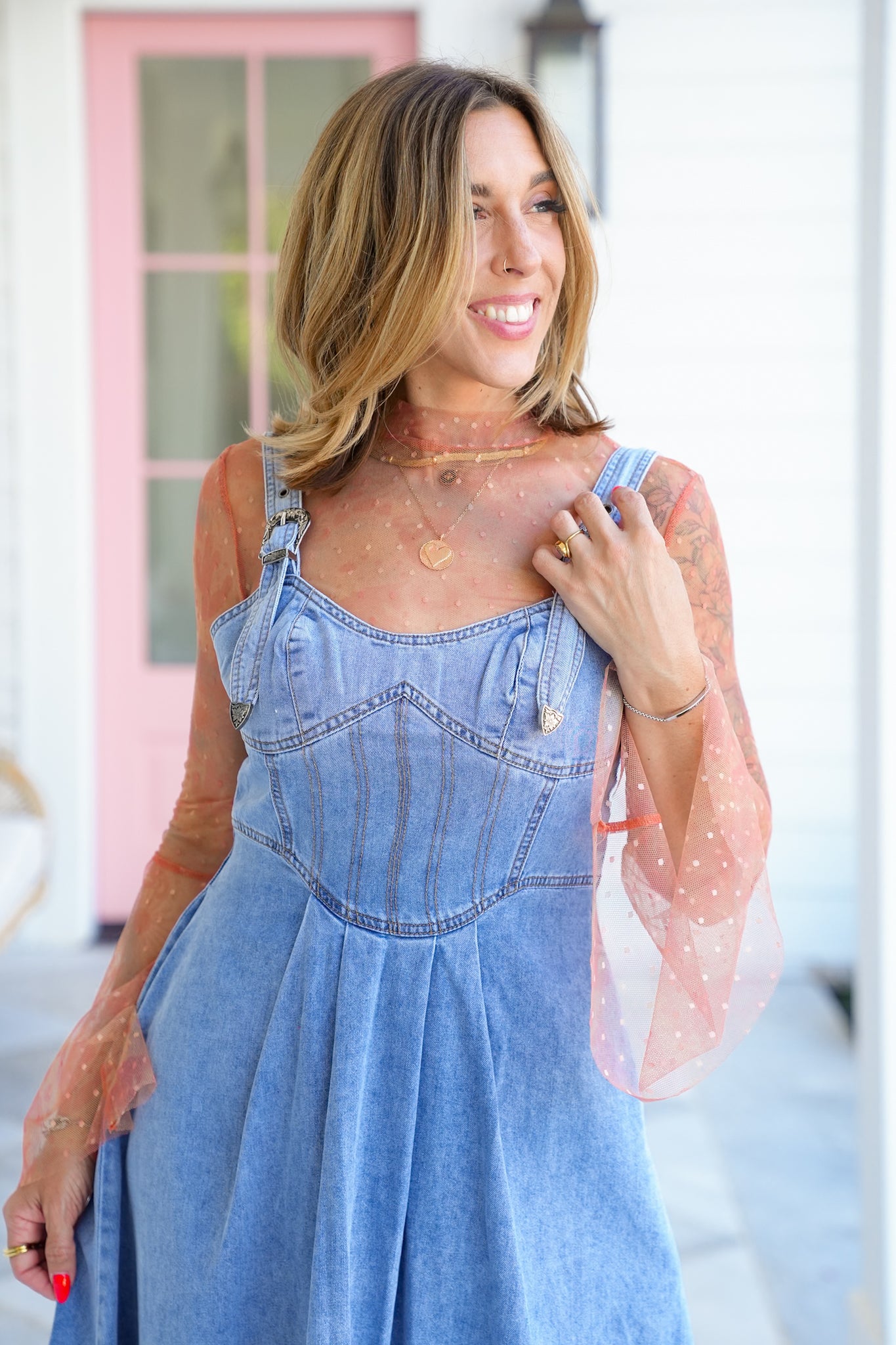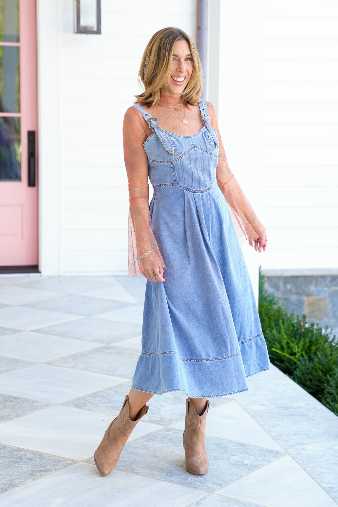 This denim midi dress brings a fresh take on western-inspired style. The buckle straps and light wash give it a modern cowgirl edge, while the fitted bodice and midi skirt keep the look polished and feminine. Pair with ankle booties and a wide-brim hat for rodeo season, or layer with a mesh long sleeve underneath for a trend-forward twist.