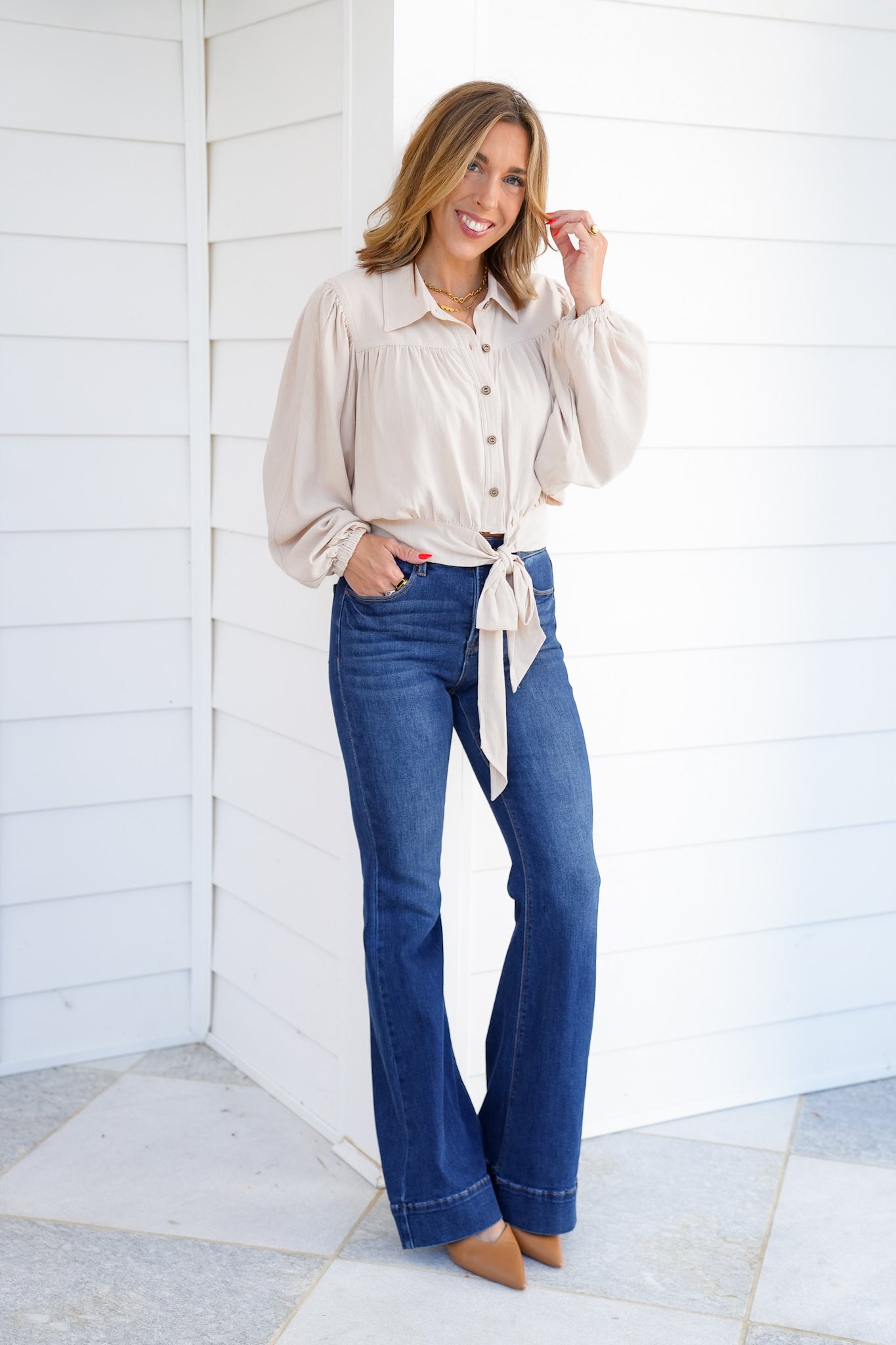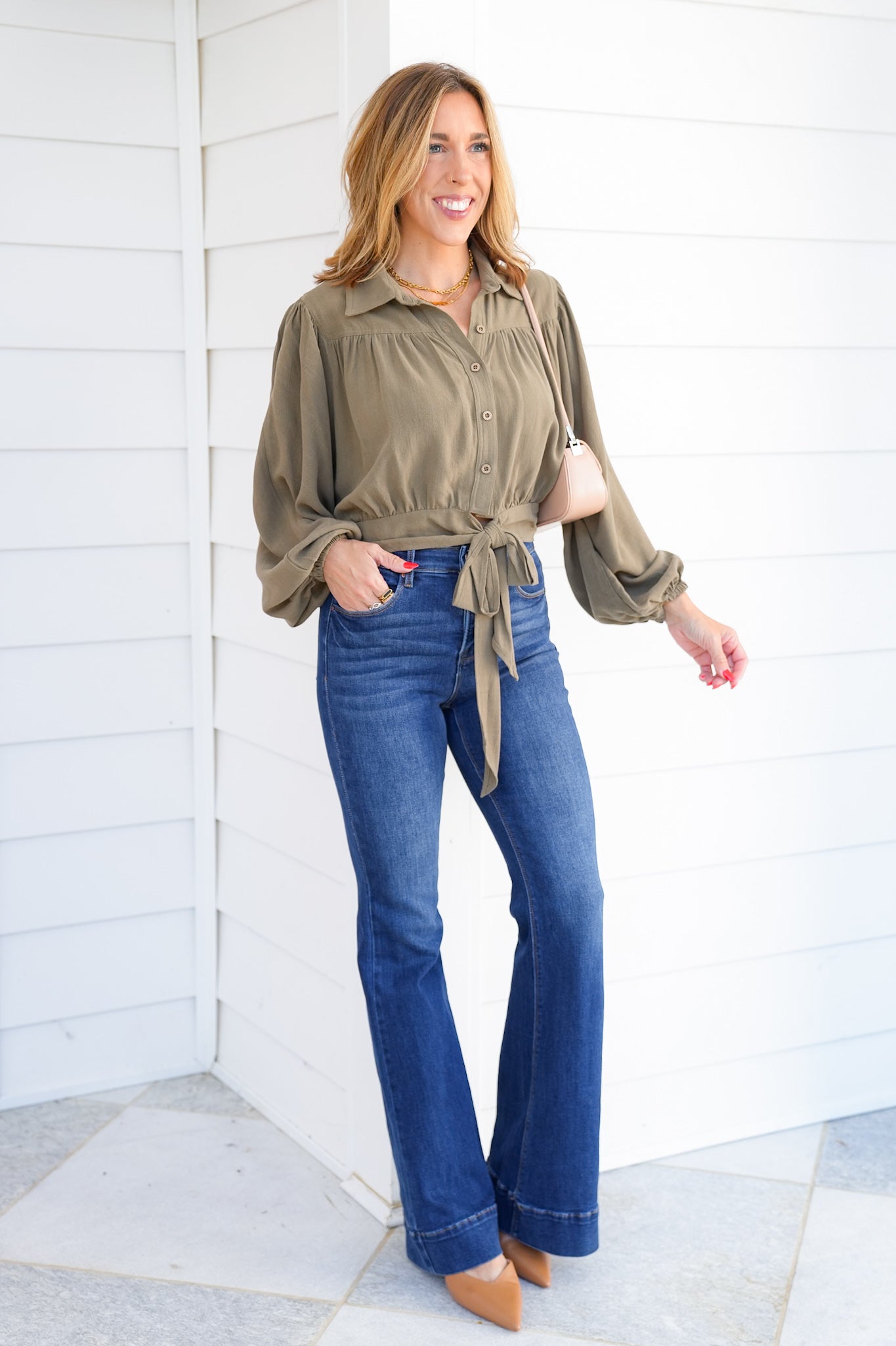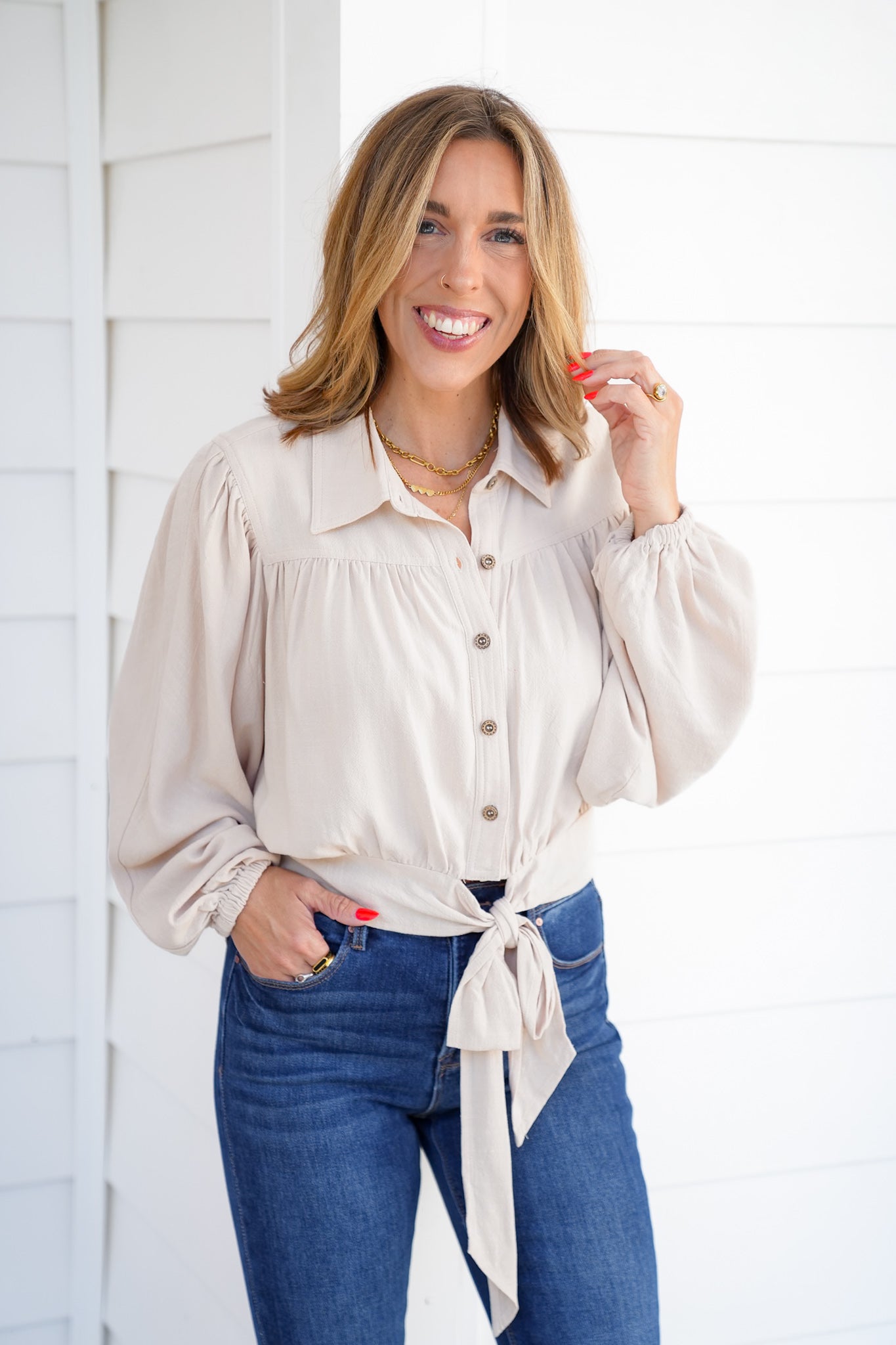 This blouse is breezy, chic, and made for those effortless put-together days. The lightweight linen blend keeps it comfortable, while the tie-front waist gives you shape and style in one simple step. Dress it up with wide-leg trousers and heels, or keep it casual with denim and western booties for a laid-back look that still feels elevated.