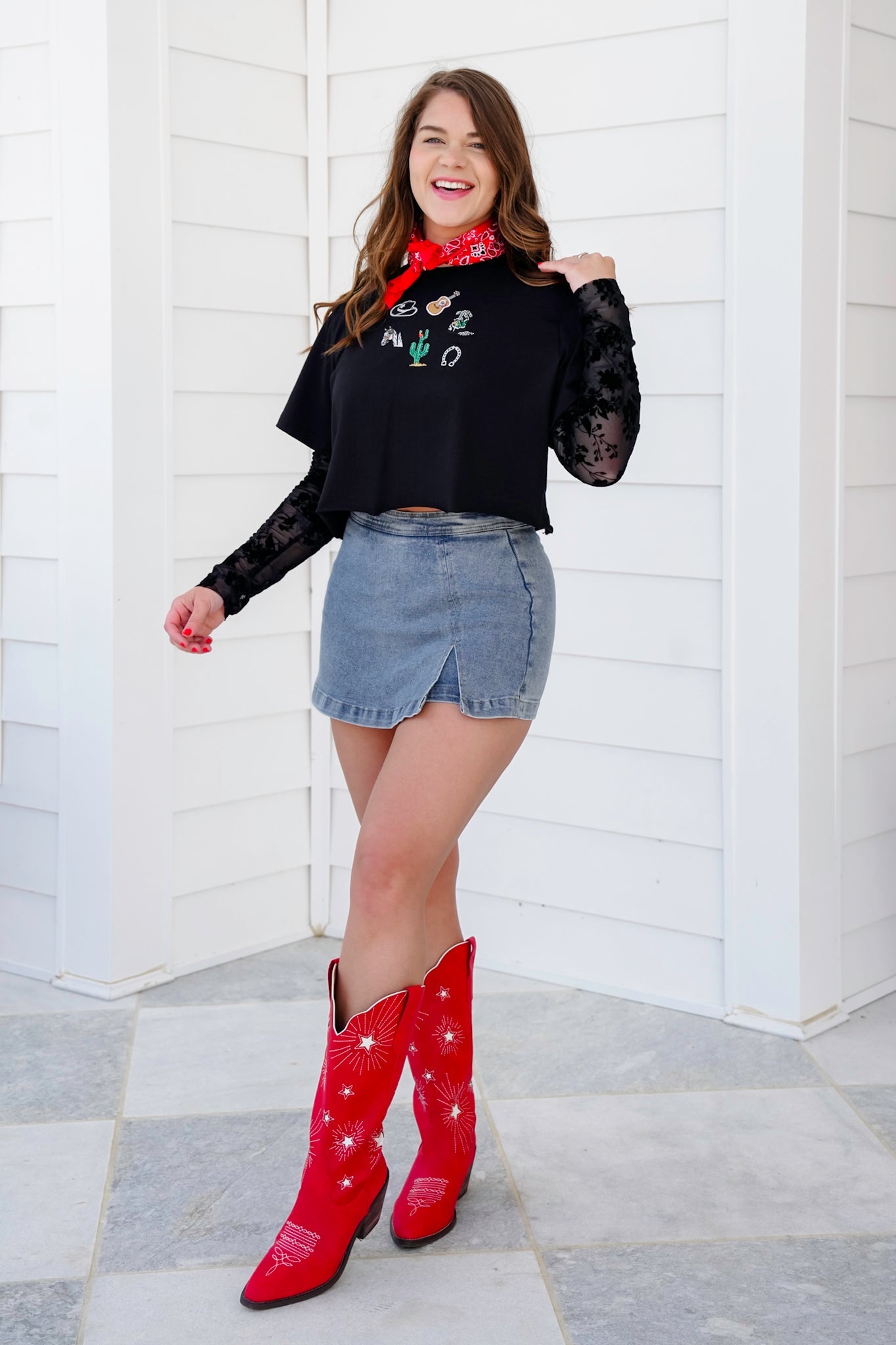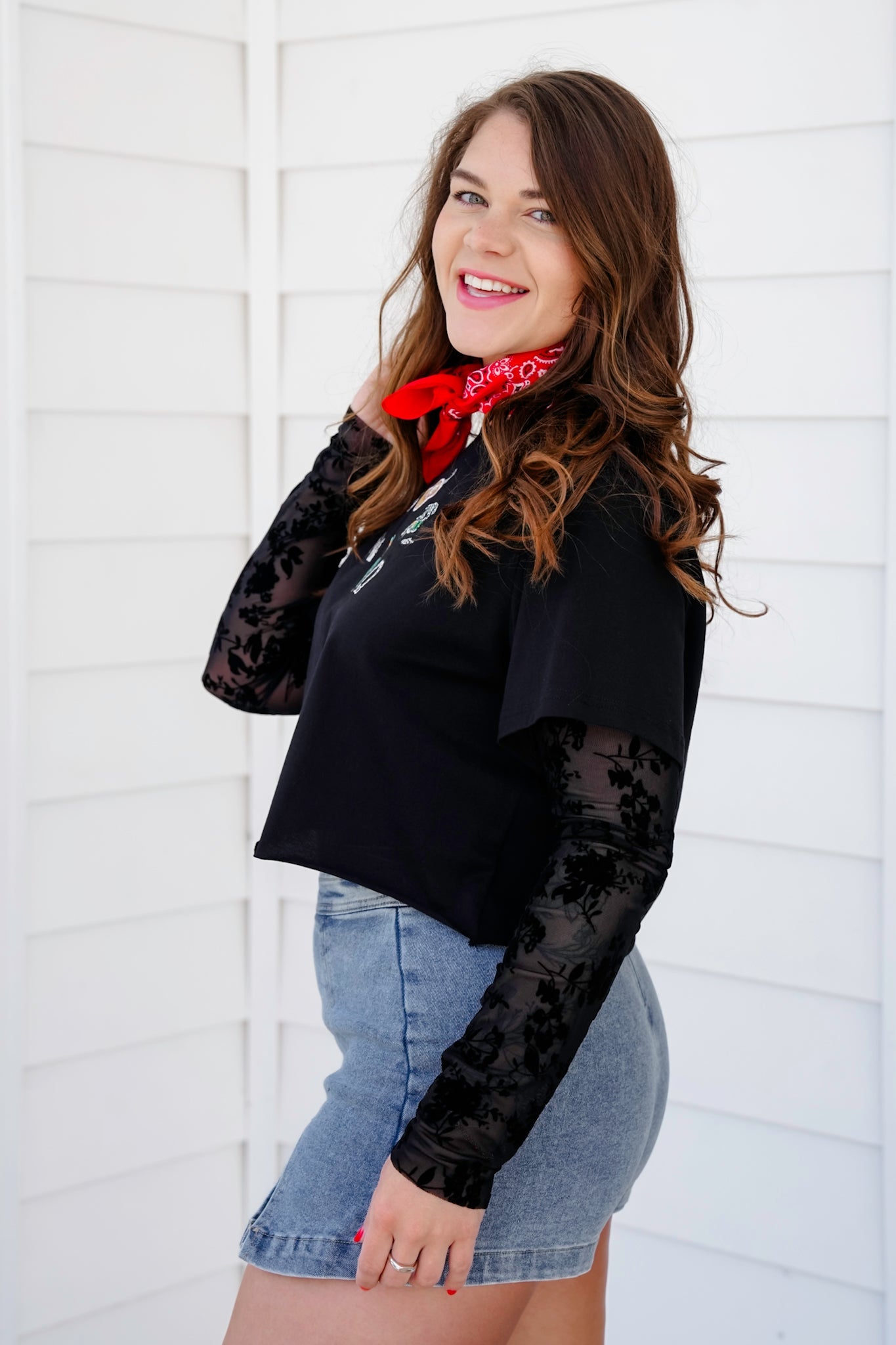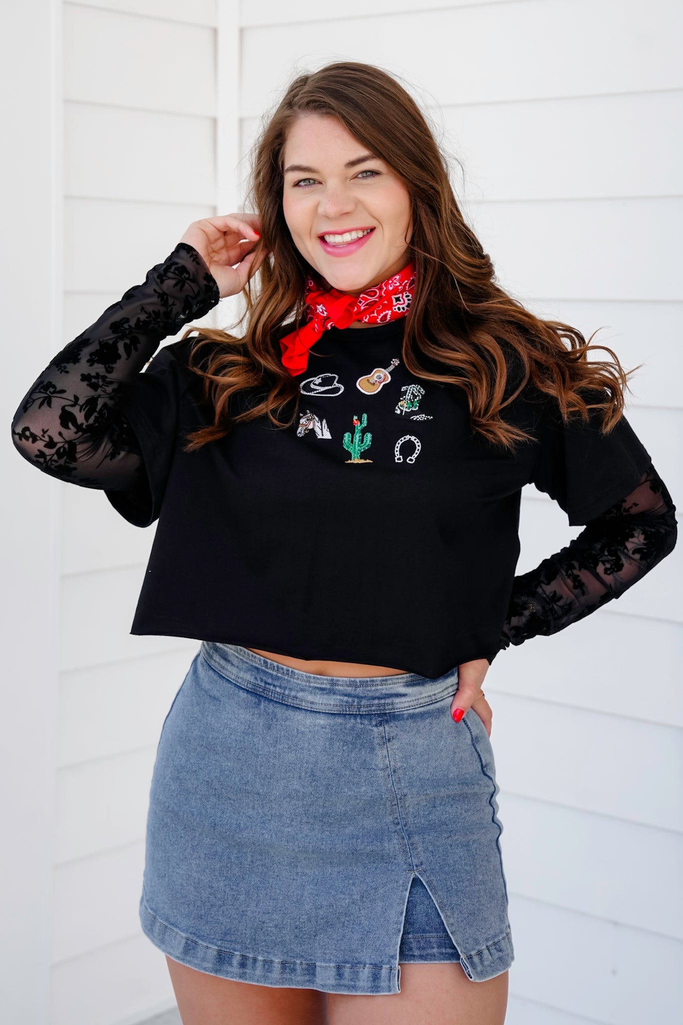 It’s giving cowgirl energy with a glam twist. This layered black crop top features embroidered western icons across the chest, sheer burnout sleeves, and built-in mesh for a little edge. Toss it on with denim or a statement skirt and don’t forget your boots—this one's made for festivals, rodeos, or whenever you're feelin' spicy.