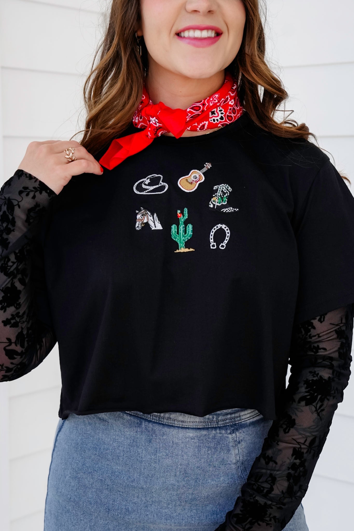 Long Burnout Sleeve Layered Crop Top with Embroidered Western Theme Detail