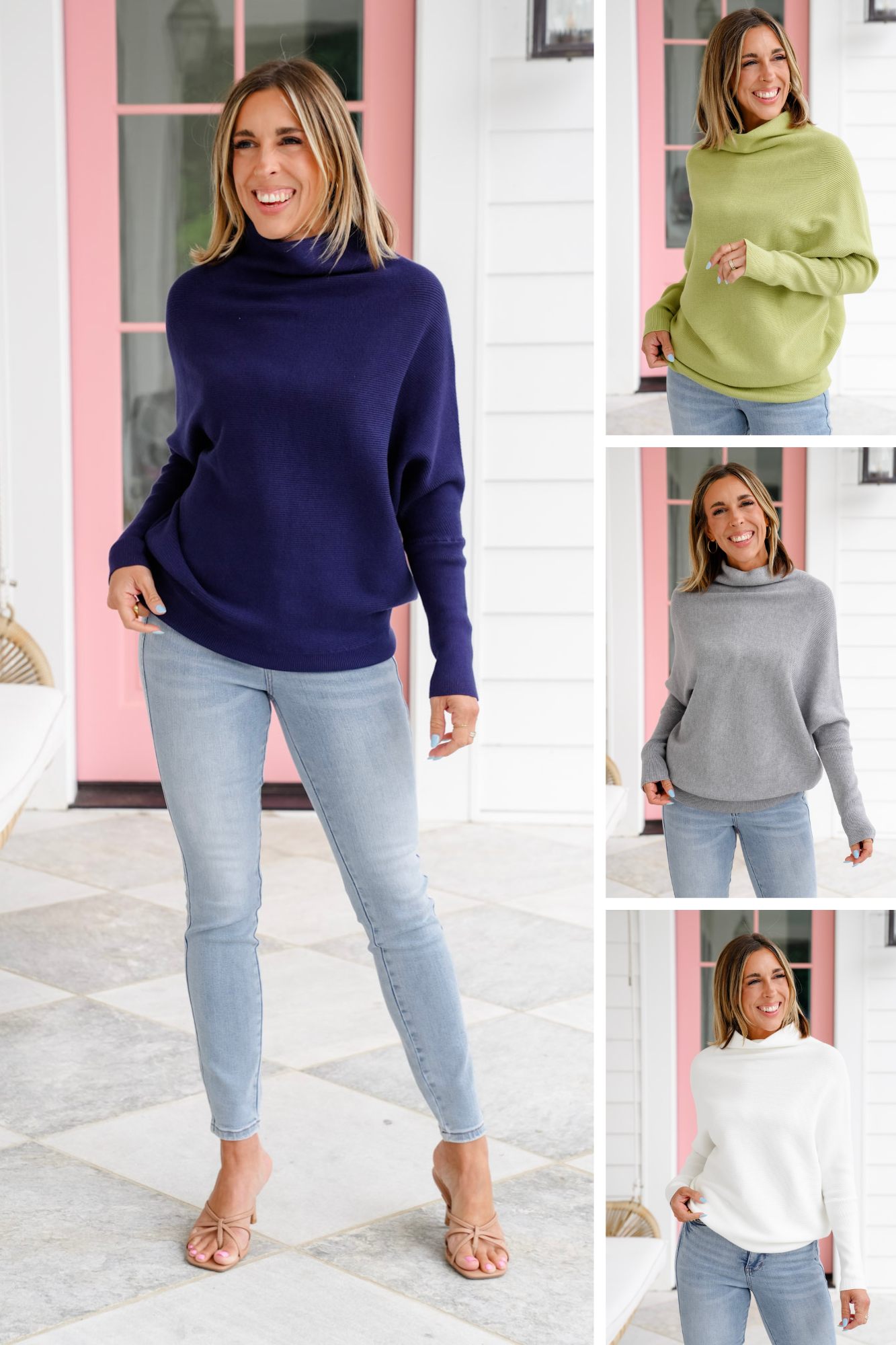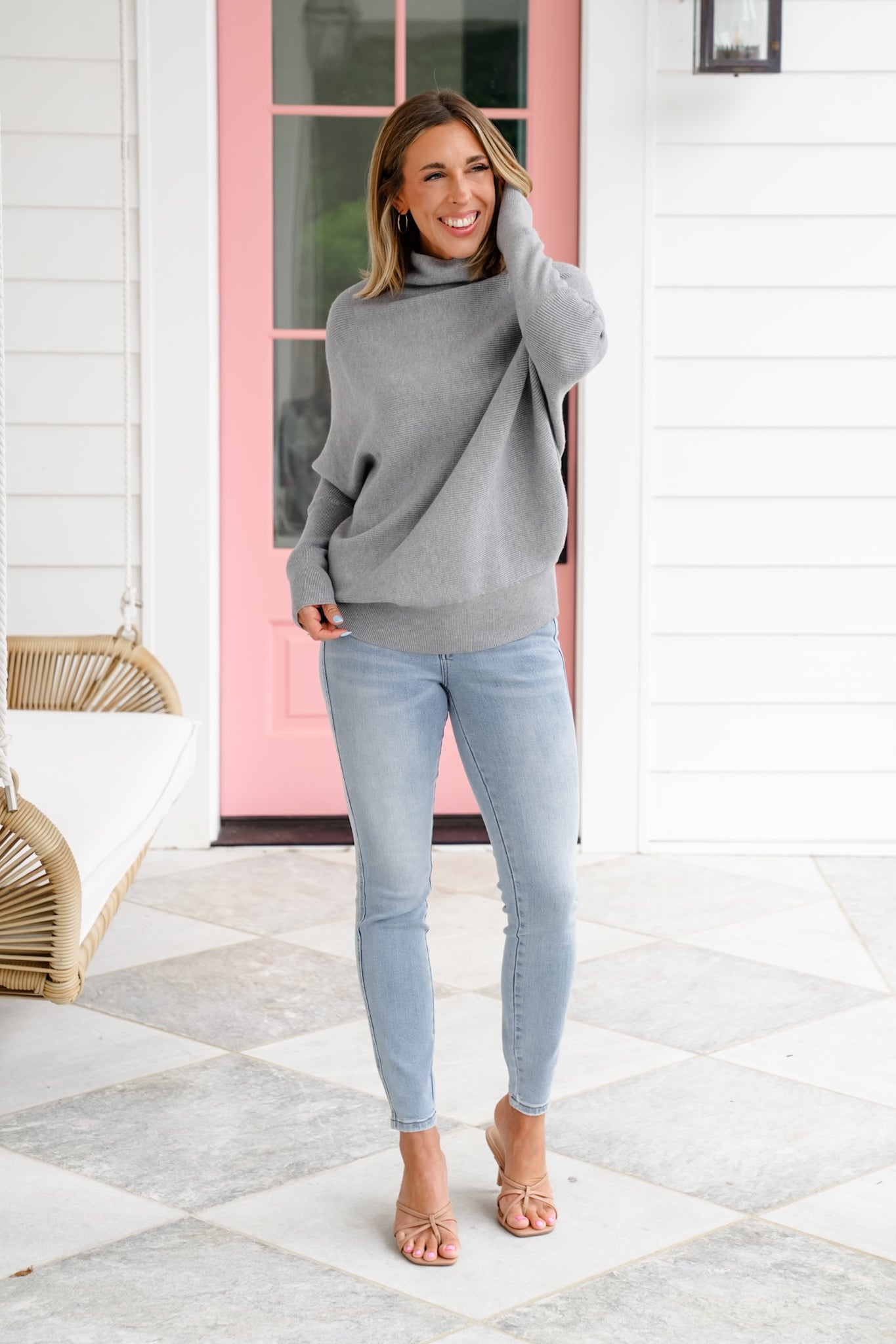 This mock neck sweater is the definition of elevated comfort. The dolman sleeves create that relaxed, draped shape while the mock neck gives it a touch of polish—perfect for pairing with denim, leggings, or even layering over skirts. The fabric is so soft you’ll want to live in it, and with multiple colors to choose from, it’s one you’ll keep reaching for season after season.
