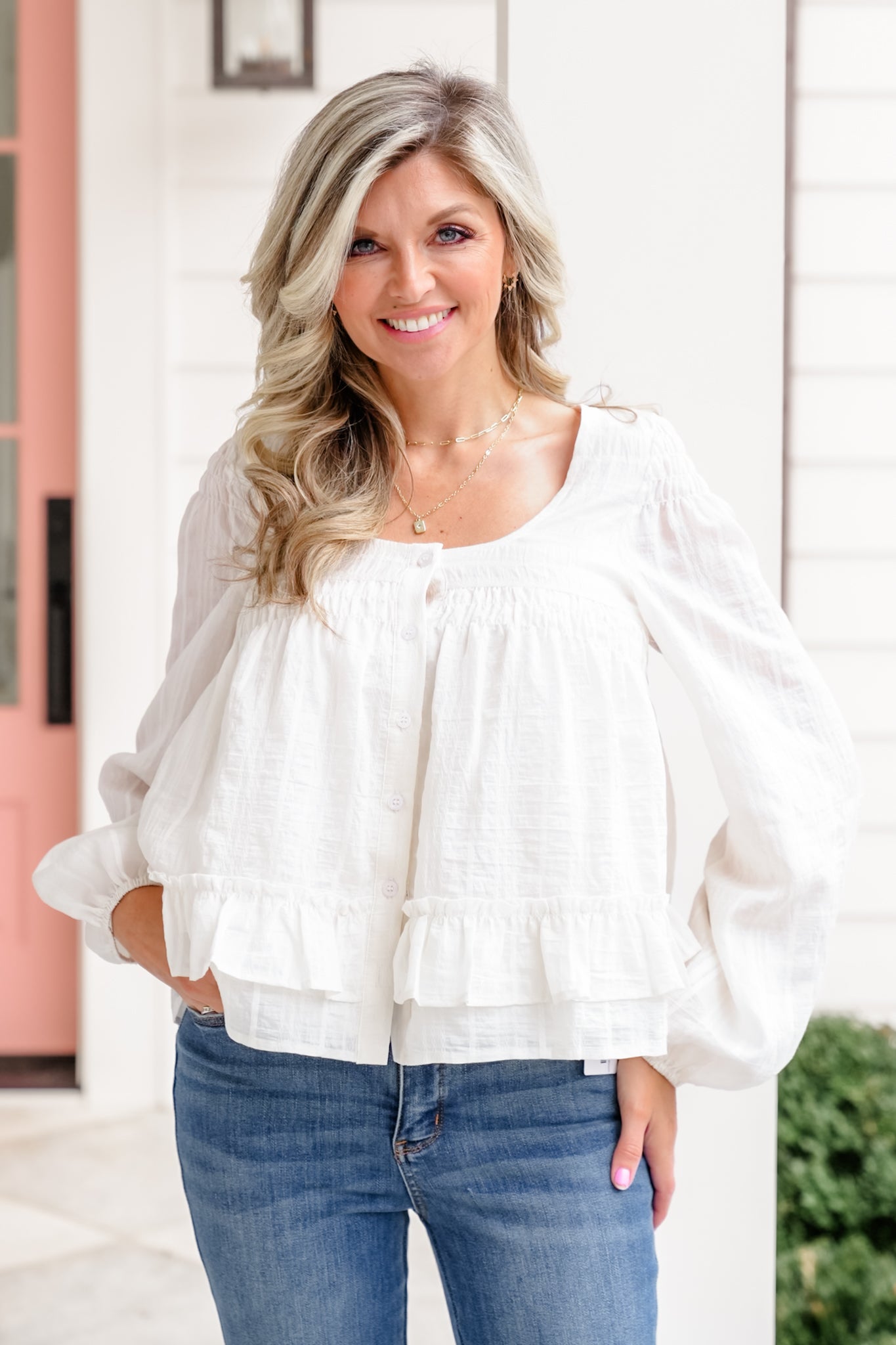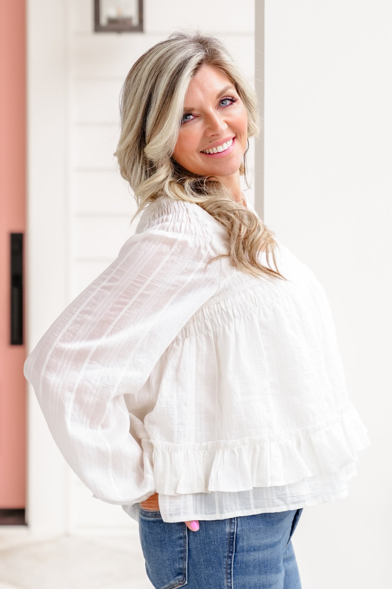 This blouse brings soft movement with a polished finish that feels easy to wear and easy to style. The flowy shape and ruffled hem add just the right amount of femininity, while the button down front keeps it classic. Wear it with denim for an everyday look or pair it with trousers when you want something a little more elevated.