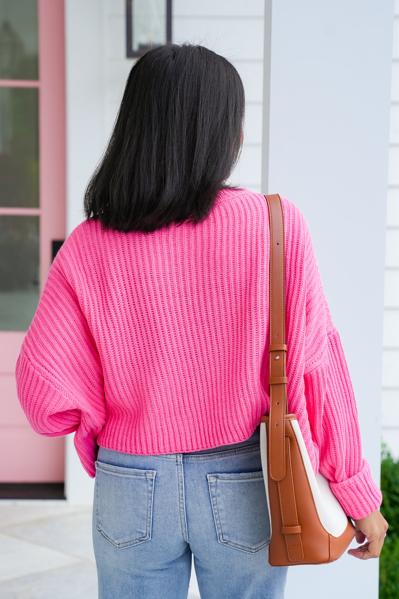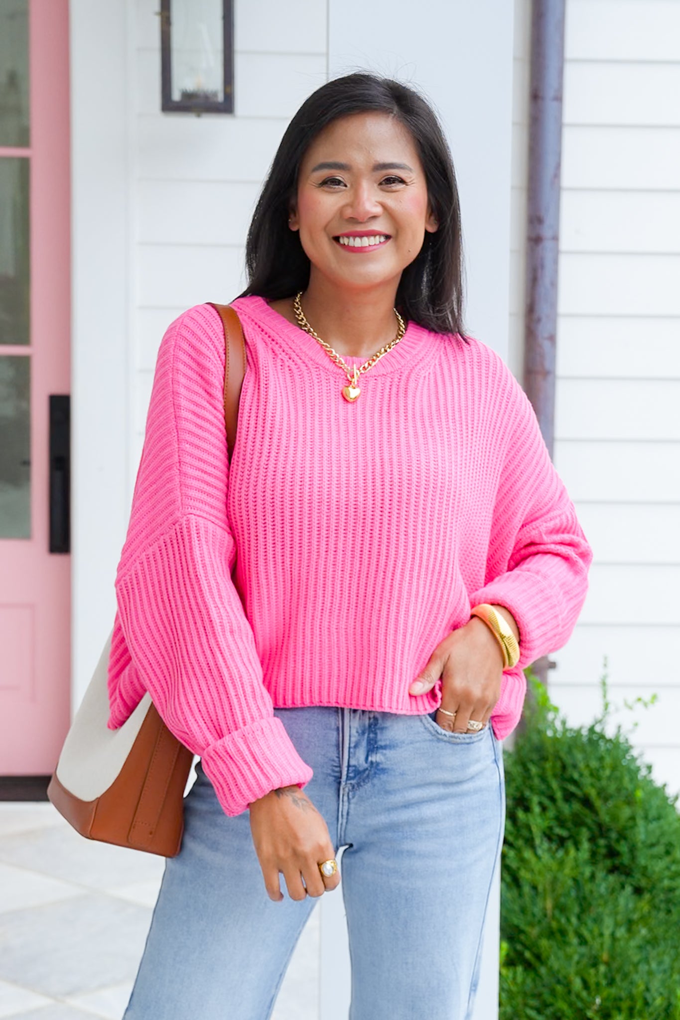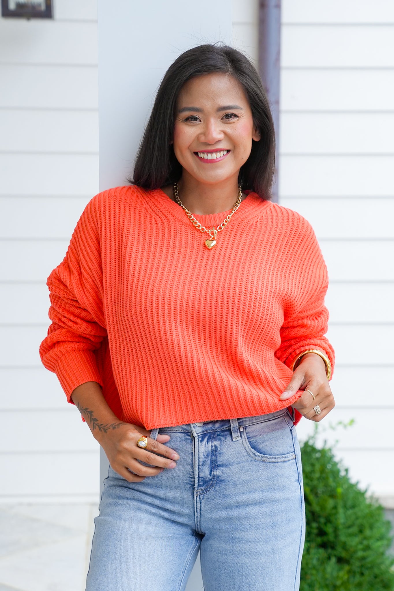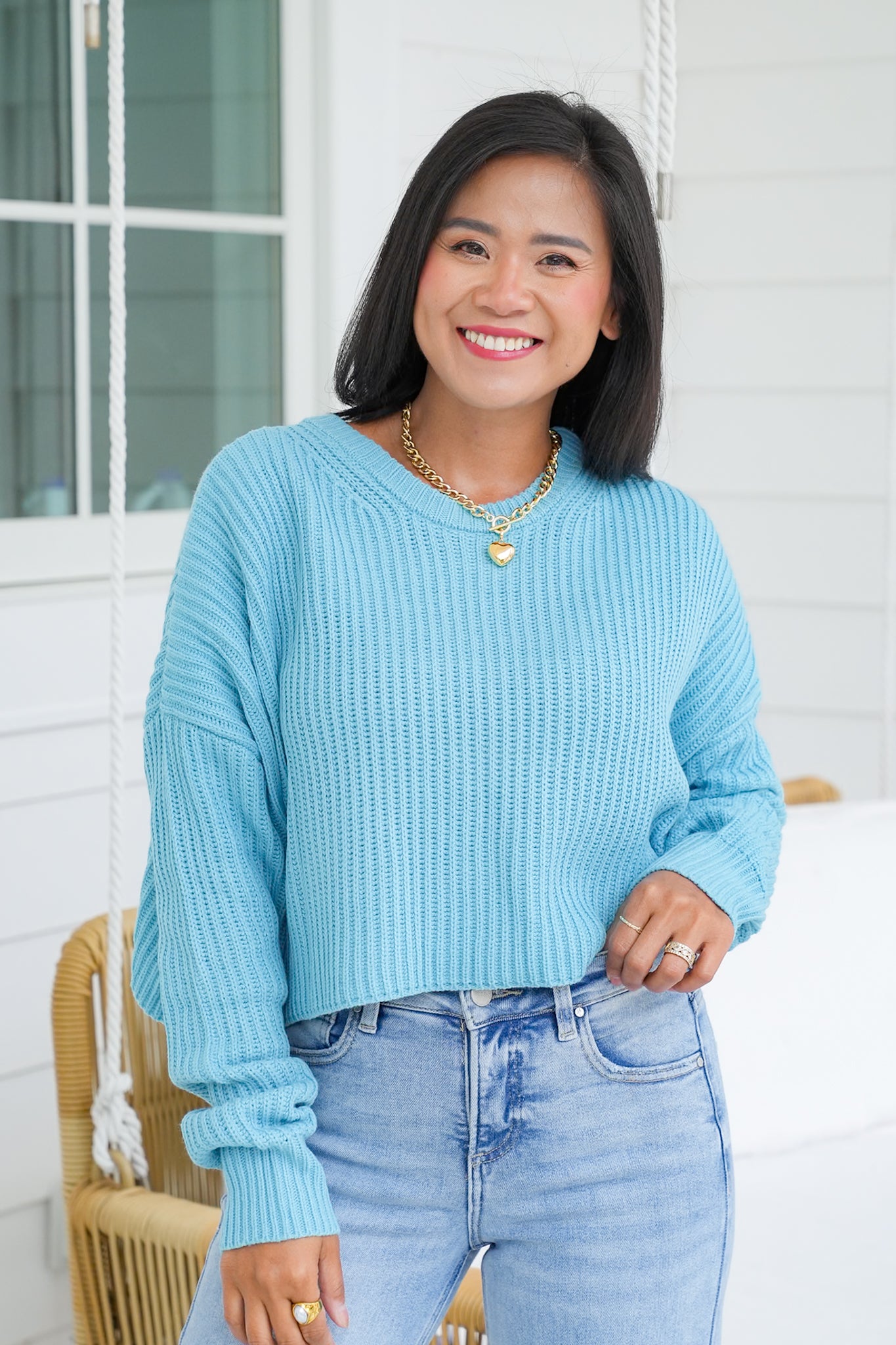 This cropped knit sweater is soft, cozy, and so easy to wear, with a boxy shape and just the right length to pair with high-waisted denim or skirts. The crew neckline keeps it classic while the bright color options add a fun twist you’ll love reaching for again and again.