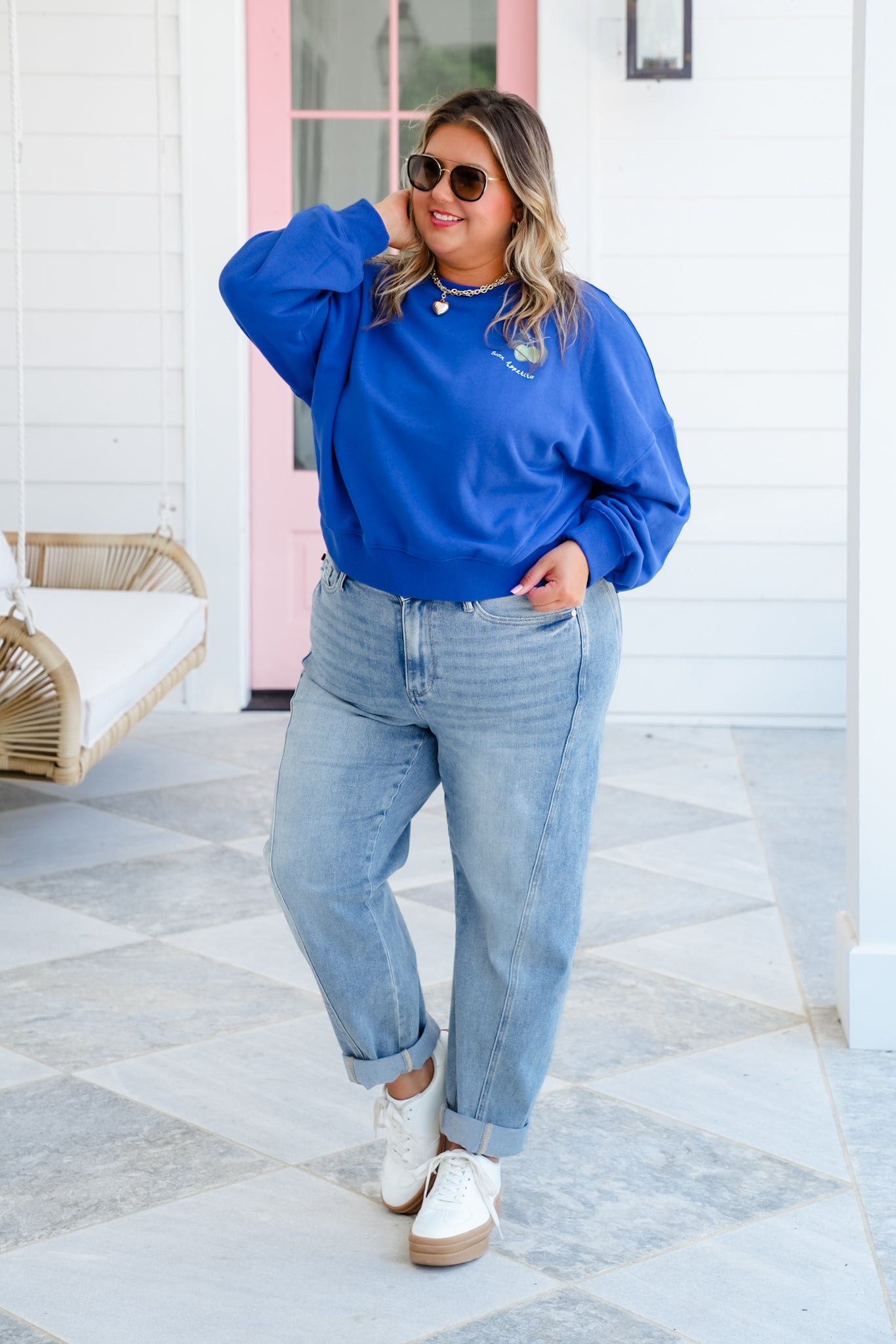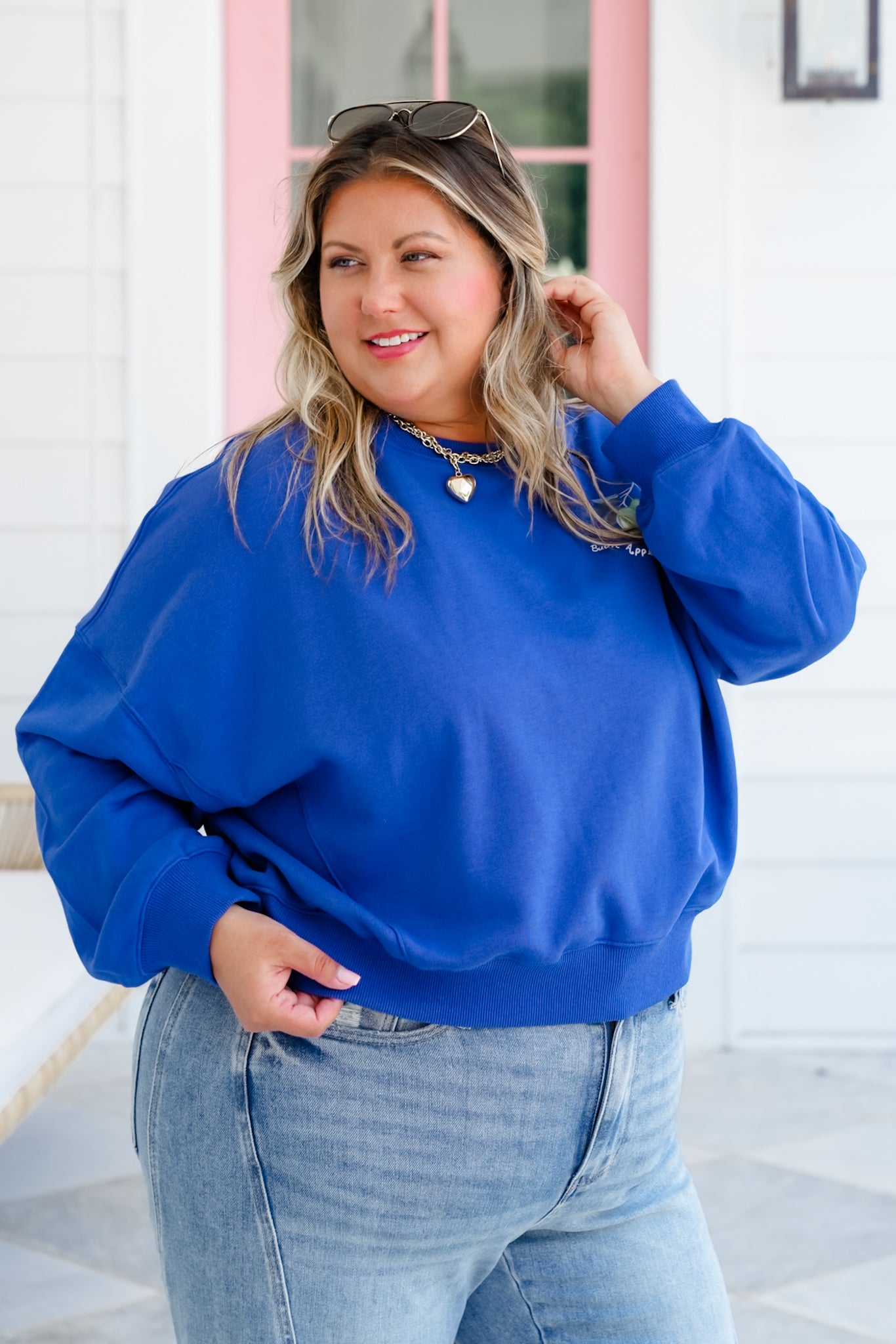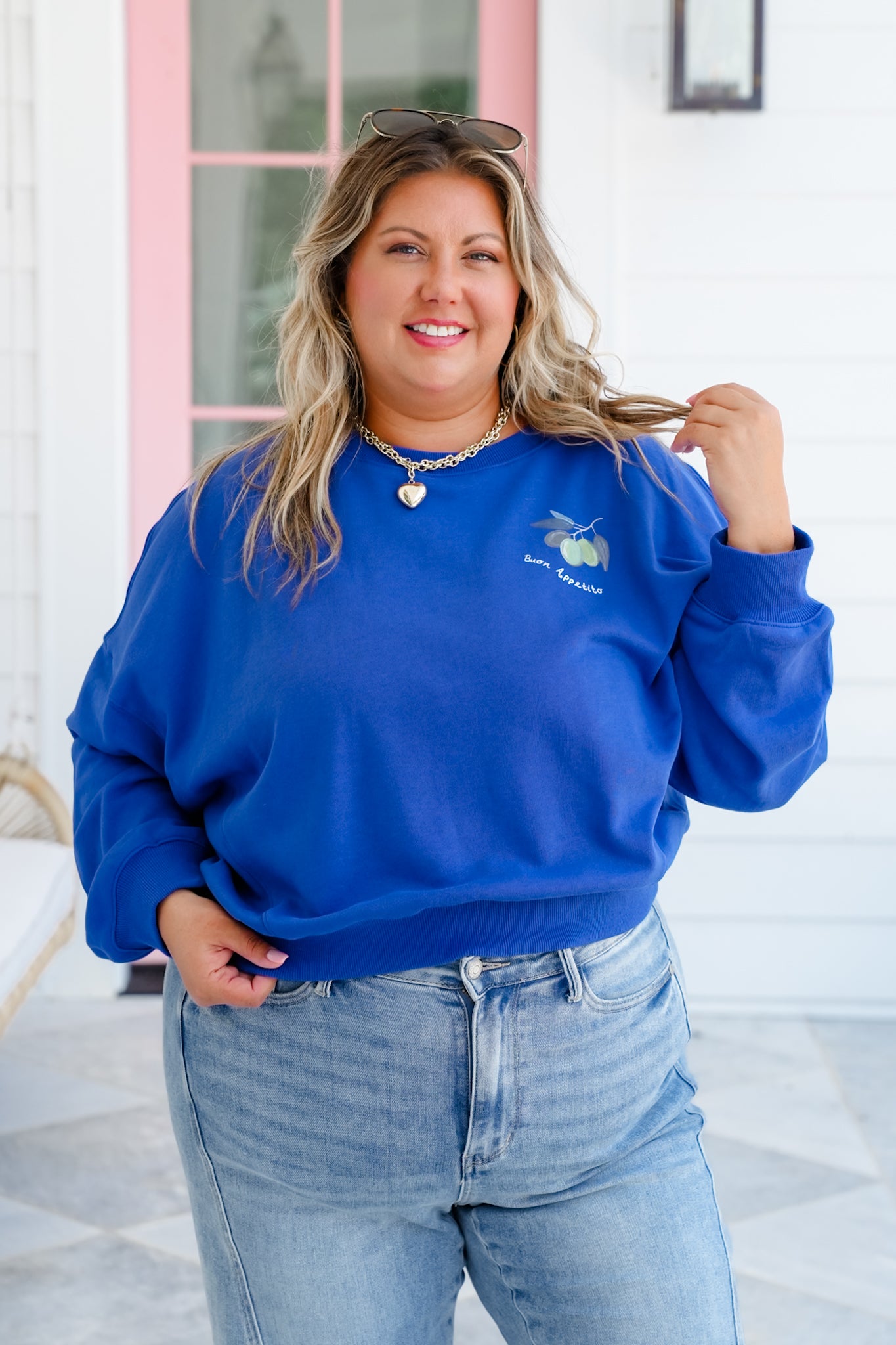 This isn’t just a sweatshirt, it’s a whole vibe. With its classic crew neck and pop of playful foodie art on the back, this cozy piece serves up major charm. Throw it on for your next market run, wine tasting, or that lazy Sunday when you still want to look cute. Try it layered over a striped collared shirt with jeans for a fun Euro-inspired twist, or keep it casual with biker shorts and sneakers.