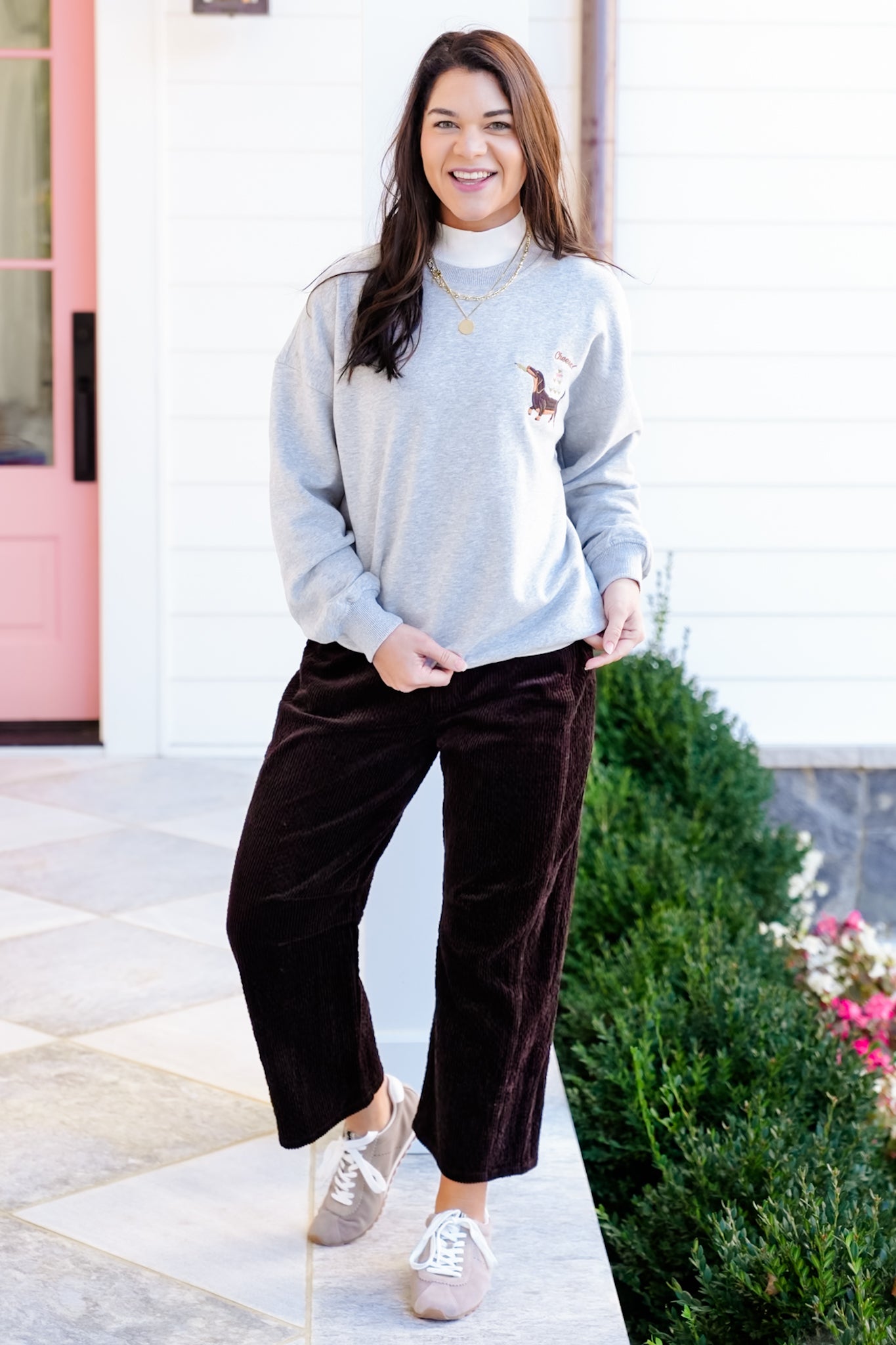 This playful pullover brings instant charm with its adorable embroidered dog sipping a martini, adding a fun twist to your casual lineup. The soft knit feels cozy without being heavy, making it easy to wear solo or layered. Dress it up with dark denim for a cute daytime look or keep it laid-back with leggings and sneakers for weekend errands.