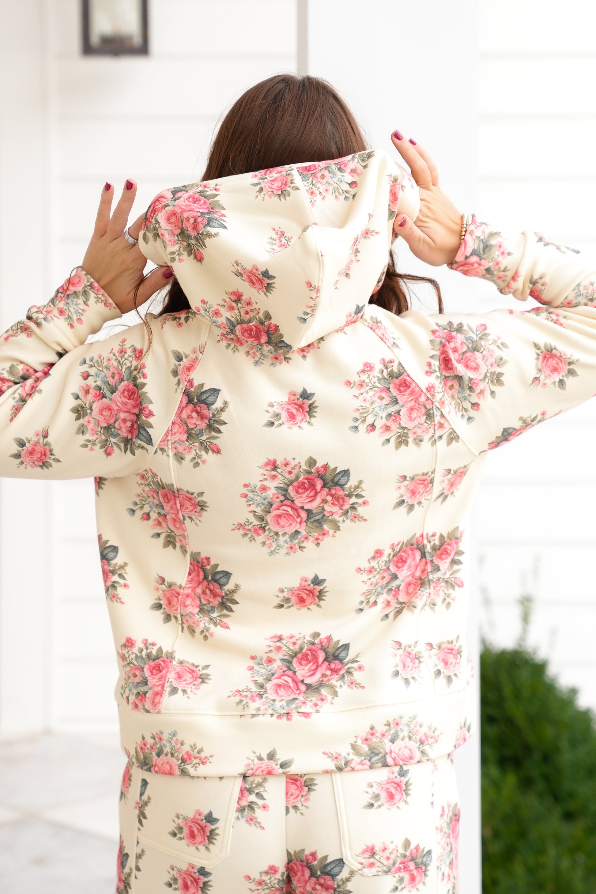 This floral hoodie brings that cozy, feel-good energy the moment you slip it on. The fabric is unbelievably soft, and the roomy shape makes it the kind of piece you’ll reach for on repeat. Pair it with the matching bottoms for a coordinated set that feels instantly styled, or throw it on with joggers and sneakers for a comfy, laid-back look that still feels pulled together.