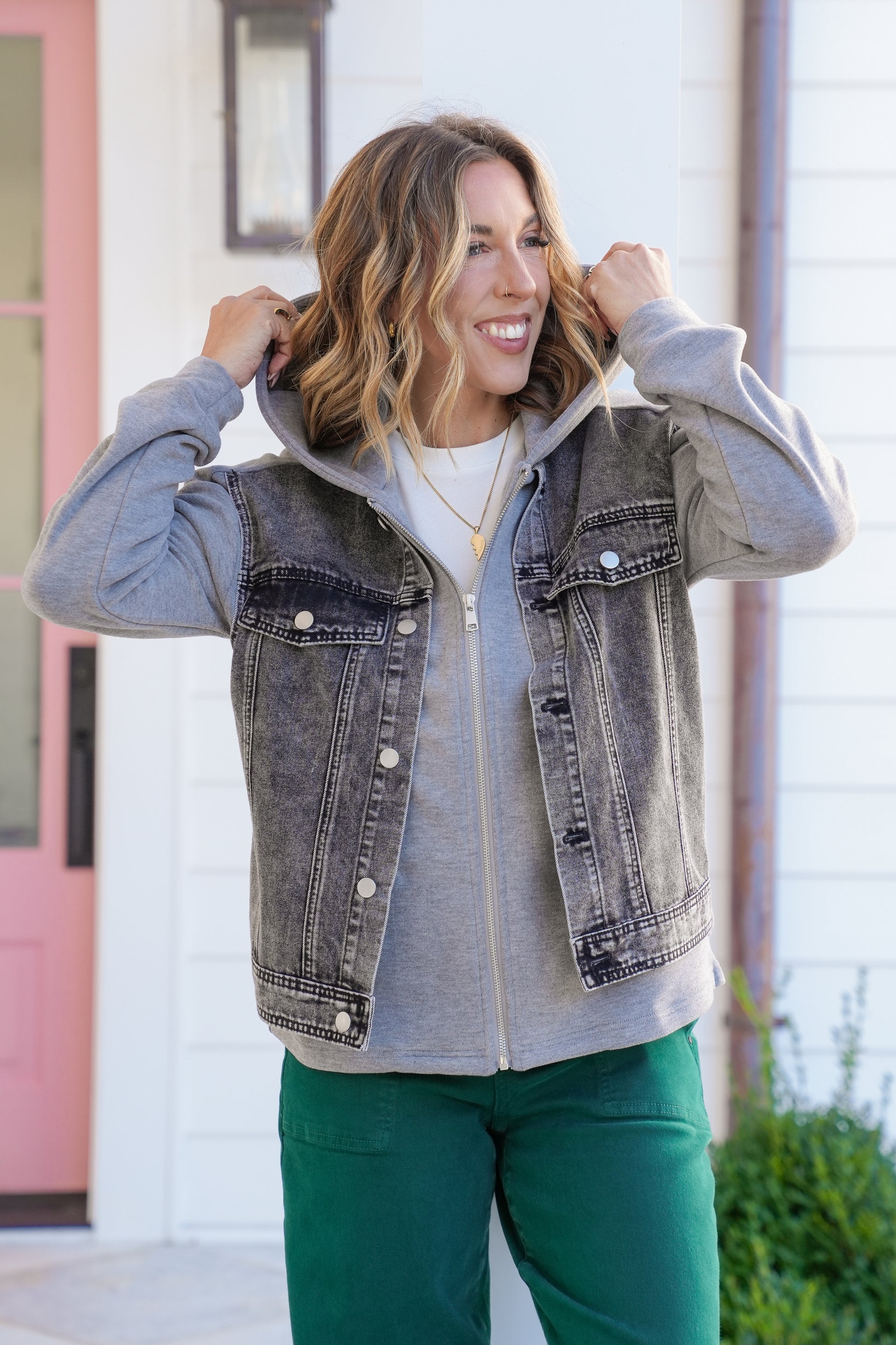 * Two-in-one design: denim jacket front with a soft fleece hoodie body