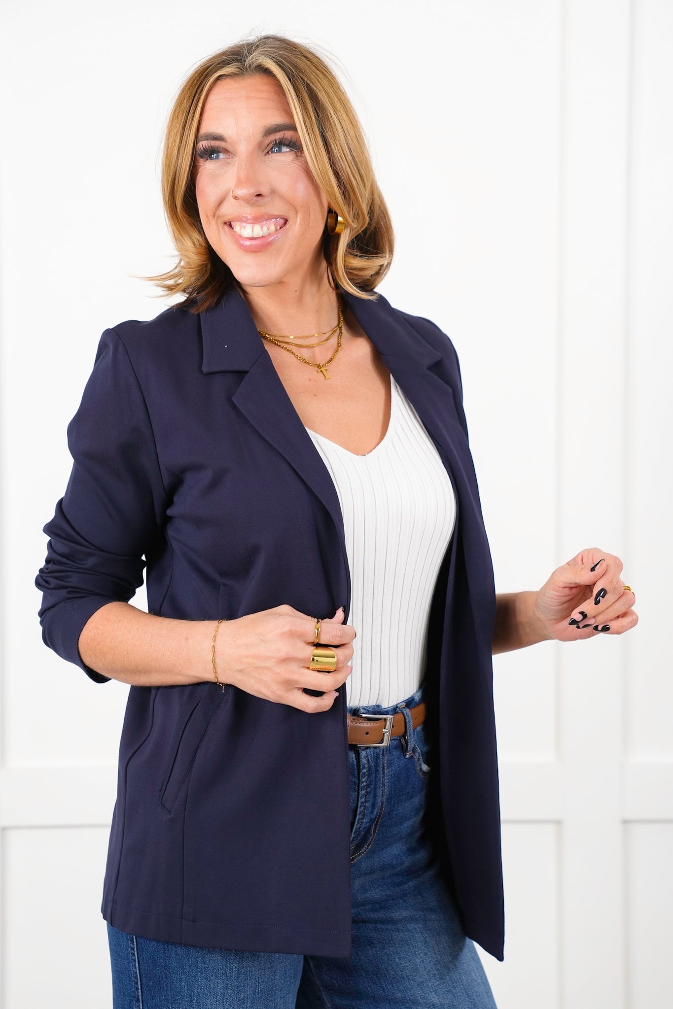 Your shortcut to effortless sophistication. This open-front knit blazer blends structure and stretch, giving you the polish of a classic blazer with the comfort of your favorite cardigan. Designed with a clean lapel, ruched sleeves, and a smooth drape, it elevates everything from jeans to workwear in seconds.